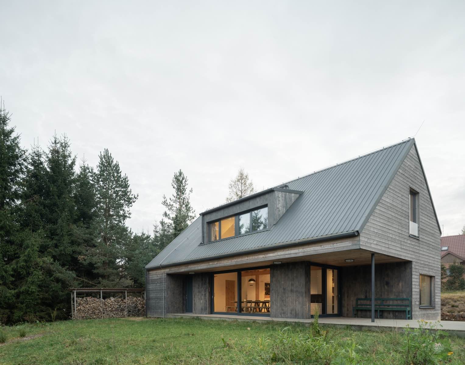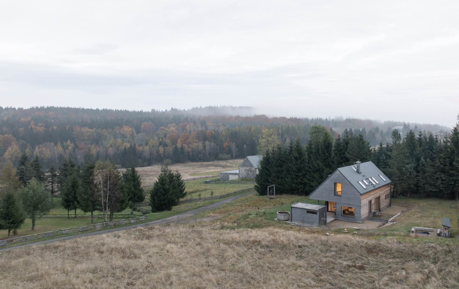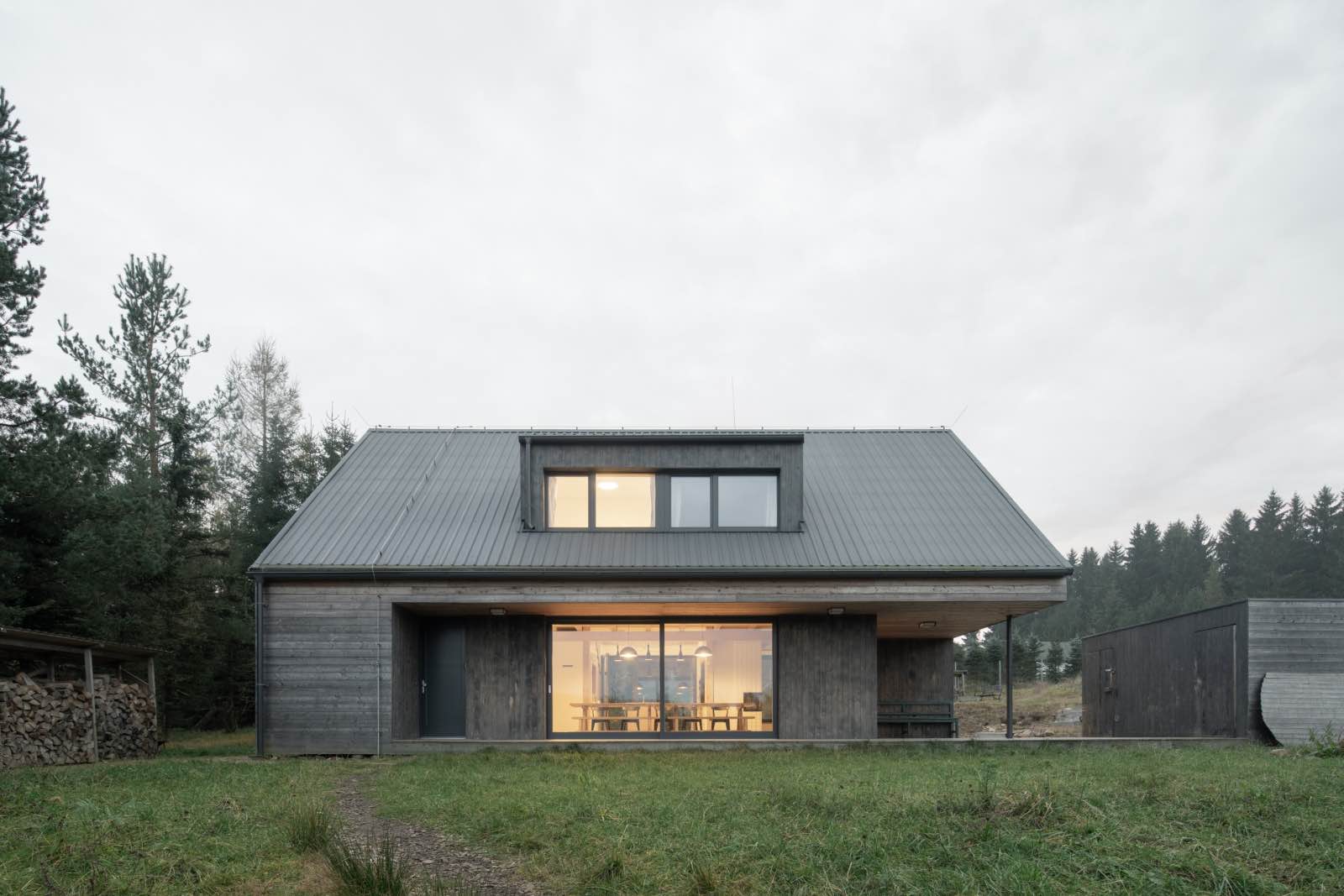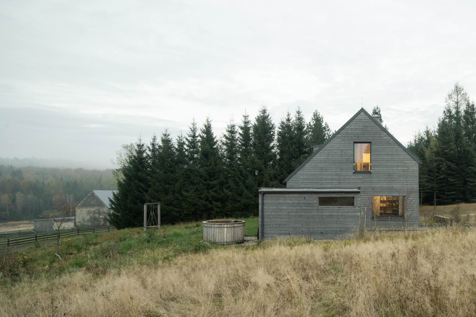 Budynek umieszczono w górnej części działki, a jego bryła i orientacja kalenicy nawiązują do tradycyjnej, rozproszonej zabudowy górskiej. Prosta forma z dachem dwuspadowym odczytywana jest jako współczesna interpretacja archetypu stodoły, dobrze zakorzeniona w regionalnym kontekście. Skala obiektu pozostaje wyważona, a jego sylwetka naturalnie wpisuje się w linię horyzontu.