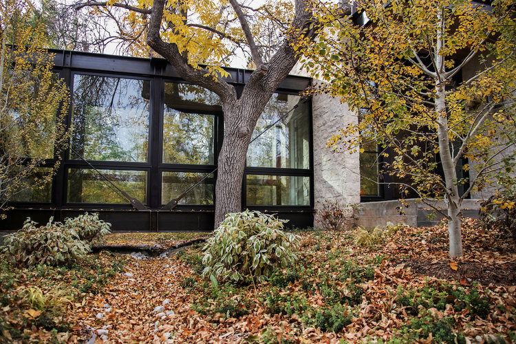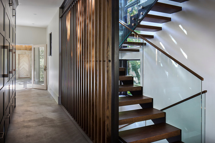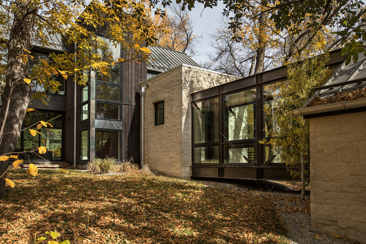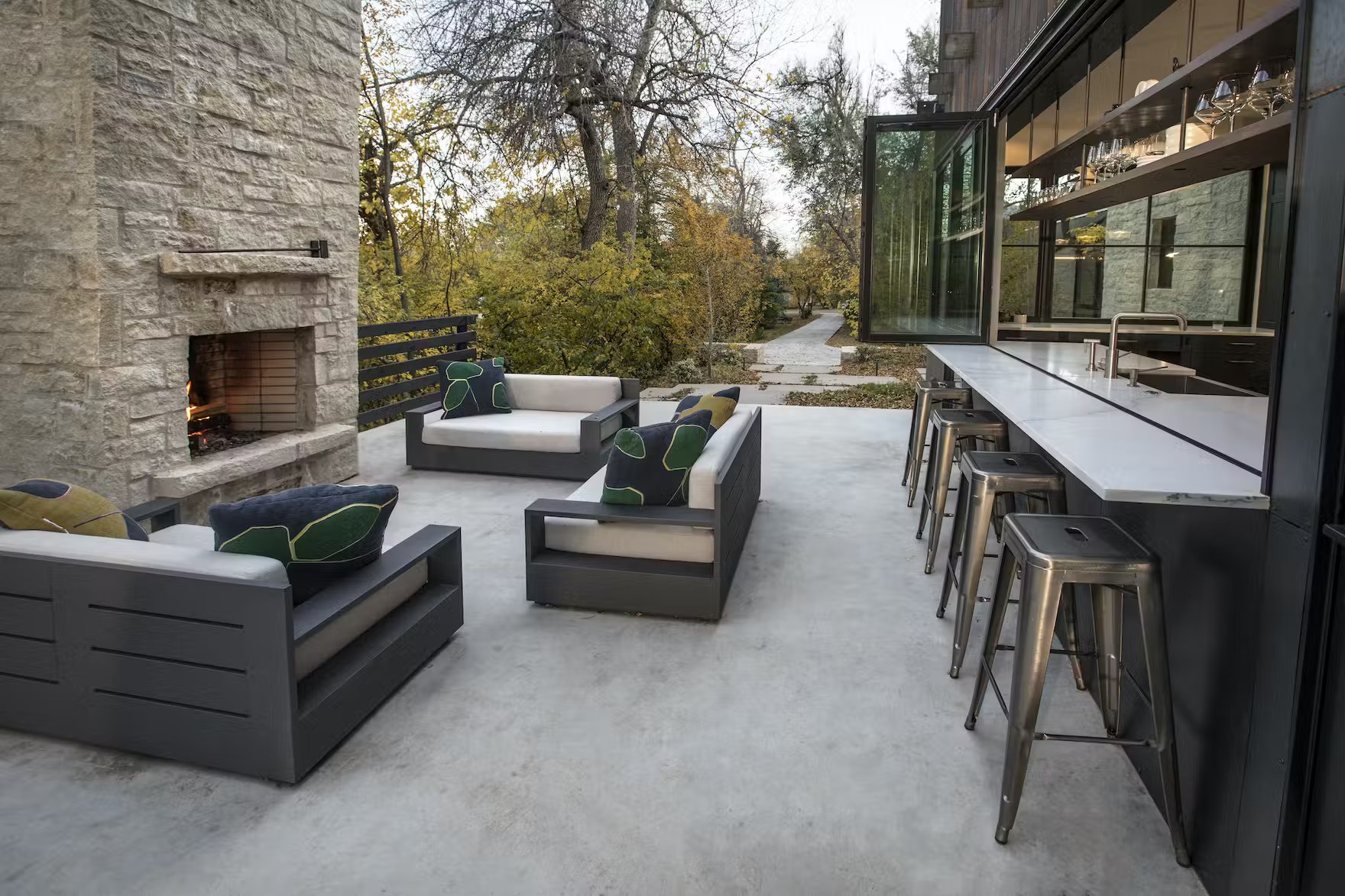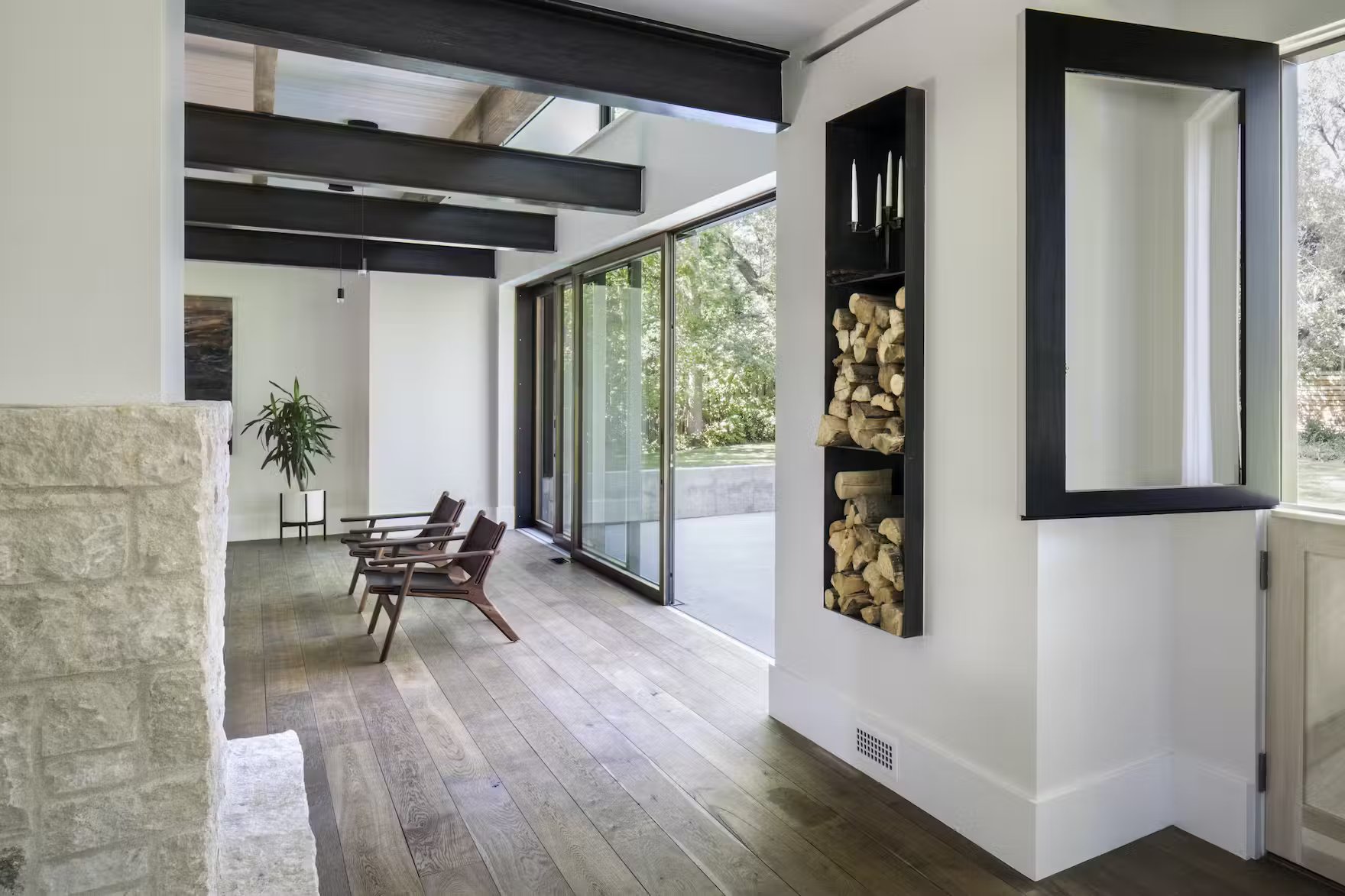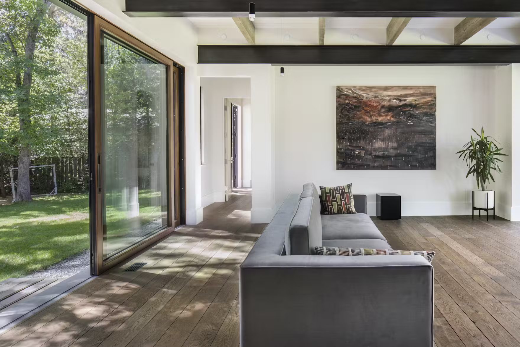 Chickadee jest dwupoziomowy, co zapewnia przestronność i komfort. Dom posiada również dwa zewnętrzne patia, które doskonale łączą wnętrze z naturą. Garaż znajduje się w frontowej części działki, co pozwala na stworzenie przestronnych, otwartych przestrzeni w części mieszkalnej. Przejście między budynkami nie tylko integruje przestrzeń, ale także nie zakłóca przepływu wody w starym rowie. Dom jest zaprojektowany w taki sposób, aby maksymalnie otworzyć go na otaczającą go naturę. Szklane ściany i drzwi przesuwne w salonie pozwalają na swobodny kontakt z otoczeniem, co jest jednym z głównych atutów nowoczesnej stodoły. Dzięki takiemu rozwiązaniu dom staje się integralną częścią przyrody, co daje poczucie przestronności i spokoju.