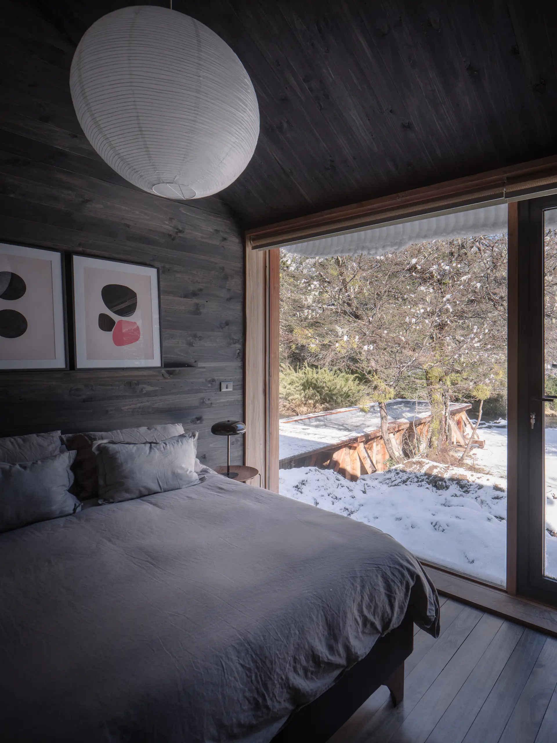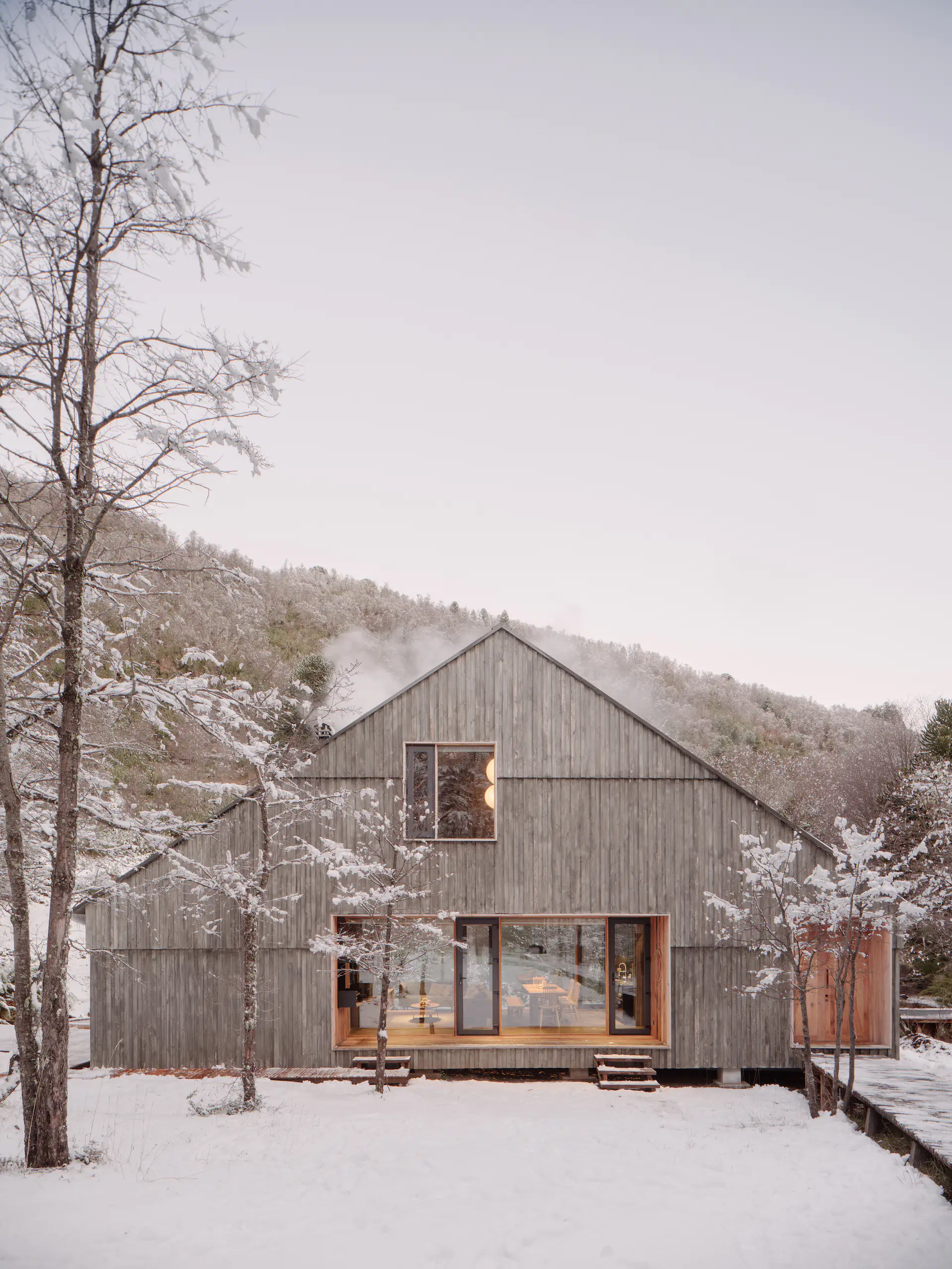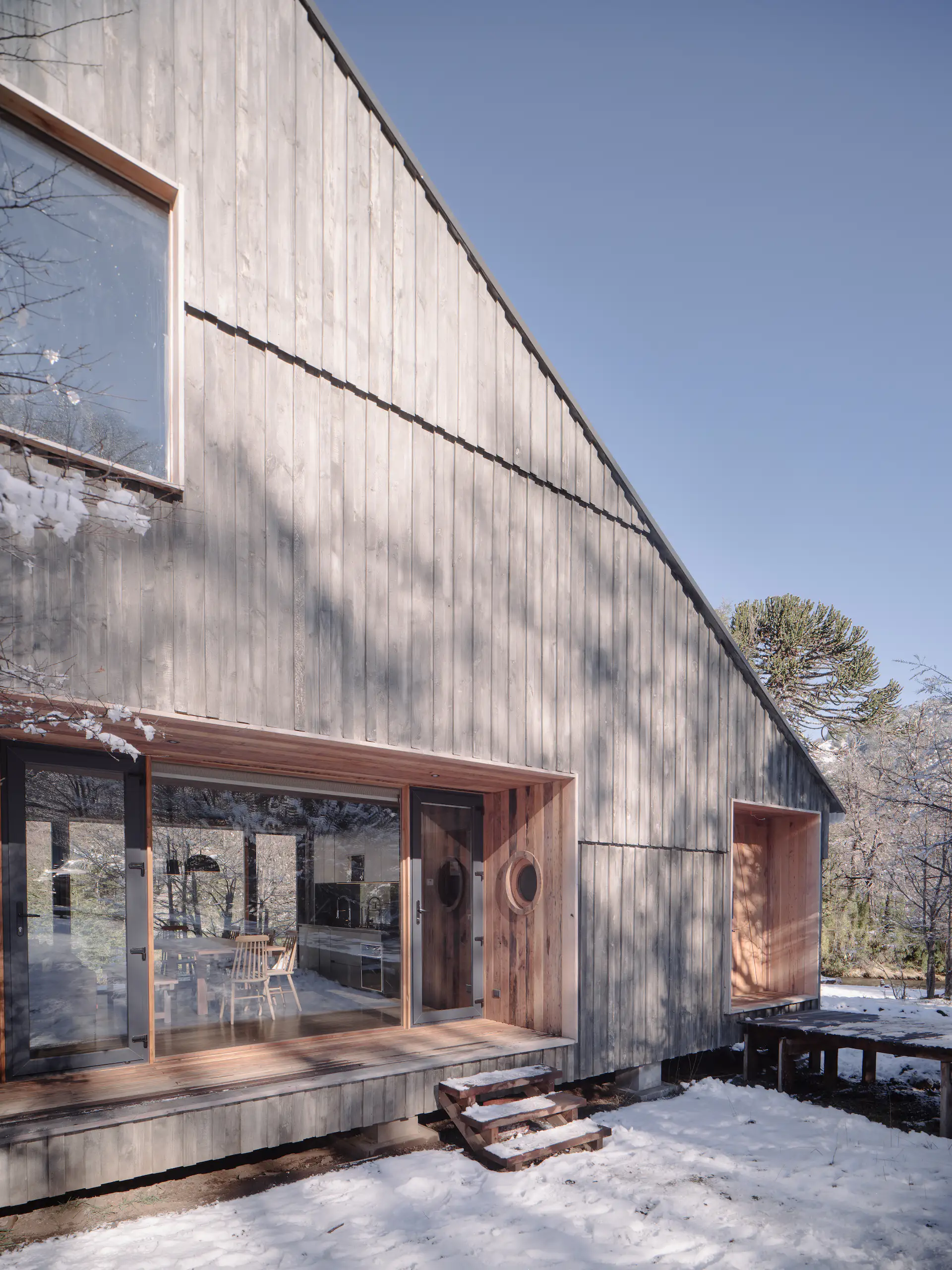 Efektem prac jest nowoczesna stodoła w chilijskim wydaniu – minimalistyczna bryła z dwuspadowym dachem, pokryta sosnowym drewnem, wzniesiona na podwyższonej platformie z widokiem na źródła rzeki Cautín. Projekt respektuje lokalne warunki klimatyczne – elewacja z poziomych warstw drewna chroni przed ulewami i śniegiem, a zintegrowane z bryłą zadaszenia i okna zapewniają schronienie przed wiatrem. Wnętrza domu wykonane zostały z drewna z recyklingu – głównie z dawnej szopy dziadka Viñueli. Ciemne wykończenia – w tym dębowe podłogi i sosnowe ściany – tworzą przytulną atmosferę i wizualny kontrast z jasnym, górskim otoczeniem.