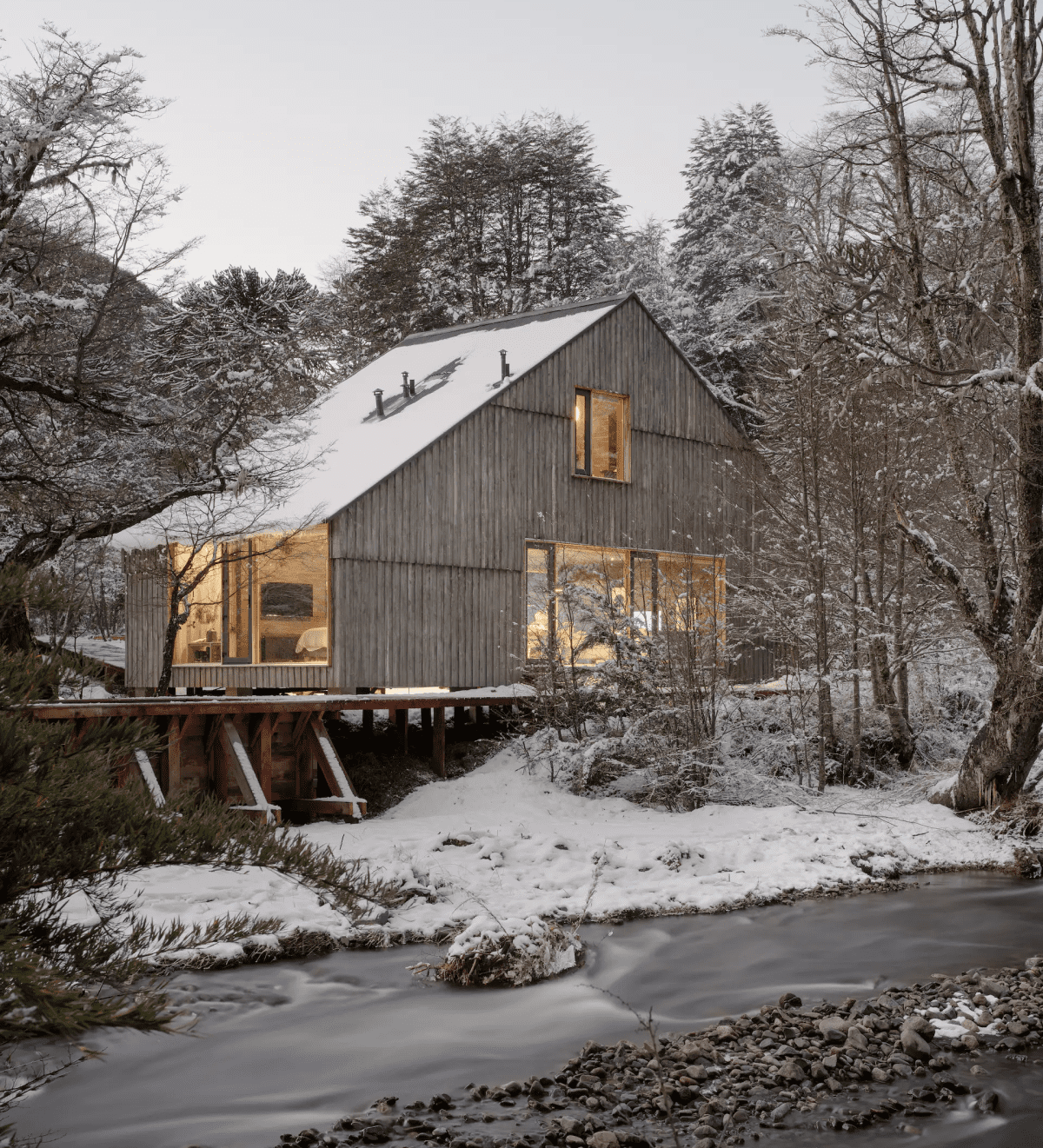 Kiedy Daniel Iragüen, Claudio Viñuela i Alexa Napp z chilijskiego studia Iragüen Viñuela Arquitectos podjęli się projektu w regionie Malalcahuello, ich celem było stworzenie domu wakacyjnego w duchu zrównoważonej architektury. Inwestycja oparta została na wcześniej pozostawionej stalowo-drewnianej platformie, która stała się fundamentem nowej koncepcji – osadzonej głęboko w lokalnym kontekście kulturowym i emocjonalnym. Budynek znajduje się w sercu Andów, w miejscu znanym z turystyki przyrodniczej – od wędkarstwa i trekkingu po narciarstwo. Klient – obecnie mieszkający w Valparaiso – pragnął stworzyć przestrzeń, która łączy ludzi z naturą, a jednocześnie oferuje funkcjonalność przez cały rok.