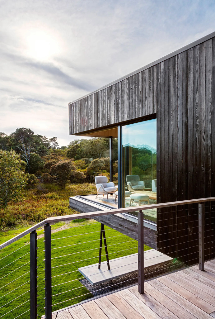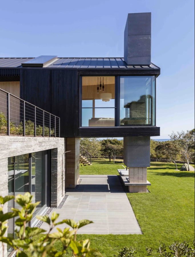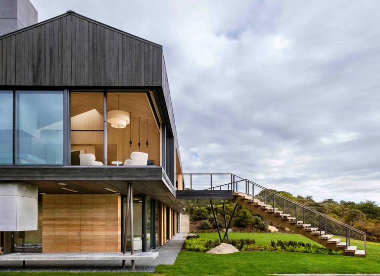 Do ciemnych, surowych w formie brył prowadzi polna droga wijąca się przez gęste zarośla. Główna weranda, skierowana na południe, łączy się z drogą szerokimi schodami, prowadzącymi odwiedzających ku wnętrzu. Dopiero po przekroczeniu progu domu odsłaniają się rozległe widoki na Ocean Atlantycki, podkreślające kontrolowaną dramaturgię przestrzenną projektu. Wejściowy dziedziniec od północnego zachodu został otoczony zwęgloną cedrową elewacją, w której rozmieszczono nieregularne otwory. Dzięki temu powstał prywatny dziedziniec zorientowany na zachód – z widokiem na falujące pola i tradycyjne kamienne ogrodzenia, które podkreślają wiejski charakter miejsca.