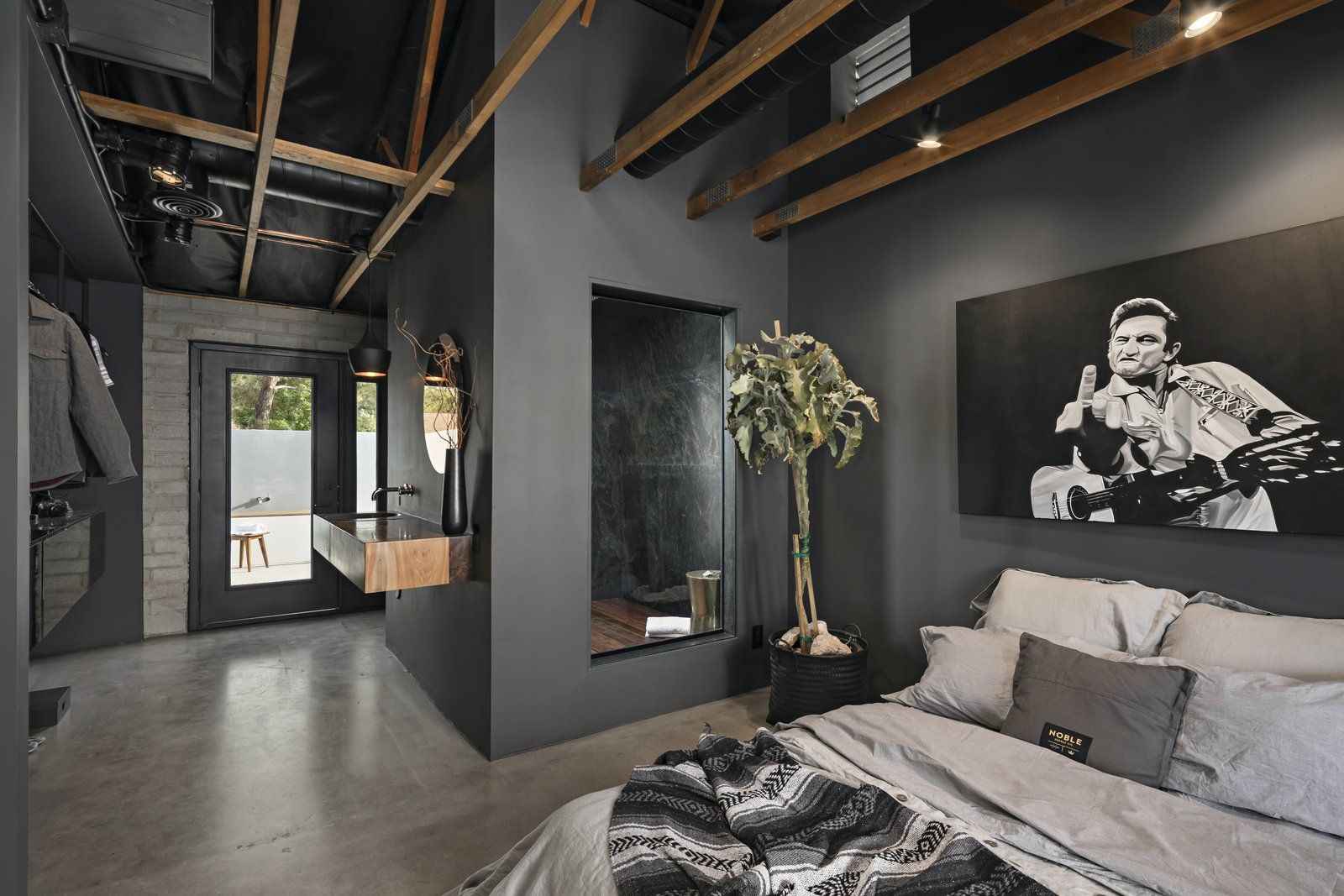Sypialnia główna oddzielona została półścianką, nad którą zastosowano szklaną taflę sięgającą sufitu – rozwiązanie to zapewnia wizualną lekkość i subtelne oddzielenie stref prywatnych. Amy Beaumont zdecydowała się zachować oryginalne ceglane mury i podłogi, malując jednocześnie wszystkie ściany z regipsów na czarno. Czarne akcenty pojawiają się również w kuchni, na zabudowie meblowej, ladach, urządzeniach, sufitach oraz detalach tarasu dachowego, tworząc spójną i rytmiczną kompozycję. Starannie dobrane dodatki i meble wprowadzają do wnętrza ciepło, dzięki czemu surowa estetyka pozostaje komfortowa. Odnowiony dom dostępny jest obecnie w cenie 344 900 dolarów.