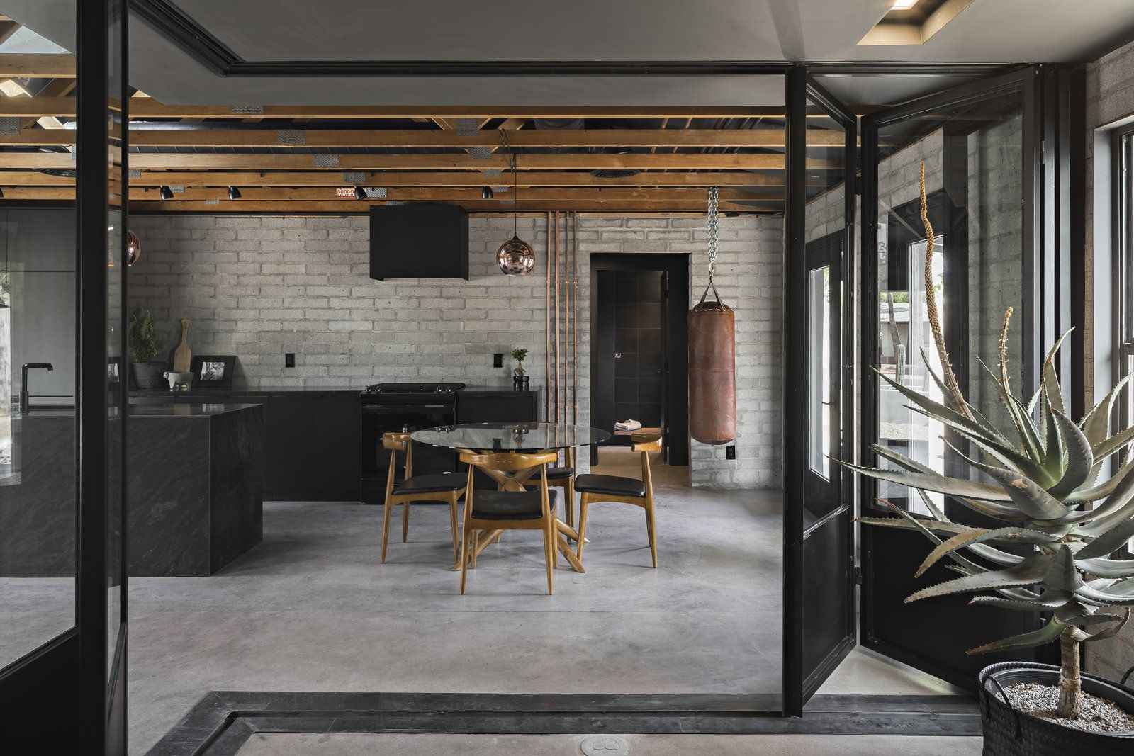 Za renowację budynku z 1964 roku odpowiada firma Knob Modern pod kierownictwem Amy Beaumont. Z typowego domu stworzono funkcjonalną przestrzeń mieszkalną z dwiema sypialniami i dwiema łazienkami, o łącznej powierzchni około 90 m². Kluczowym etapem modernizacji było całkowite oczyszczenie wnętrza oraz pozostawienie odsłoniętych belek sufitowych, co znacząco zwiększyło poczucie przestronności. Druga sypialnia została wyposażona w wykonane na zamówienie stalowo-szklane, składane drzwi, które po otwarciu powiększają główną strefę salonu, podkreślając elastyczność układu wnętrza.