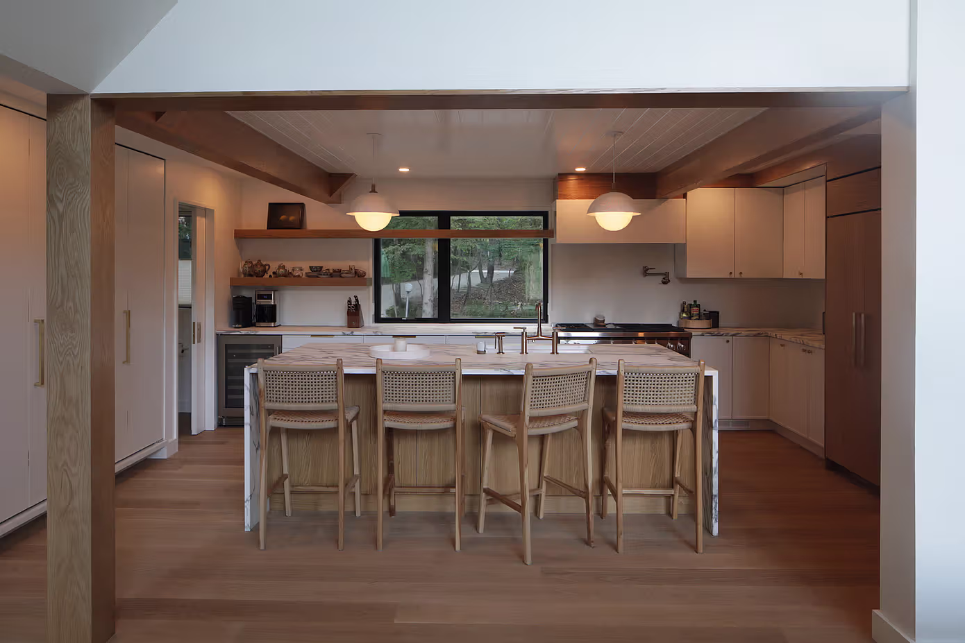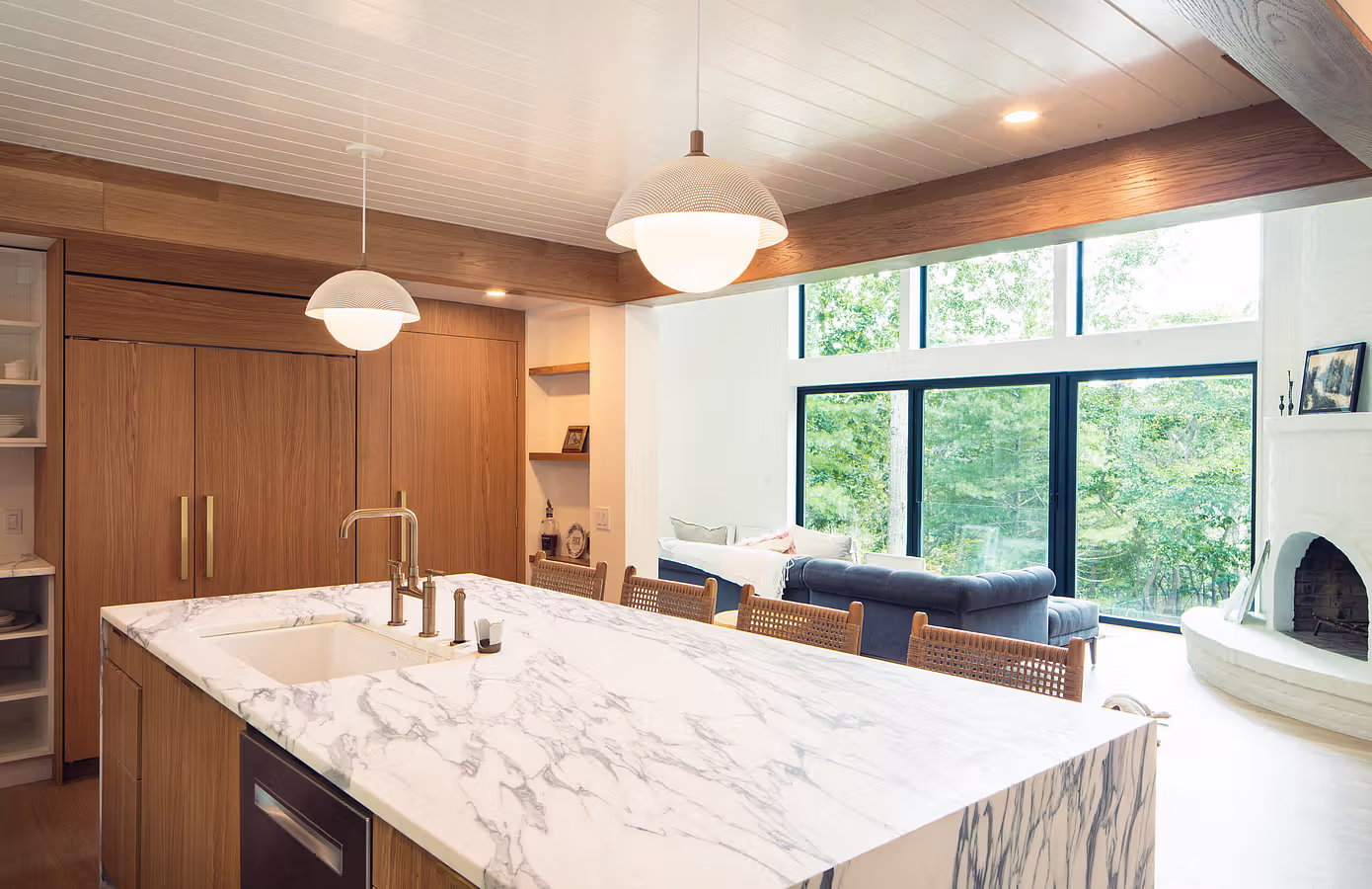 Po wejściu do środka uwagę przyciąga otwarta, jasna przestrzeń dzienna, której centrum stanowi duża wyspa kuchenna z marmurowym blatem. To serce domu, łączące funkcje kulinarne, towarzyskie i reprezentacyjne. Ciepłe odcienie drewna – obecne w zabudowie, sufitach i detalach – tworzą atmosferę przytulności, podczas gdy minimalistyczne formy i oszczędna paleta barw nadają wnętrzom współczesny charakter. Przestrzeń wypełnia naturalne światło przesączające się przez duże okna, które kadrują widoki na otaczający dom zagajnik.
