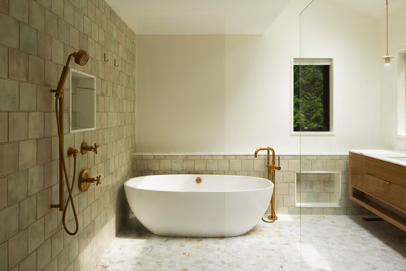 Łazienka na piętrze, zaprojektowana jak prywatne spa, podkreśla dwoisty charakter domu – rustykalny w klimacie, a jednocześnie nowocześnie dopracowany. Wolnostojąca wanna stanowi centralny element kompozycji, uzupełnionej eleganckimi płytami ceramicznymi i mosiężnymi detalami. Przeszklona strefa prysznicowa, starannie dobrane materiały i dopracowane oświetlenie nadają przestrzeni wyciszający, luksusowy charakter. To miejsce zaprojektowane z myślą o codziennym odpoczynku i regeneracji.