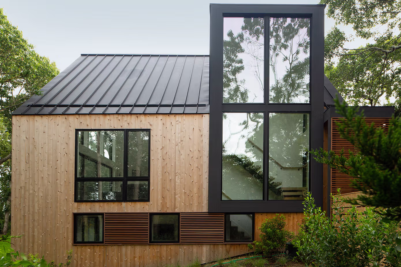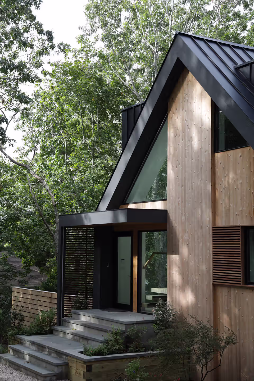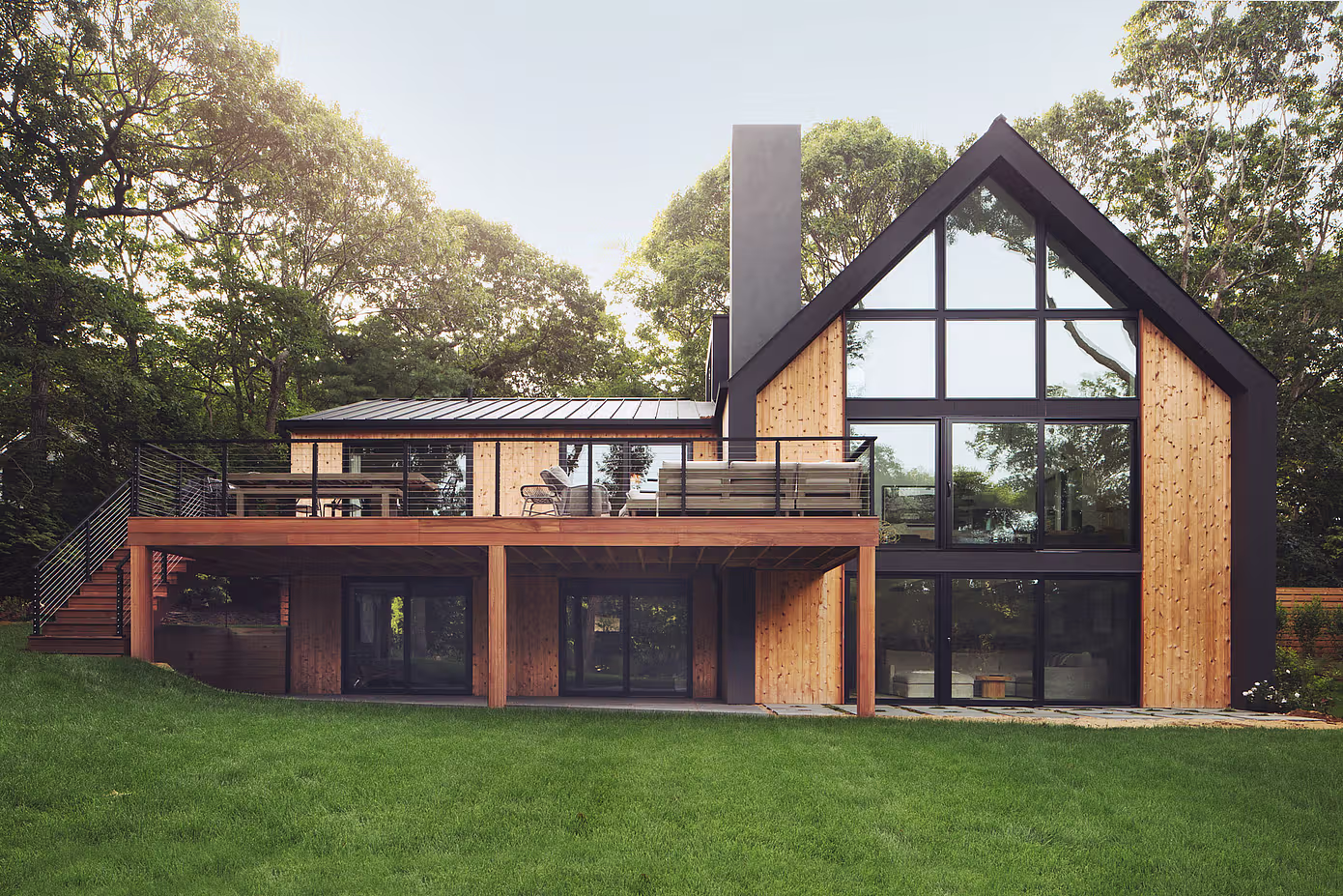 W malowniczym zagajniku dębów, nieopodal Nowego Jorku, powstała niezwykła realizacja Martin Architects. Clearwater House, ukończony w 2021 roku, stanowi starannie przeprowadzoną modernizację domu inspirowanego architekturą lat 70. Projekt łączy w sobie ducha tamtej epoki z wyrafinowaną współczesną estetyką, tworząc przestrzeń idealną do życia w rytmie nadmorskiej natury. Budynek, osadzony w łagodnie falującym terenie, zachowuje rustykalny charakter pierwotnej konstrukcji, wzbogacony o nowe elementy dachowe i przemyślane otwarcia widokowe.