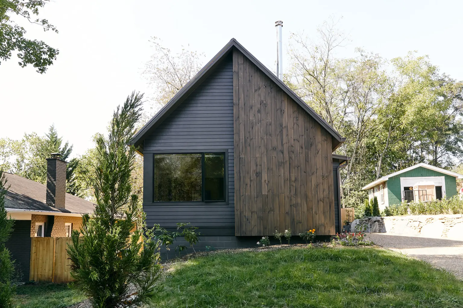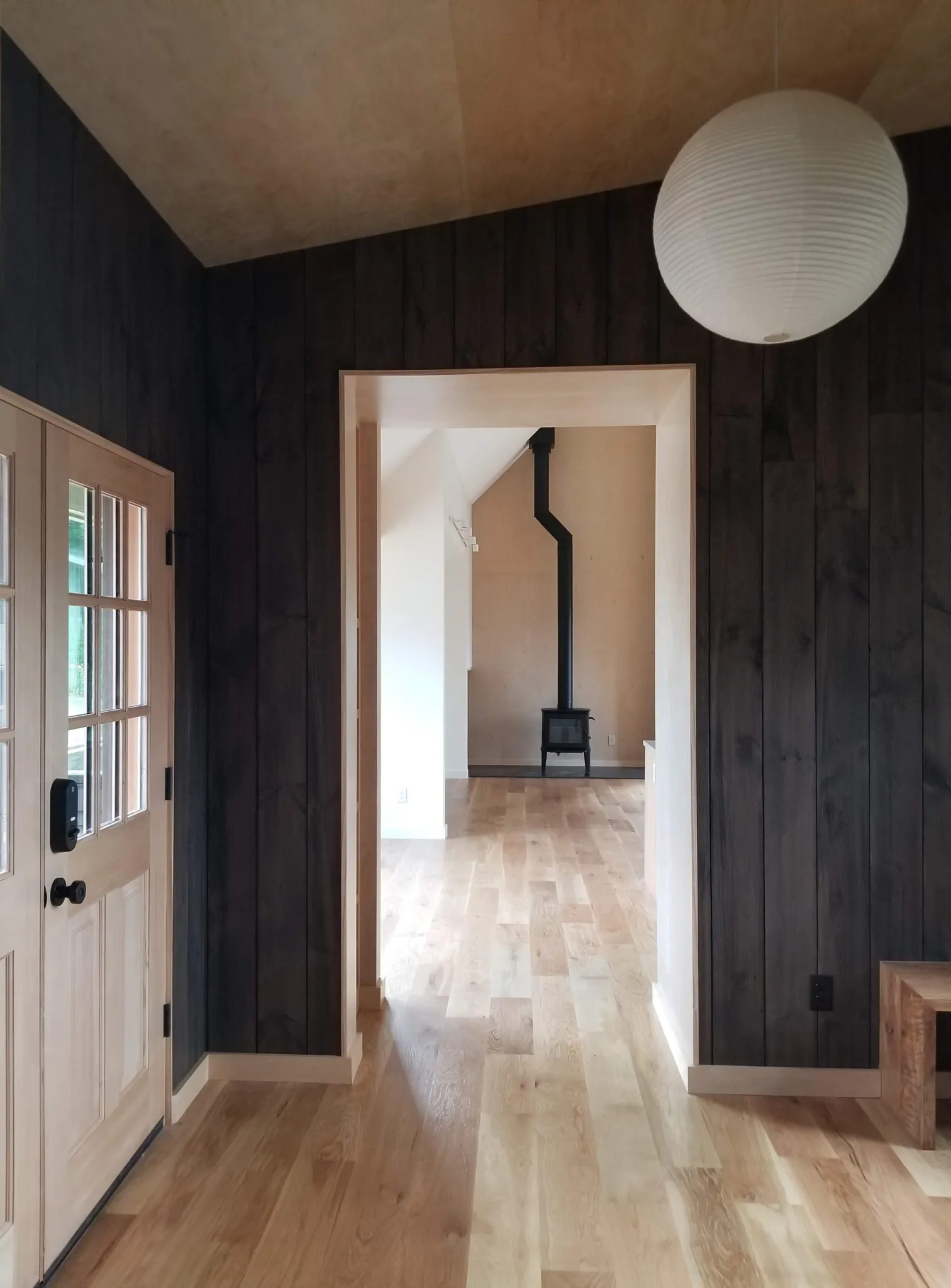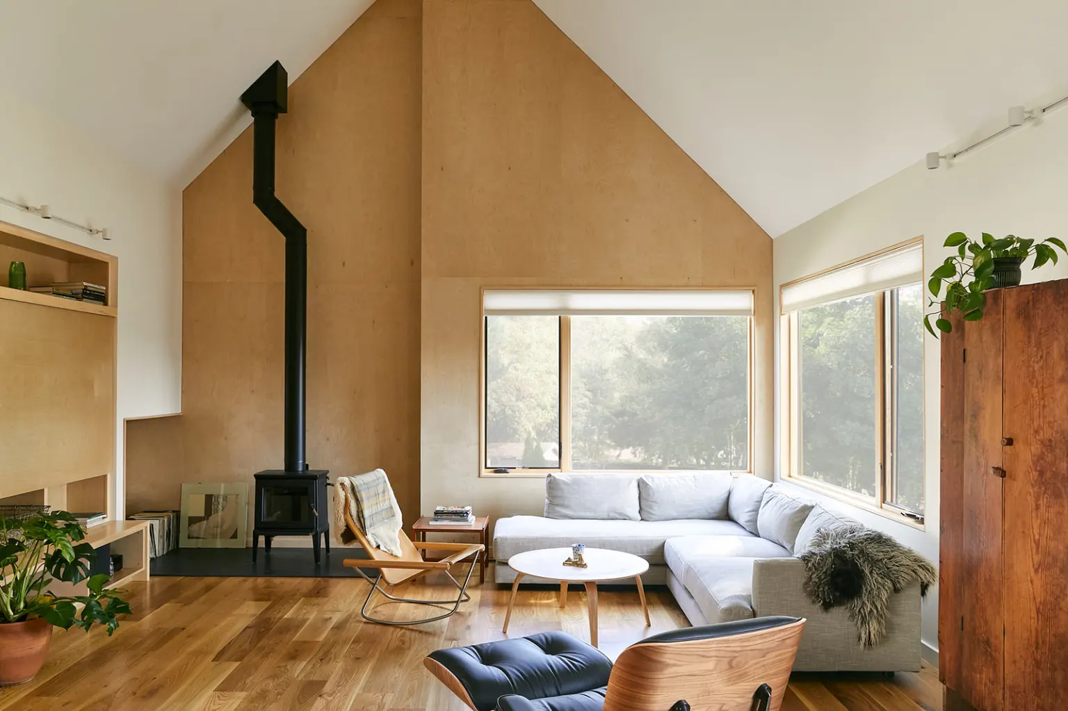 Główne wejście znajduje się pomiędzy dwiema kabinami. Od strony ulicy znajduje się jednopiętrowa fasada, stanowiąca uderzające połączenie pionowych i poziomych paneli drewnianych aż do środka. W tej bryle wyznaczone obszary socjalne – salon, kuchnia i jadalnia – ustawiono na tle naturalnie wykończonych drewnianych ścian i sufitów. W kuchni szafki z białego dębu łączą się z brzozowymi ścianami i dębowymi podłogami, tworząc funkcjonalne i estetyczne miejsce do pracy. Przestrzeń uzupełnia piec opalany drewnem, współczesne meble i wbudowana szafka na media.