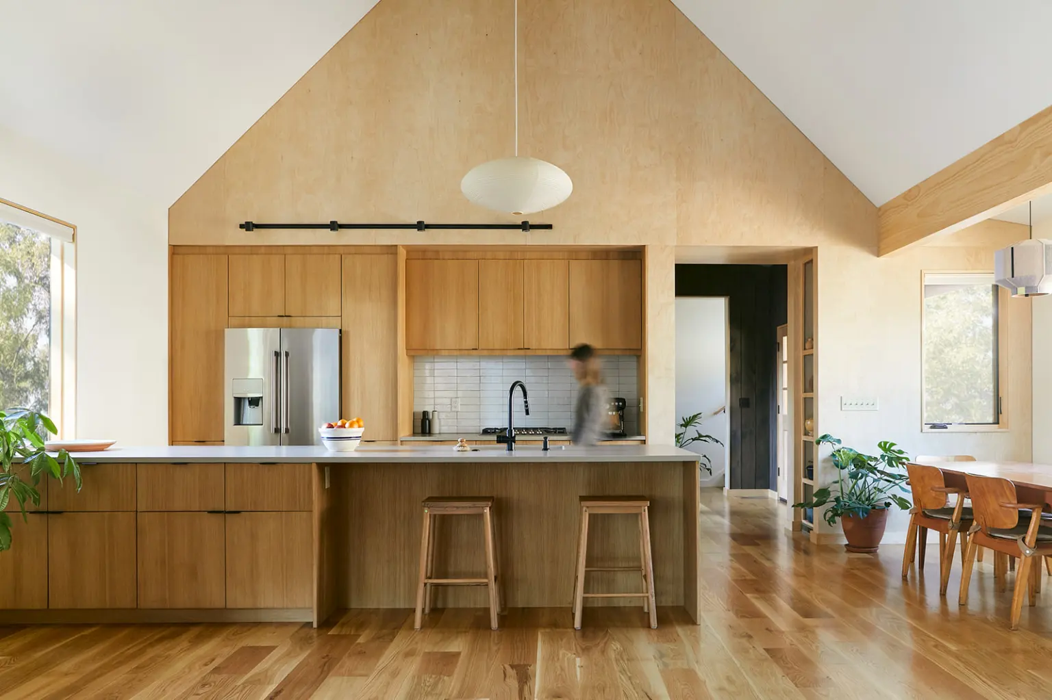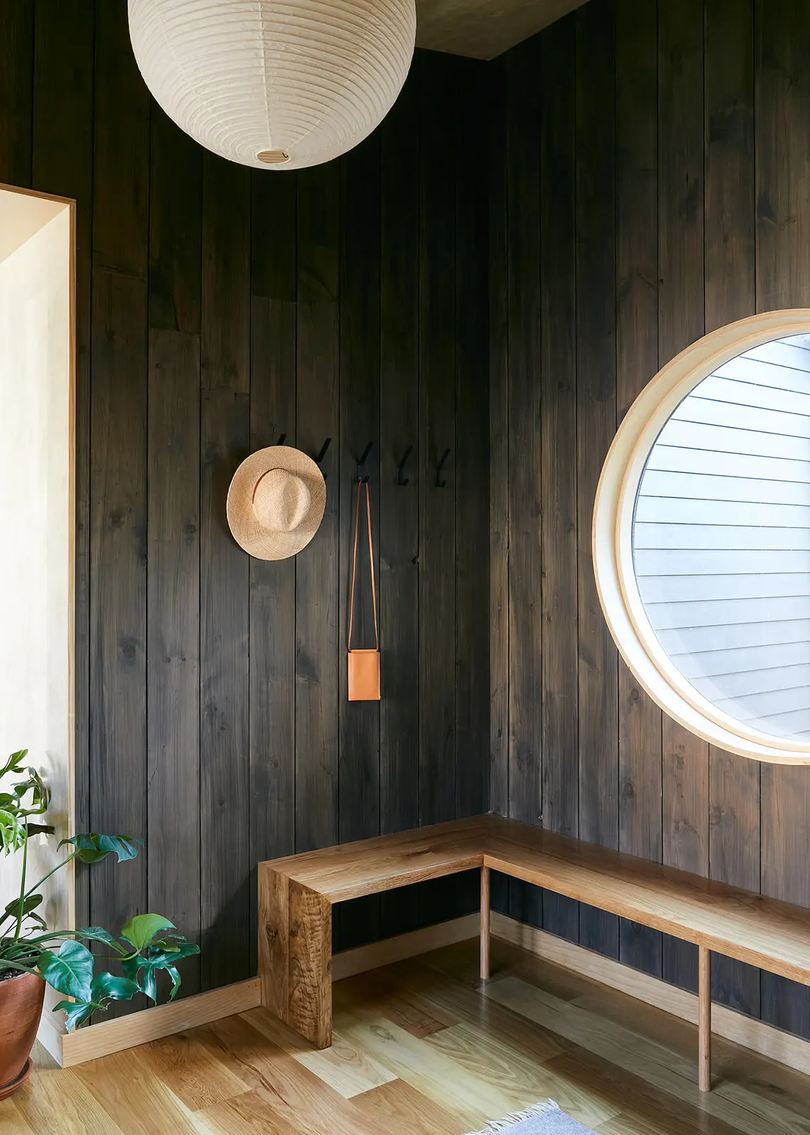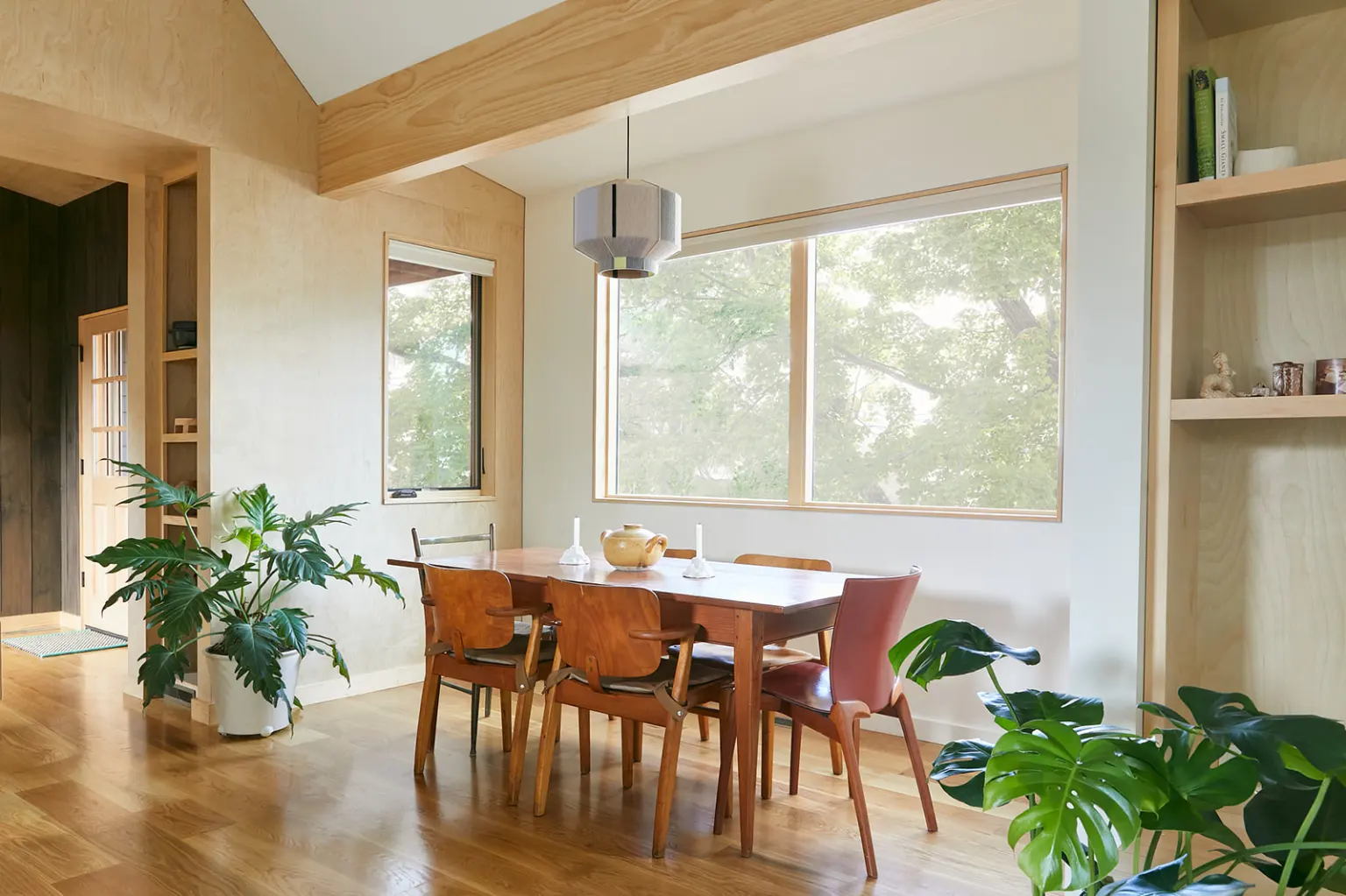 Główne wejście znajduje się pomiędzy dwiema kabinami. Od strony ulicy znajduje się jednopiętrowa fasada, stanowiąca uderzające połączenie pionowych i poziomych paneli drewnianych aż do środka. W tej bryle wyznaczone obszary socjalne – salon, kuchnia i jadalnia – ustawiono na tle naturalnie wykończonych drewnianych ścian i sufitów. W kuchni szafki z białego dębu łączą się z brzozowymi ścianami i dębowymi podłogami, tworząc funkcjonalne i estetyczne miejsce do pracy. Przestrzeń uzupełnia piec opalany drewnem, współczesne meble i wbudowana szafka na media.