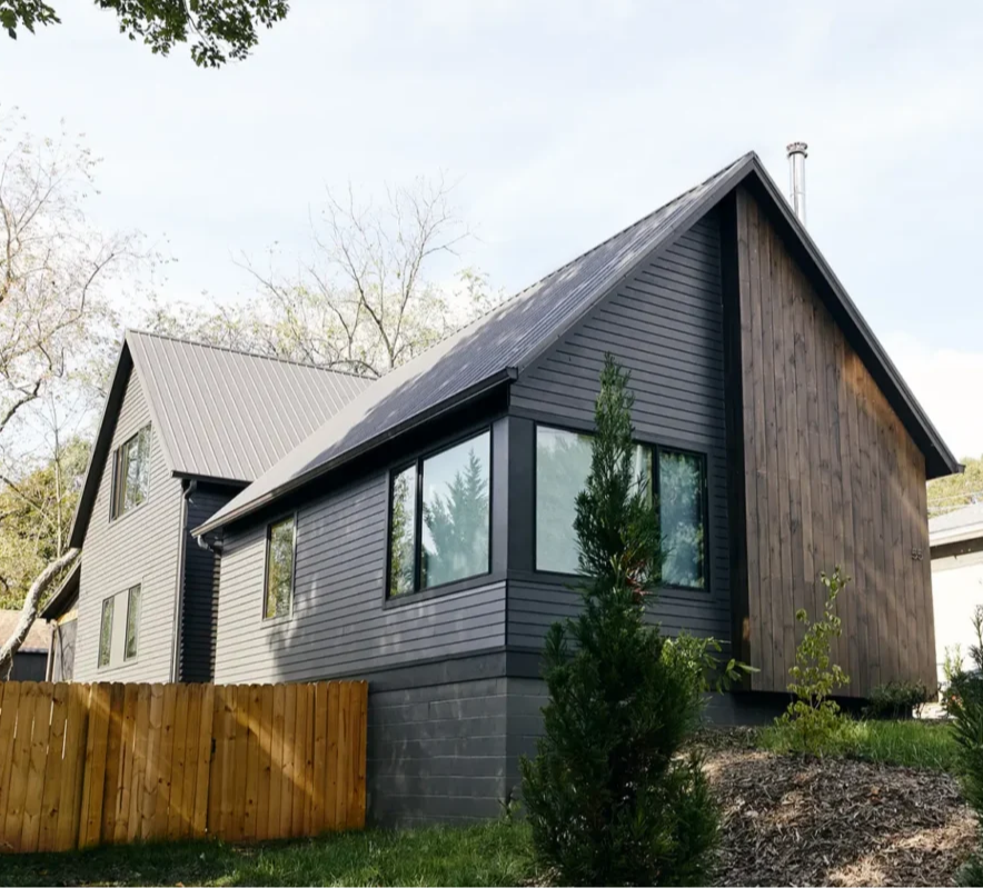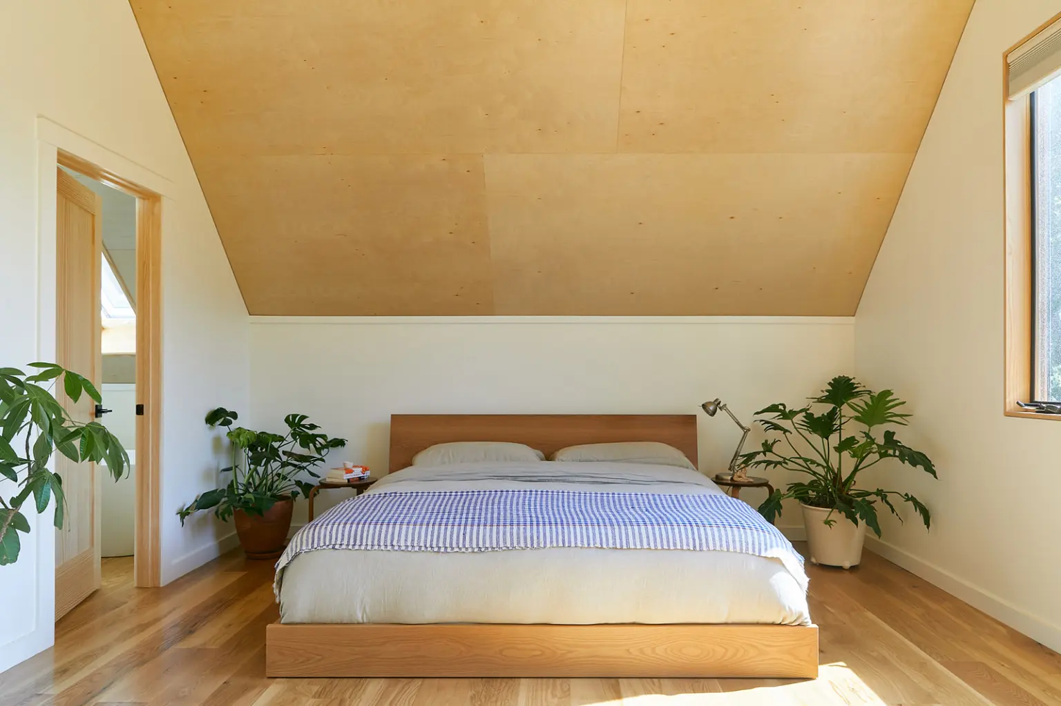 Sypialnie, łazienki, biuro i pralnia znajdują się w dwupiętrowej tylnej kabinie. Tutaj, w przeciwieństwie do części dziennej, we wnętrzach dominują ściany z ciemnego drewna. Dodanie świetlików dodało do pomieszczeń dopływ naturalnego światła. „Uwielbiamy czyste linie i przemyślaną kompozycję modernizmu, ale nie chcieliśmy, aby dom wydawał się zimny i sterylny” stwierdziło studio. Każdy szczegół został starannie zaplanowany, aby stworzyć nowoczesny dom pełen prawdziwego ciepła i gościnności.