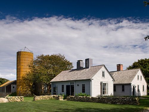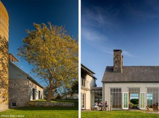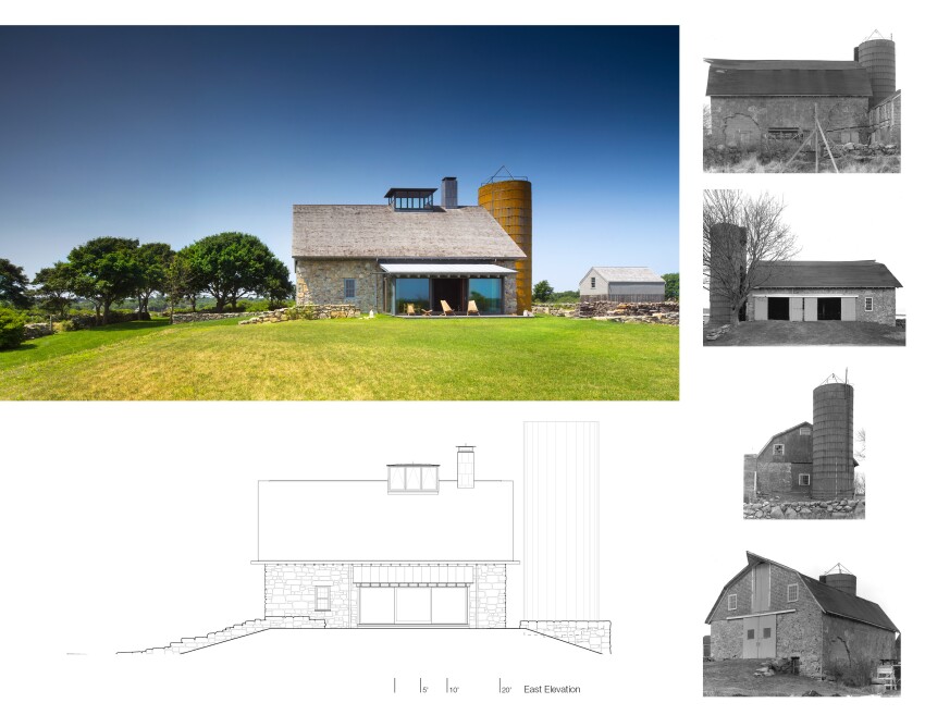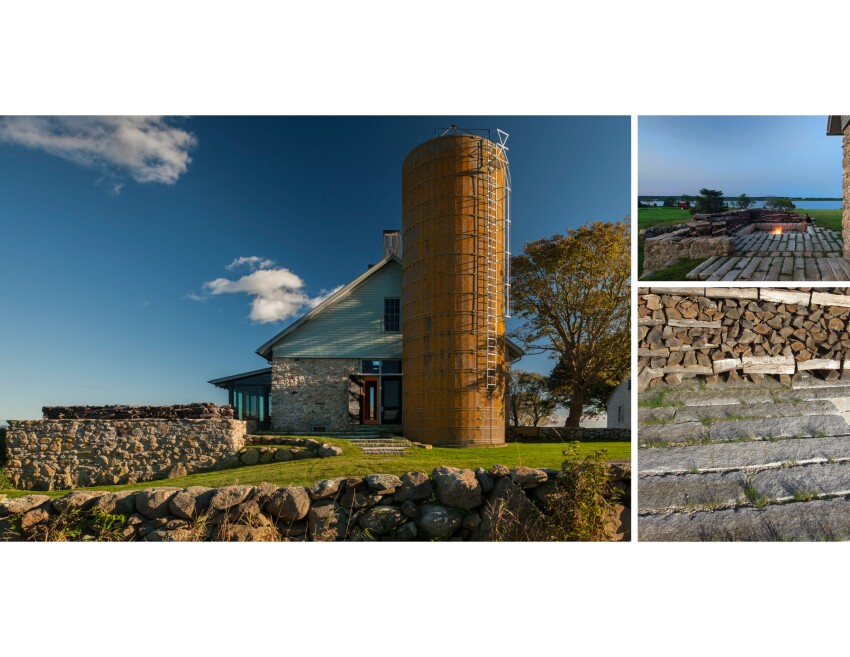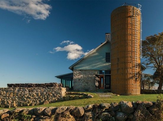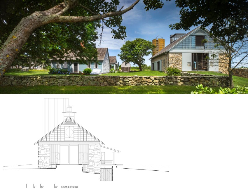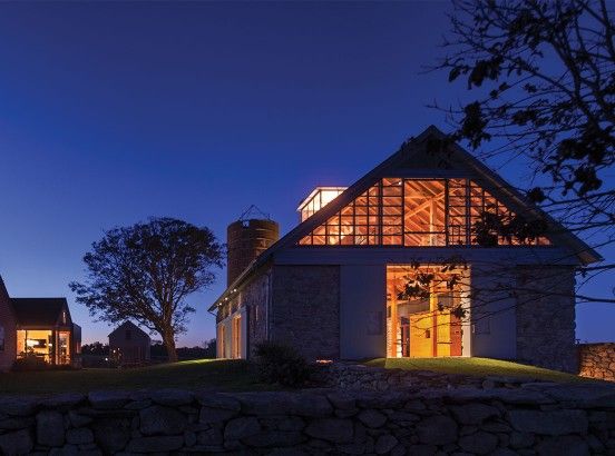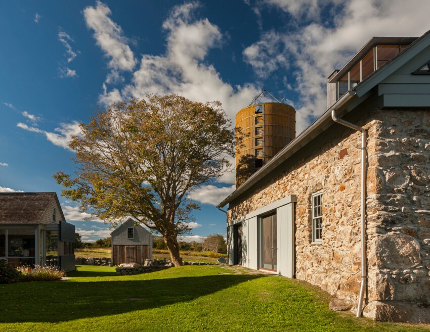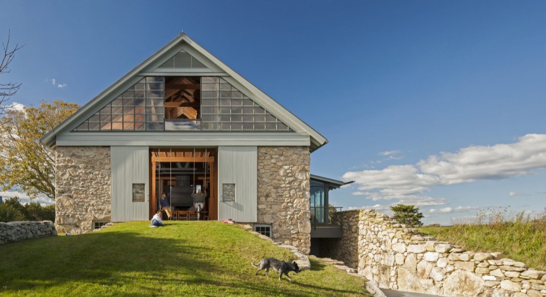 Kamienna stodoła usytuowana w najwyższym punkcie farmy stanowi doskonały przykład adaptacji tradycyjnej architektury do nowoczesnych standardów. Początkowo pełniła funkcję bank barn, doskonale wpasowując się w nierówny krajobraz działki. Z biegiem lat, po kilku zmianach właścicieli i przeprowadzonych renowacjach, oryginalne, drewniane elementy konstrukcyjne praktycznie uległy zniszczeniu. Mimo to, kamienne ściany pozostały w dobrym stanie, a ich patynowa powierzchnia z pięknymi odcieniami żółtej ochry nadawała budynkowi niepowtarzalny charakter.