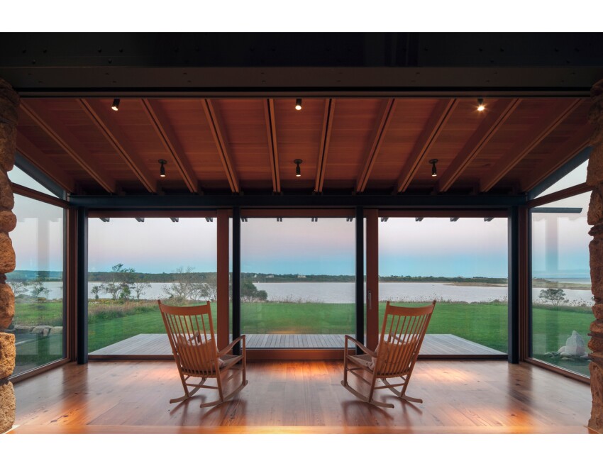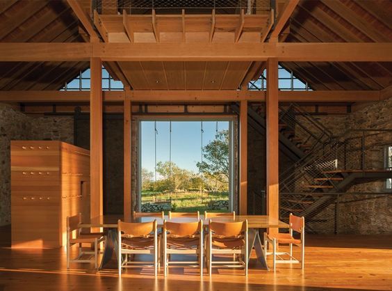 Na strych prowadzą nowe schody, które łączą wschodnią część budynku z dużą przestrzenią. Po części drewnianych ścianach nie pozostał ślad – zostały one zastąpione przez szklane płyty wykonane na miarę i umieszczone w lekkich stalowych futrynach, co otworzyło wnętrze na widoki i wpuściło ogromne ilości naturalnego światła, podkreślając nowoczesną stodołę jako perfekcyjnie zharmonizowaną przestrzeń łączącą tradycję z nowoczesnością.
