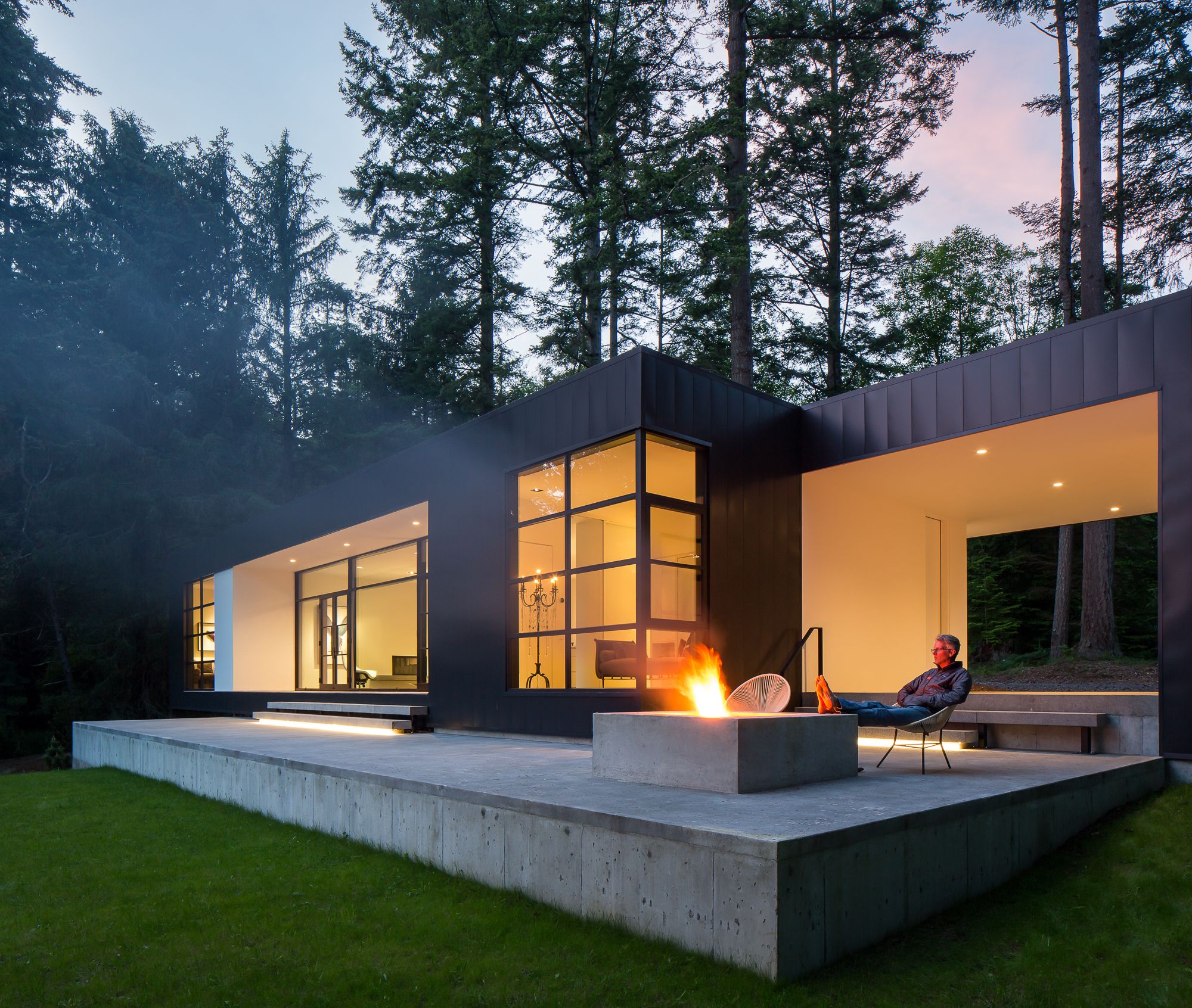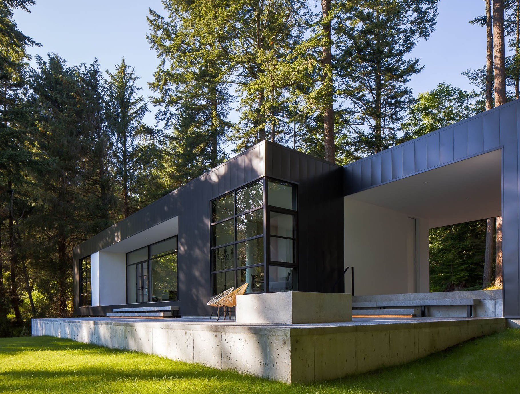 Dom powstał na szczycie stromego wzgórza na wyspie Orcas w stanie Waszyngton, w miejscu oferującym spektakularne widoki na wodę od strony południowo-zachodniej oraz mokradła i lasy po stronie północno-wschodniej. Główna przestrzeń dzienna została umieszczona pomiędzy dwoma skrzydłami z apartamentami, co wzmacnia oś widokową woda–las i podkreśla horyzontalny charakter bryły. Zadaszony parking płynnie przechodzi w rozległą przestrzeń zewnętrzną, pełniącą funkcję tarasu użytkowego, natomiast niżej położony taras z paleniskiem tworzy idealne miejsce do letniego wypoczynku. Całość wpisuje się w estetykę, jaką często określa się dziś jako nowoczesna stodoła, choć w bardzo abstrakcyjnym, minimalistycznym wydaniu.