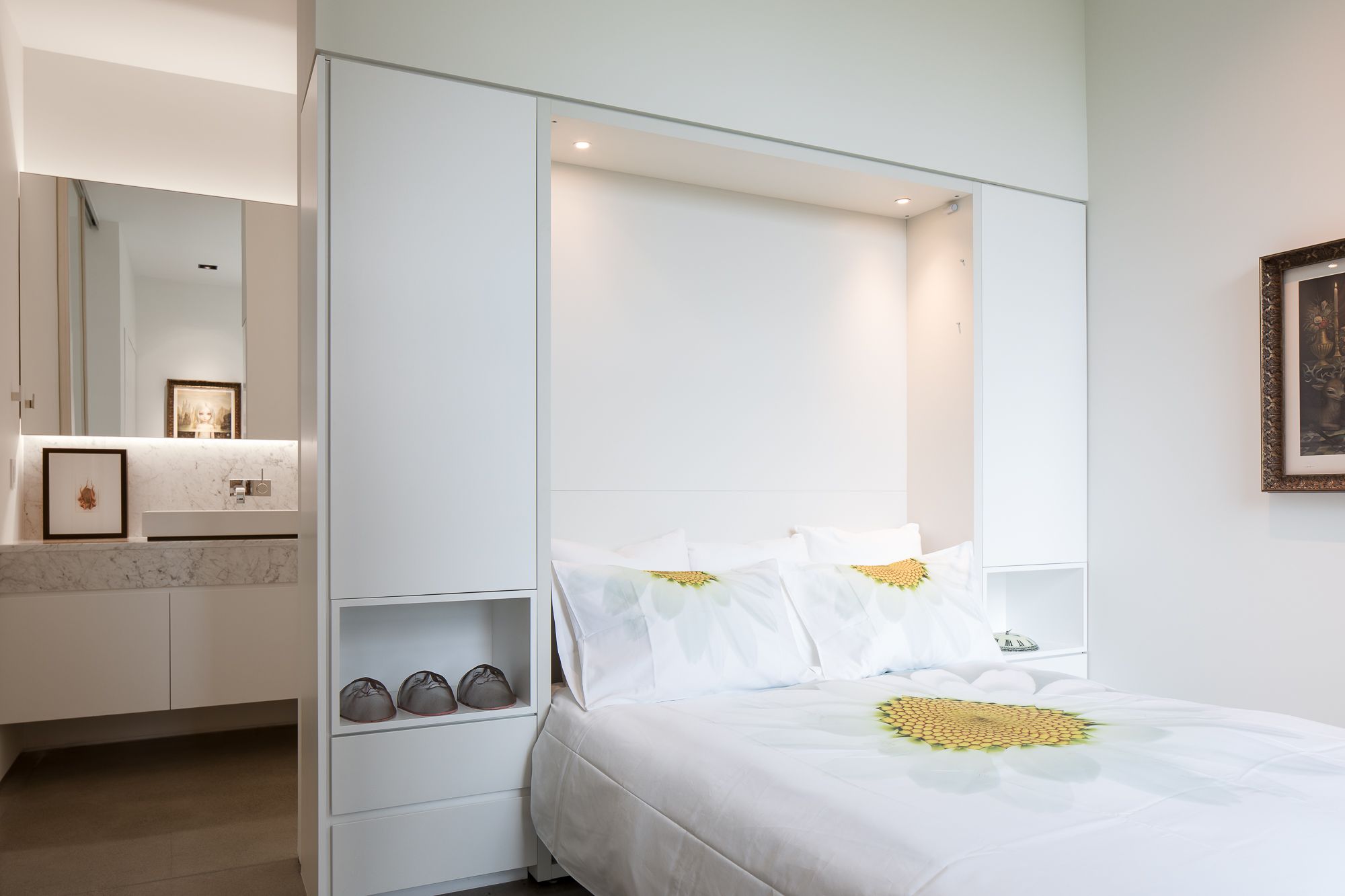 Projekt architektoniczny przyjął formę prostego, geometrycznego „pudełka”, a ograniczona paleta materiałów i kolorów pozwoliła skupić uwagę na sztuce i widokach. Elewacje wykończono czarnymi panelami metalowymi zestawionymi z białymi fragmentami ścian, natomiast wnętrza utrzymano w niemal ascetycznej bieli. Marmur Carrara, polerowany beton oraz czarne, drewniane ramy okienne tworzą eleganckie, neutralne tło dla dzieł sztuki i natury za oknem. Mimo ograniczonego budżetu, dzięki racjonalnemu projektowi, prostym detalom i sprytnemu wykorzystaniu systemowych mebli, udało się stworzyć wyjątkowy dom artystów, łączący funkcję mieszkalną, wystawienniczą i kontemplacyjną.