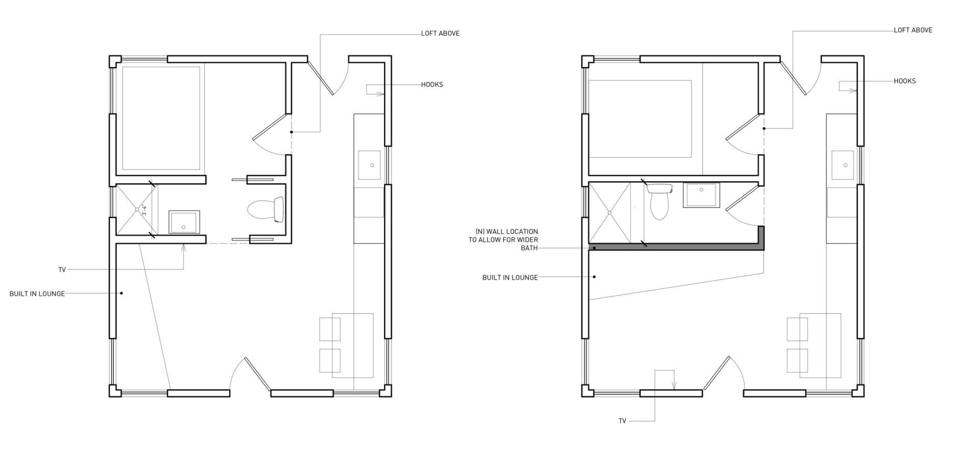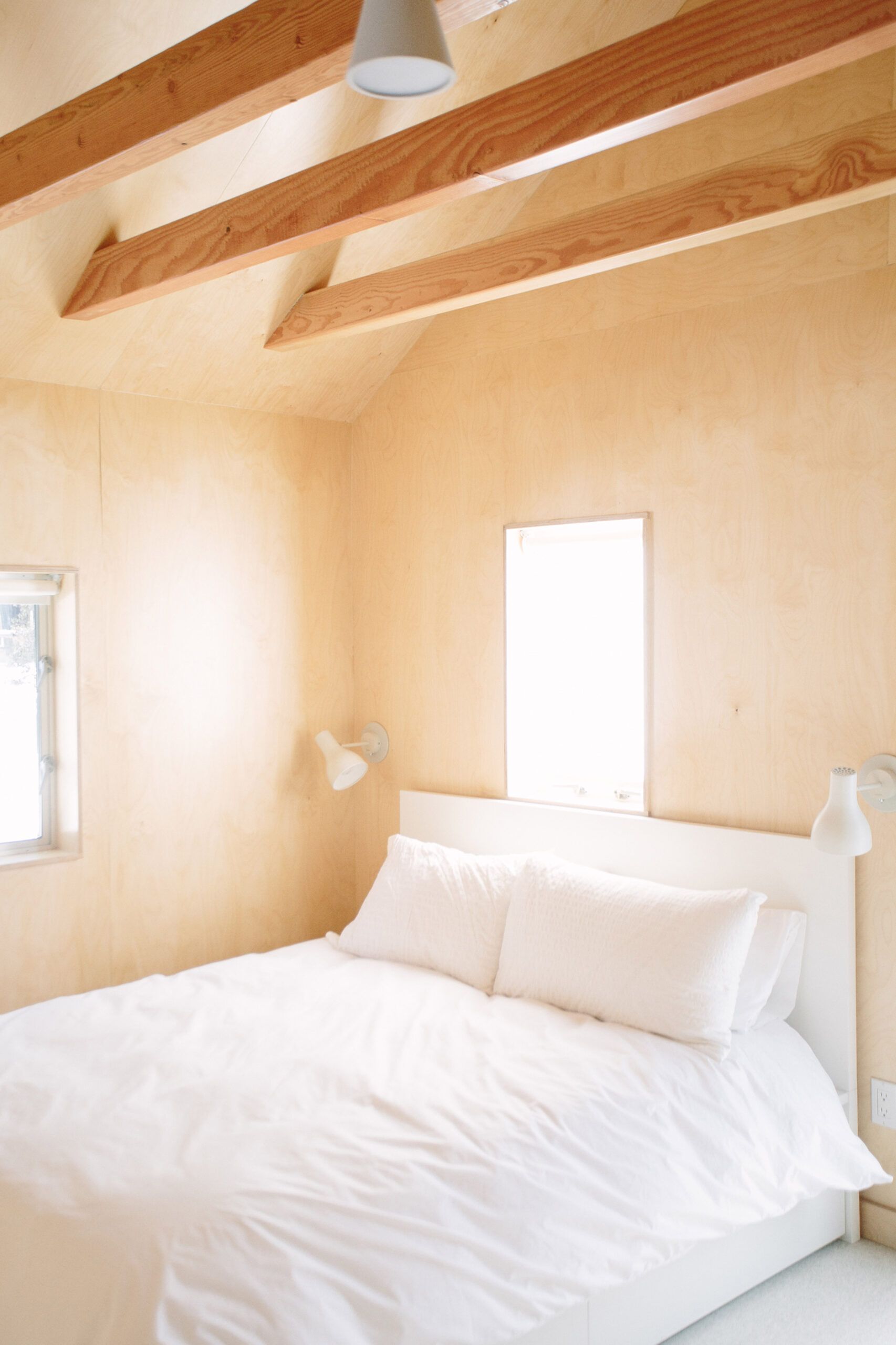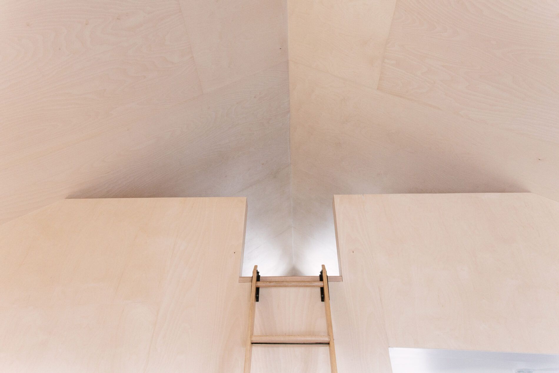 Projektanci postanowili pozostawić chatki od zewnątrz w niezmienionym stanie, neutralizując je jedynie poprzez pomalowanie ich na czarno. Wnętrza domków miały być jednak zupełnie przebudowane. Chodziło o to, by w starym ciele zamieszkał nowy duch. We wnętrzach zawitała minimalistyczna, wydajna finansowo paleta materiałów. Sklejka, która jest drewnem przetworzonym, ale wciąż naturalnym, nawiązuje do lasu i drzew, które dominują na działce. Na podłogach na parterze zastosowano linoleum, które swym wyglądem m przypominać ściółkę leśną. To co na zewnątrz, ma być bowiem odzwierciedlone wewnątrz.