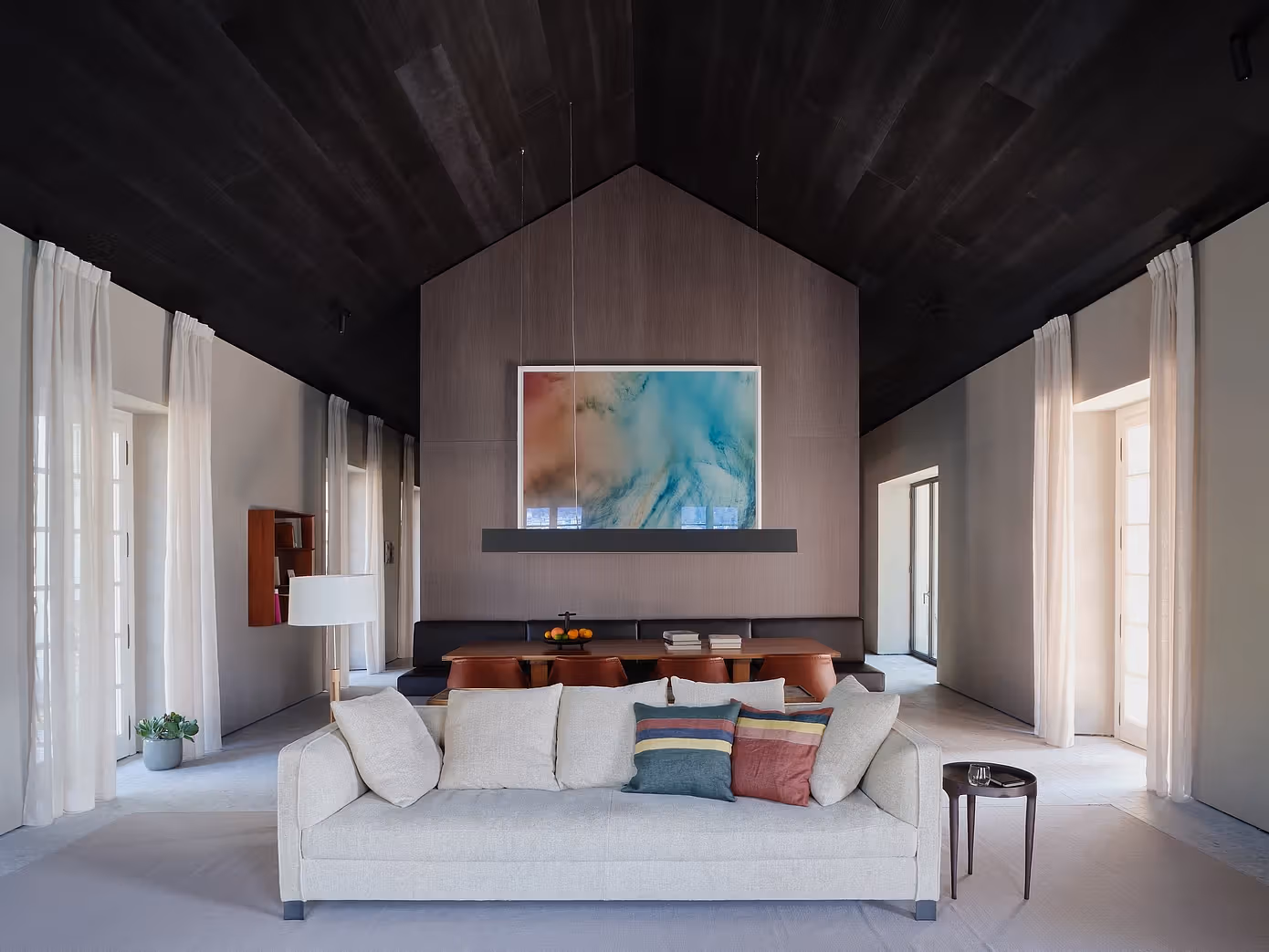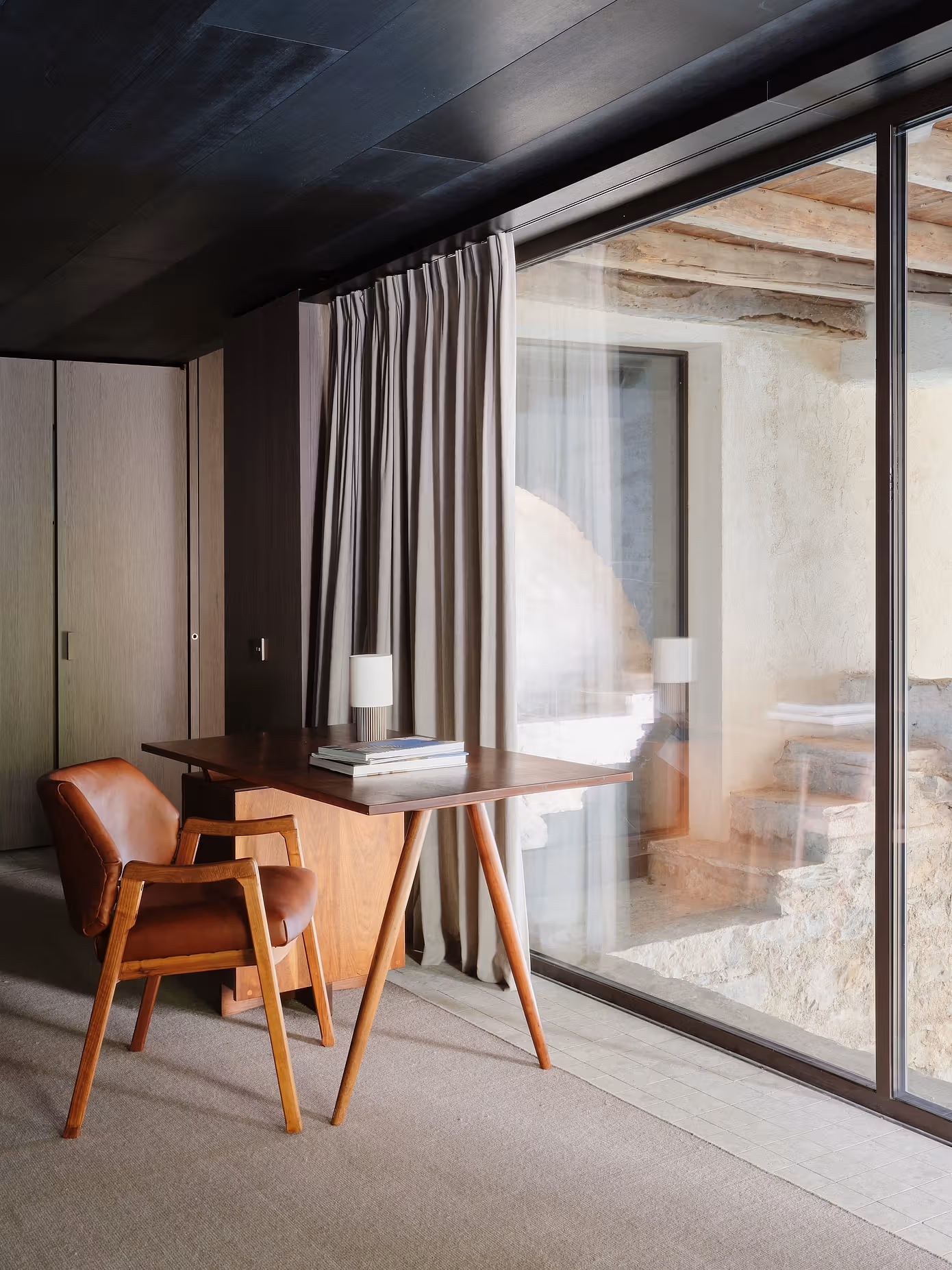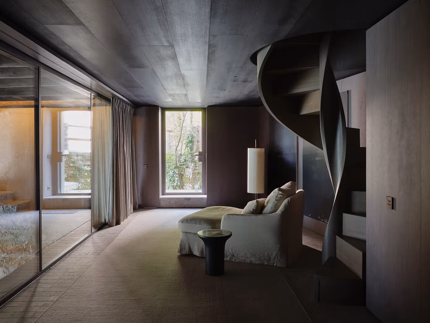 Wnętrza wypełniają naturalne materiały: kamień, drewno, len, szkło. Podłogi ułożono z kamiennych płytek 10×10 cm, typowych dla skromnych domów w okolicy. Meble – często aukcyjne perełki – uzupełniają kolekcję sztuki właściciela. Wśród nich znajdziemy fotele 814 autorstwa Ico i Luisy Parisi, nożycowe krzesła Liny Bo Bardi z drewna Jatobá czy biurko George’a Nakashimy. Spiralne schody prowadzą do gościnnej antresoli oraz niższego poziomu z gabinetem i strefą wellness.