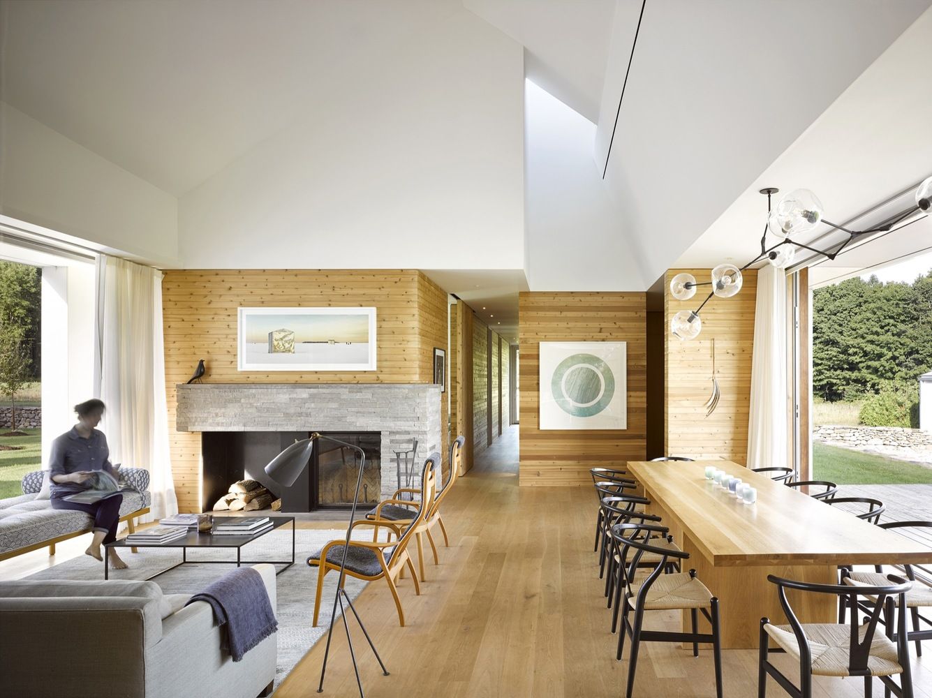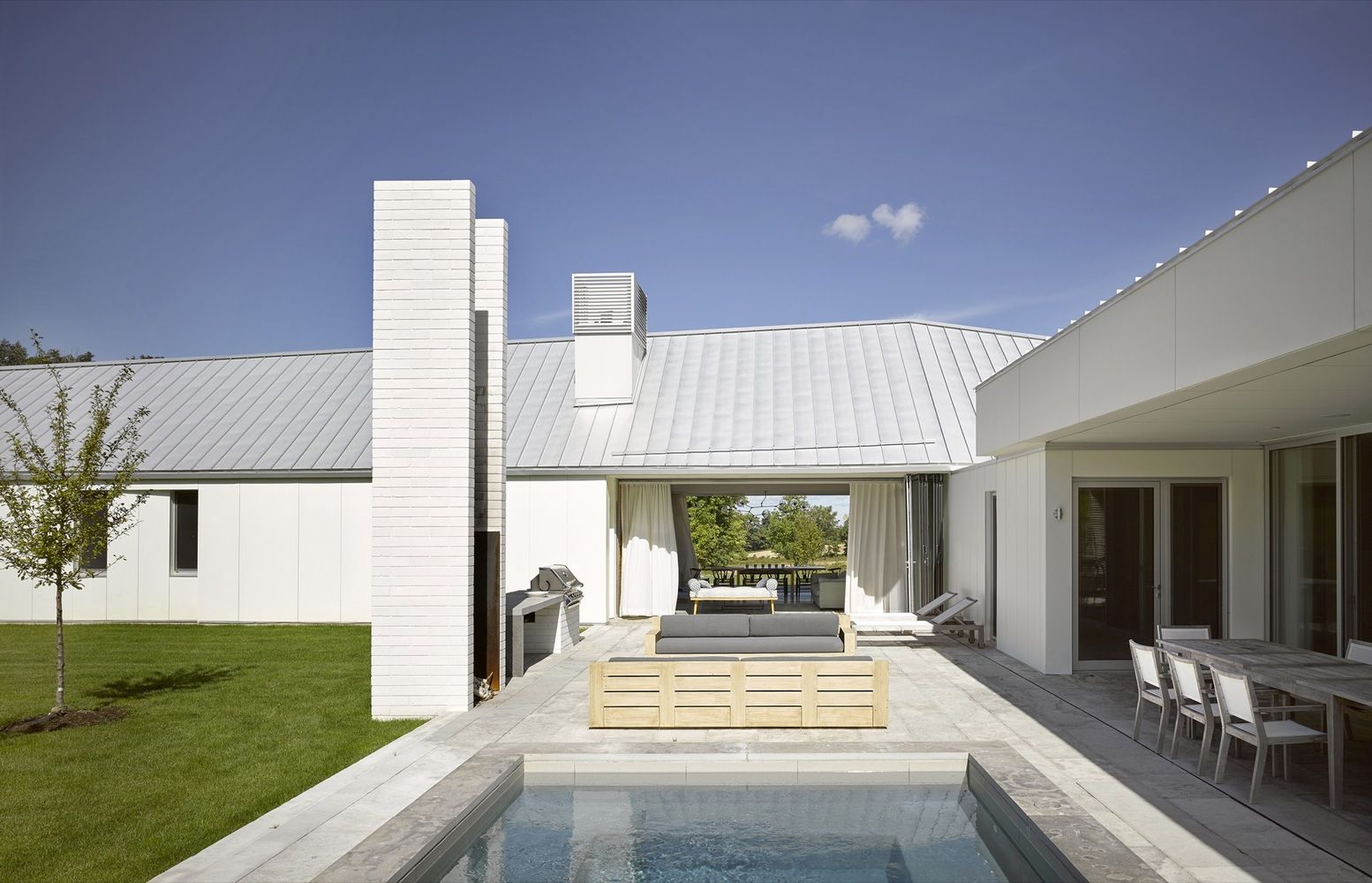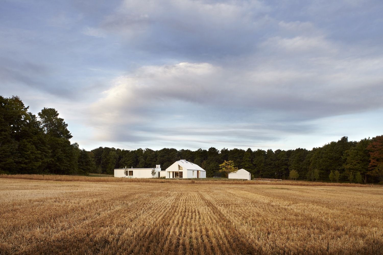 Biała bryła budynku wpisuje się w zmienność krajobrazu: zlewa się ze śniegiem zimą, kontrastuje z zielenią latem. Dwa skrzydła budynku w formie litery „L” tworzą wewnętrzny dziedziniec z zewnętrznym kominkiem, a niska, rozciągnięta forma nawiązuje do tradycyjnych domów wiejskich Ameryki Północnej i Europy. Lokalny kamień i naturalne drewno cedrowe oraz dębowe nadają wnętrzu ciepło i ponadczasowy charakter.