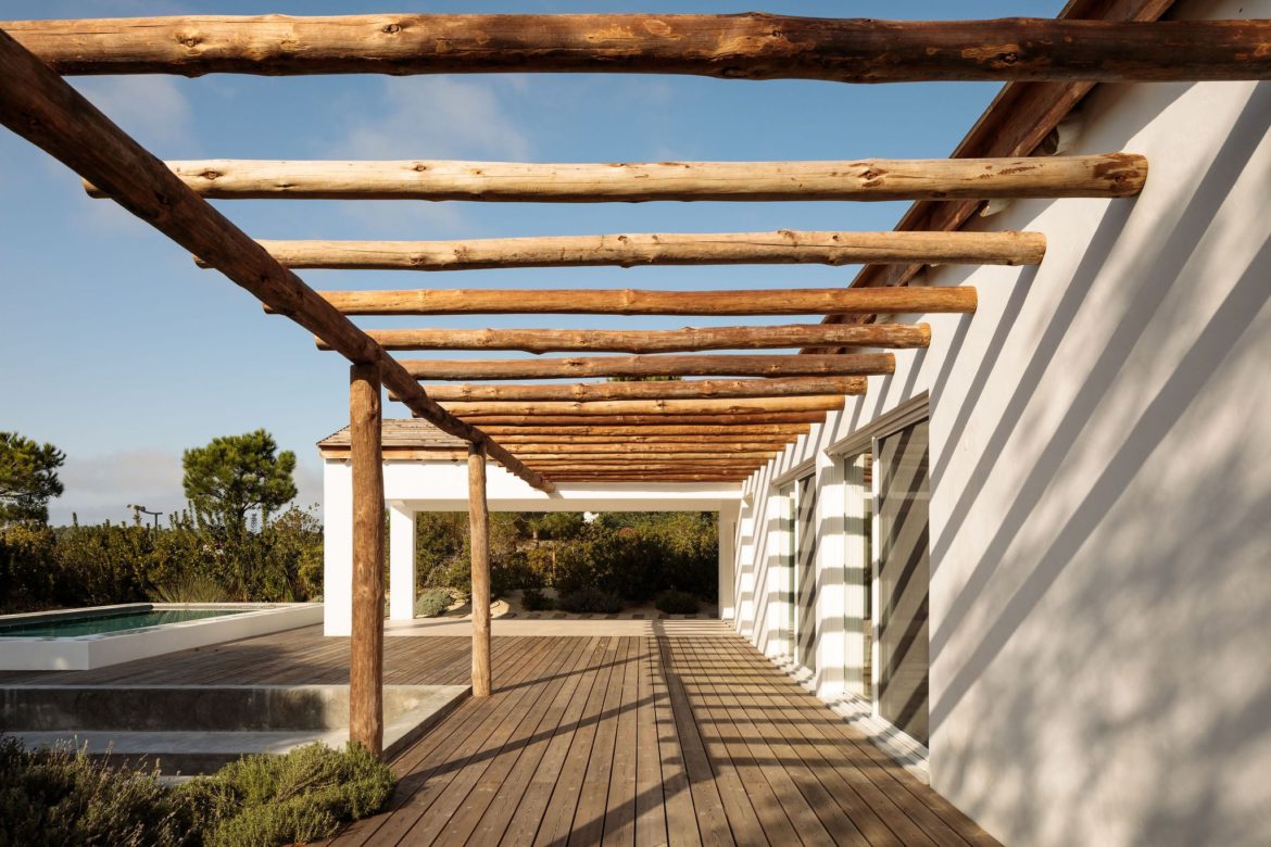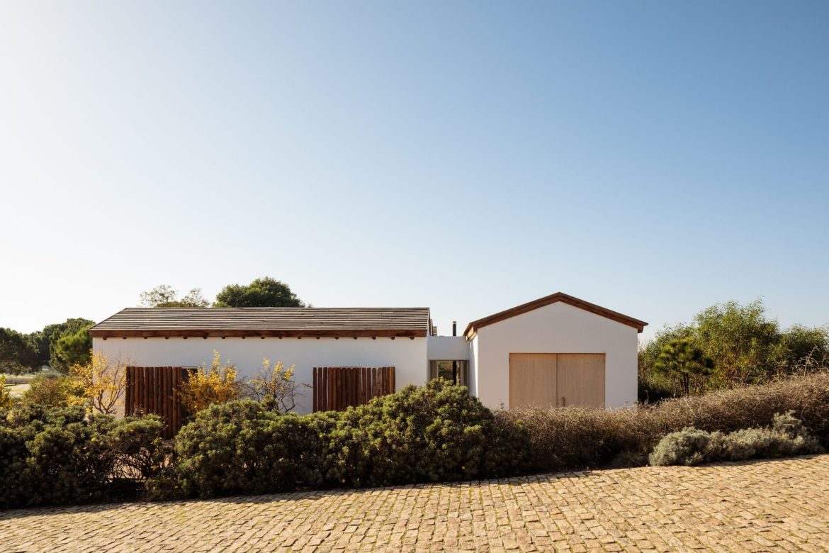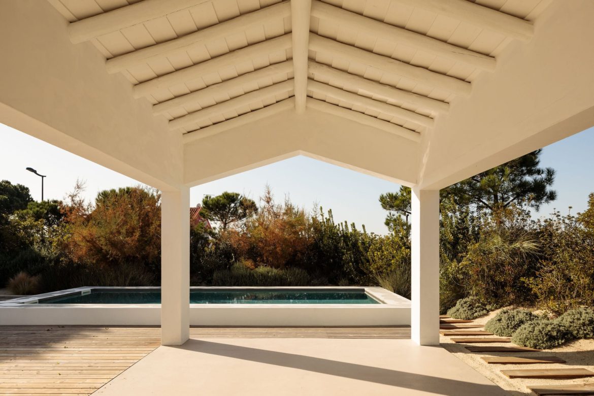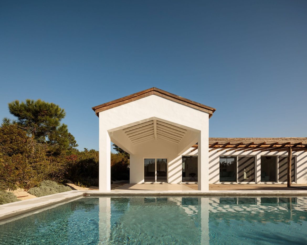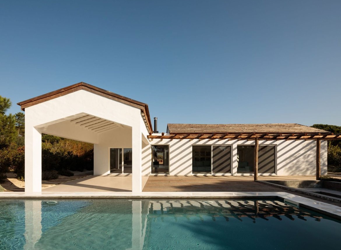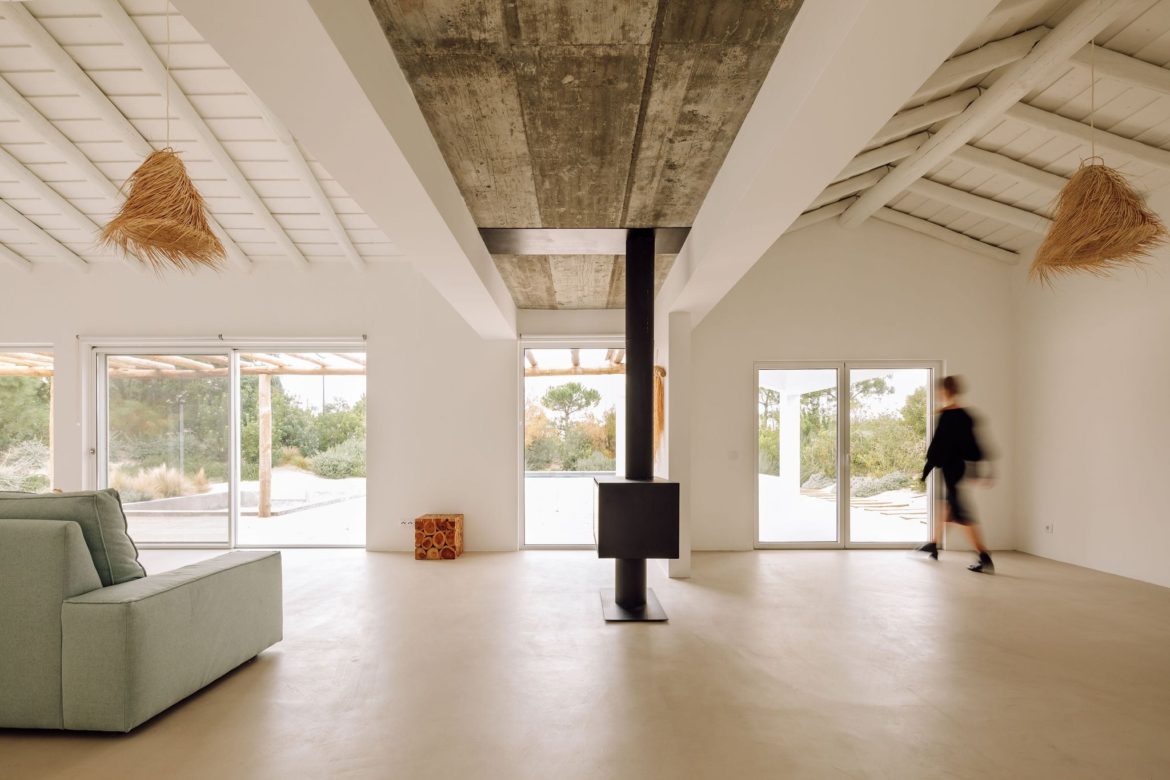 Cztery połączone bryły wyznaczają układ przestrzenny, w którym część dzienna i wspólna znajduje się po stronie prawej i górnej, a strefa prywatna – w lewej dolnej części domu. Między budynkami zaprojektowano tarasy, ścieżki i płaskie przejścia, które pozwalają na organiczne przenikanie wnętrz i krajobrazu. Dom Comporta 34 to nowoczesna interpretacja letniej rezydencji w stylu slow living – zrównoważonej, zakorzenionej w miejscu i otwartej na otaczającą przyrodę.