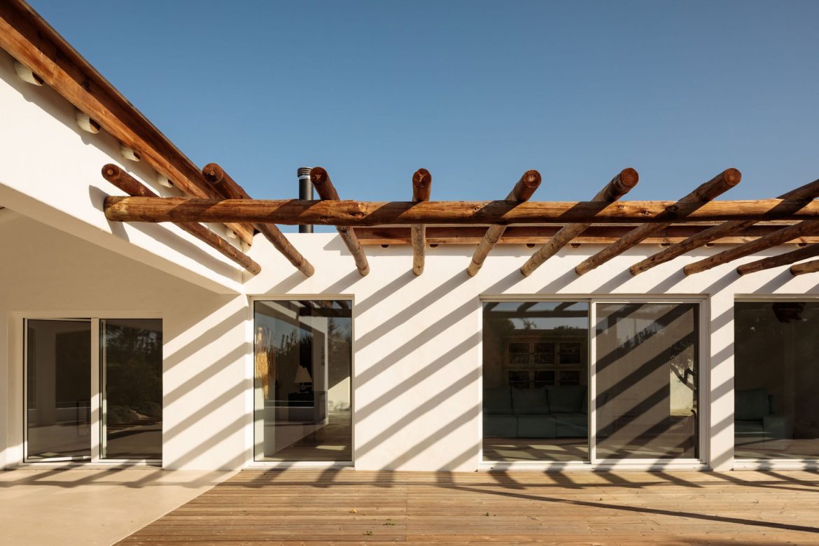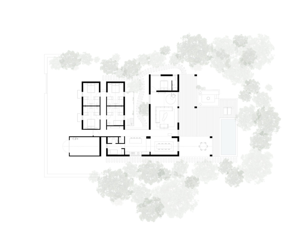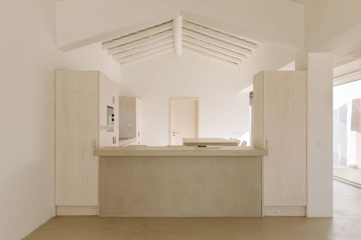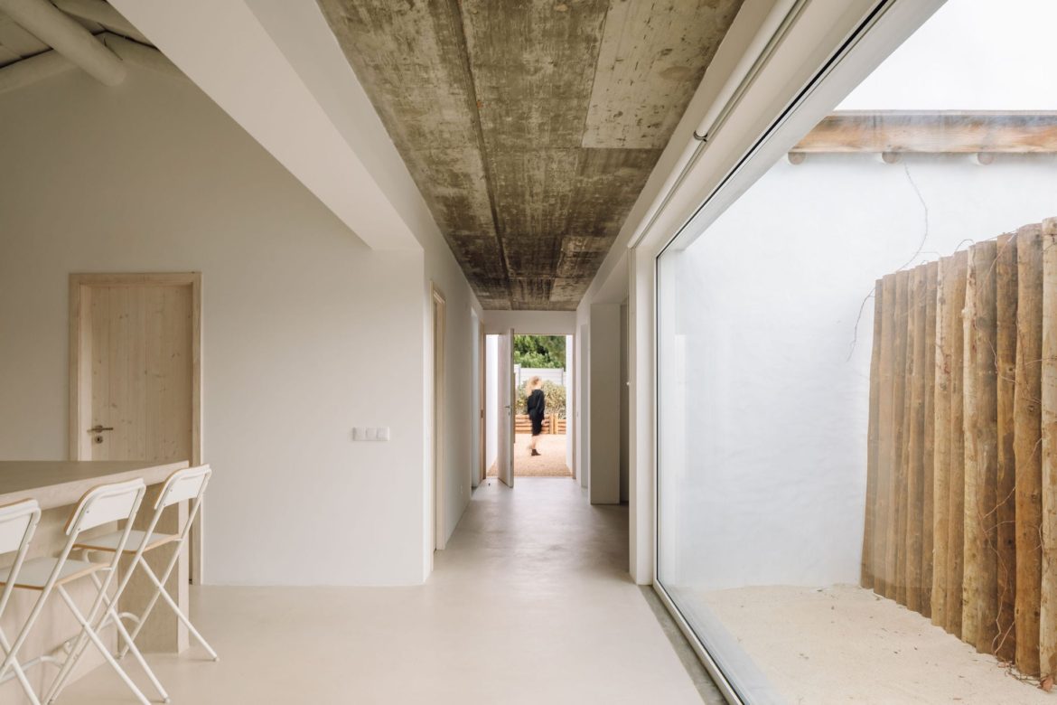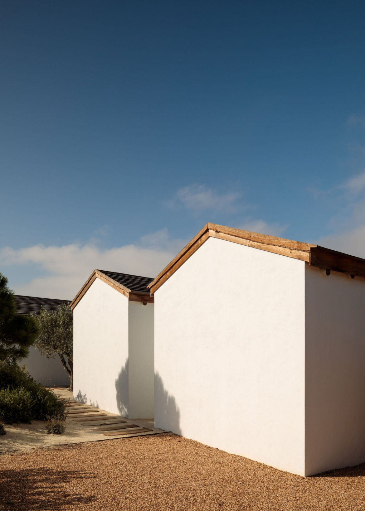Cztery połączone bryły wyznaczają układ przestrzenny, w którym część dzienna i wspólna znajduje się po stronie prawej i górnej, a strefa prywatna – w lewej dolnej części domu. Między budynkami zaprojektowano tarasy, ścieżki i płaskie przejścia, które pozwalają na organiczne przenikanie wnętrz i krajobrazu. Dom Comporta 34 to nowoczesna interpretacja letniej rezydencji w stylu slow living – zrównoważonej, zakorzenionej w miejscu i otwartej na otaczającą przyrodę.