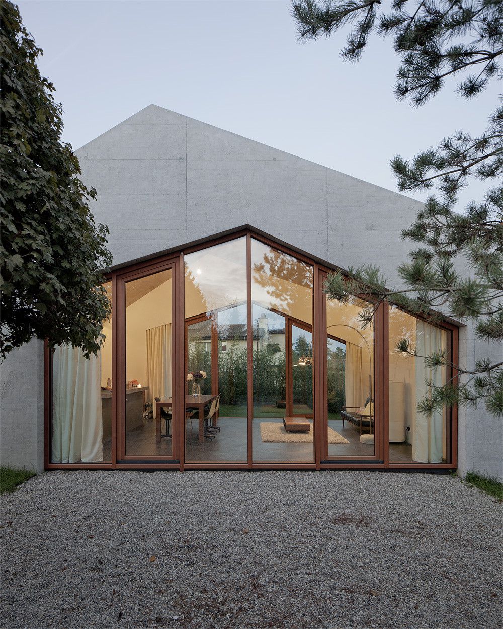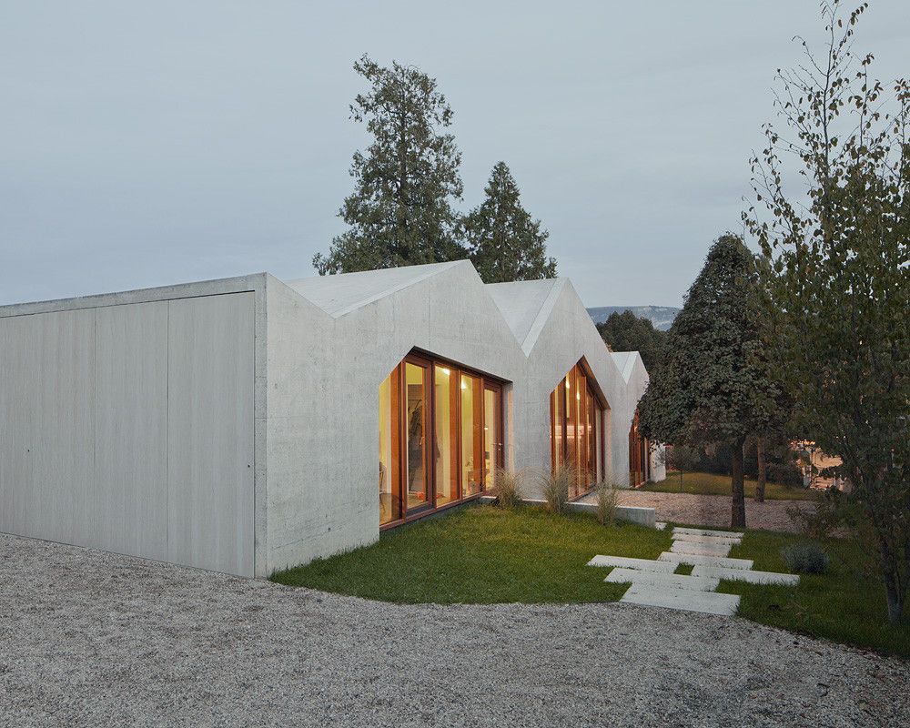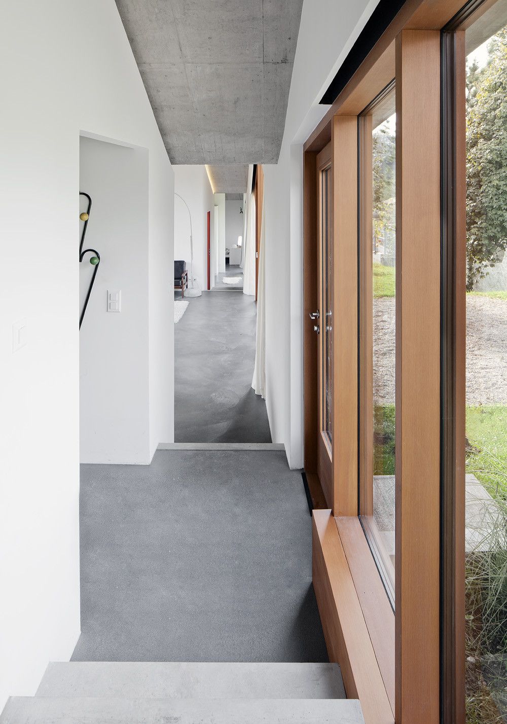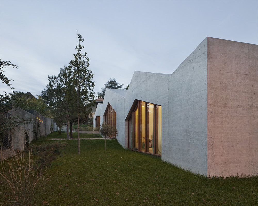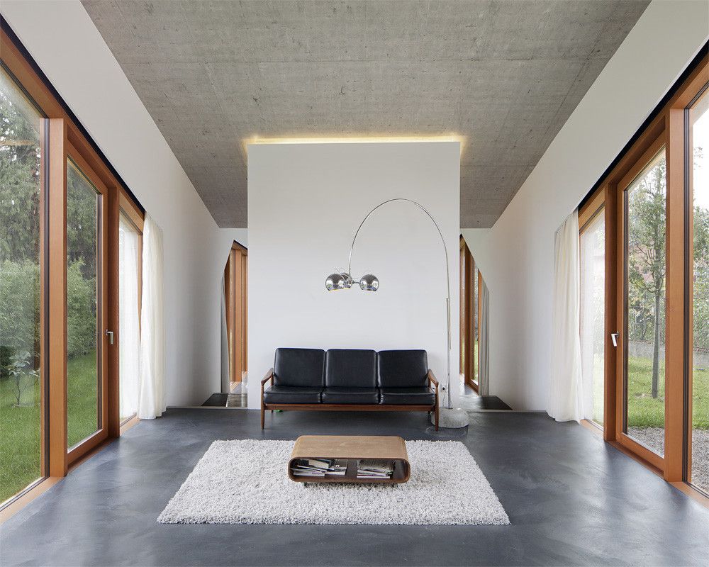 Strefa dzienna z salonem i kuchnią została zaplanowana w centralnej części domu, natomiast w górnej strefie ulokowano pokój gościnny, a w najniższej – pokoje dziecięce oraz dodatkowy pokój na parterze. Części użytkowe umieszczone w osi budynku pełnią rolę bufora, oddzielając główne przestrzenie mieszkalne, które łączy boczny korytarz z wyraźnie zaznaczoną zmianą poziomów. Zewnętrzne ściany betonowe chronią wnętrza przed hałasem z pobliskiej drogi i podkreślają nieregularny kształt bryły wynikający z różnic wysokości. Duże przeszklenia wzmacniają wrażenie transparentności, a pionowe płaszczyzny i słupy z drewna sosnowego akcentują relacje między poszczególnymi przestrzeniami, tworząc spójny, nowoczesny dom jednorodzinny.