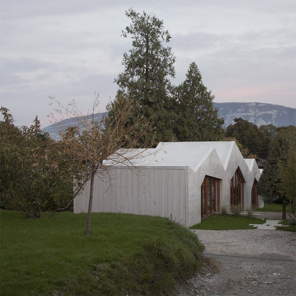 Nowy budynek jednorodzinny powstał na podłużnej działce i w pełni wykorzystuje możliwy do zabudowy teren. Projekt domu świadomie wykorzystuje łagodnie opadające ukształtowanie dawnego sadu, dzieląc bryłę na trzy przenikające się strefy o zróżnicowanych wysokościach. Każda z tych części otwiera się na ogród zlokalizowany po obu stronach budynku, zapewniając naturalne doświetlenie i kontakt z zielenią. Taki układ przestrzenny nadaje obiektowi charakter nowoczesnej stodoły, w której prosta forma architektoniczna została podporządkowana krajobrazowi i funkcji, a bryła naturalnie „schodzi” wraz z terenem.