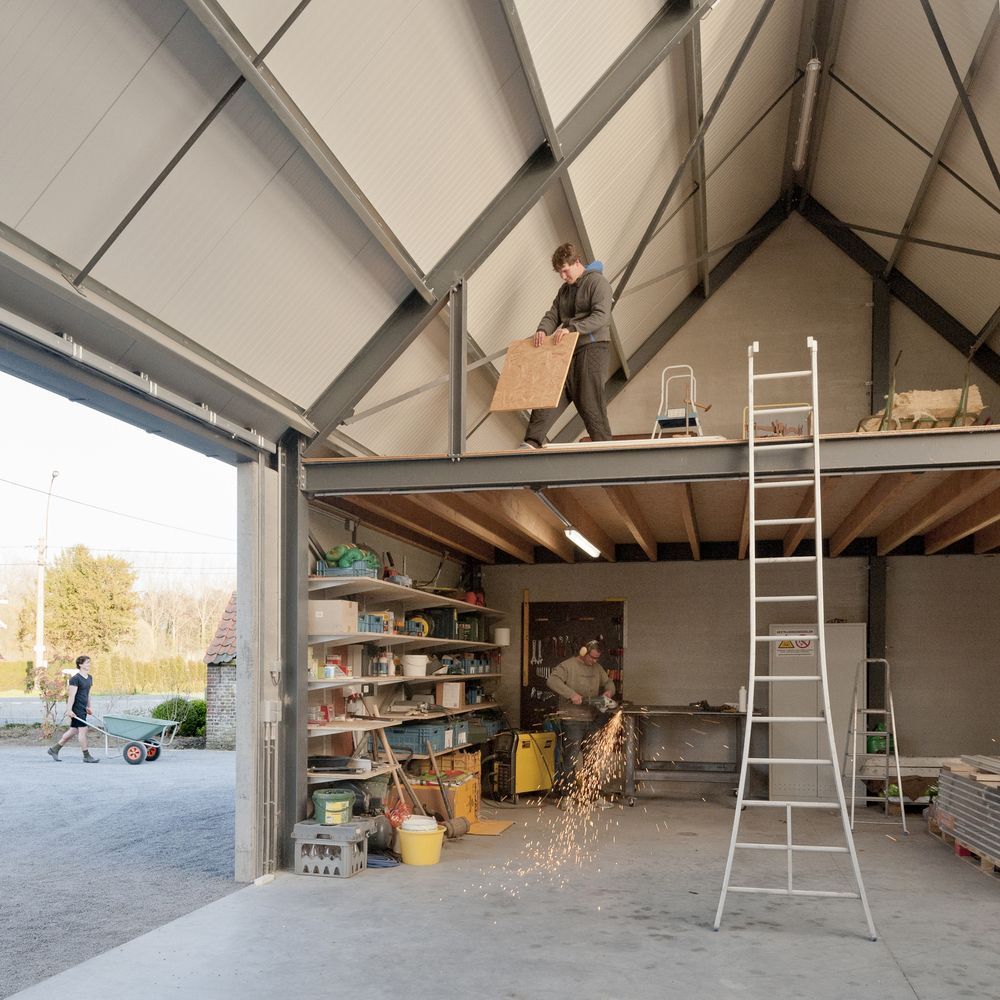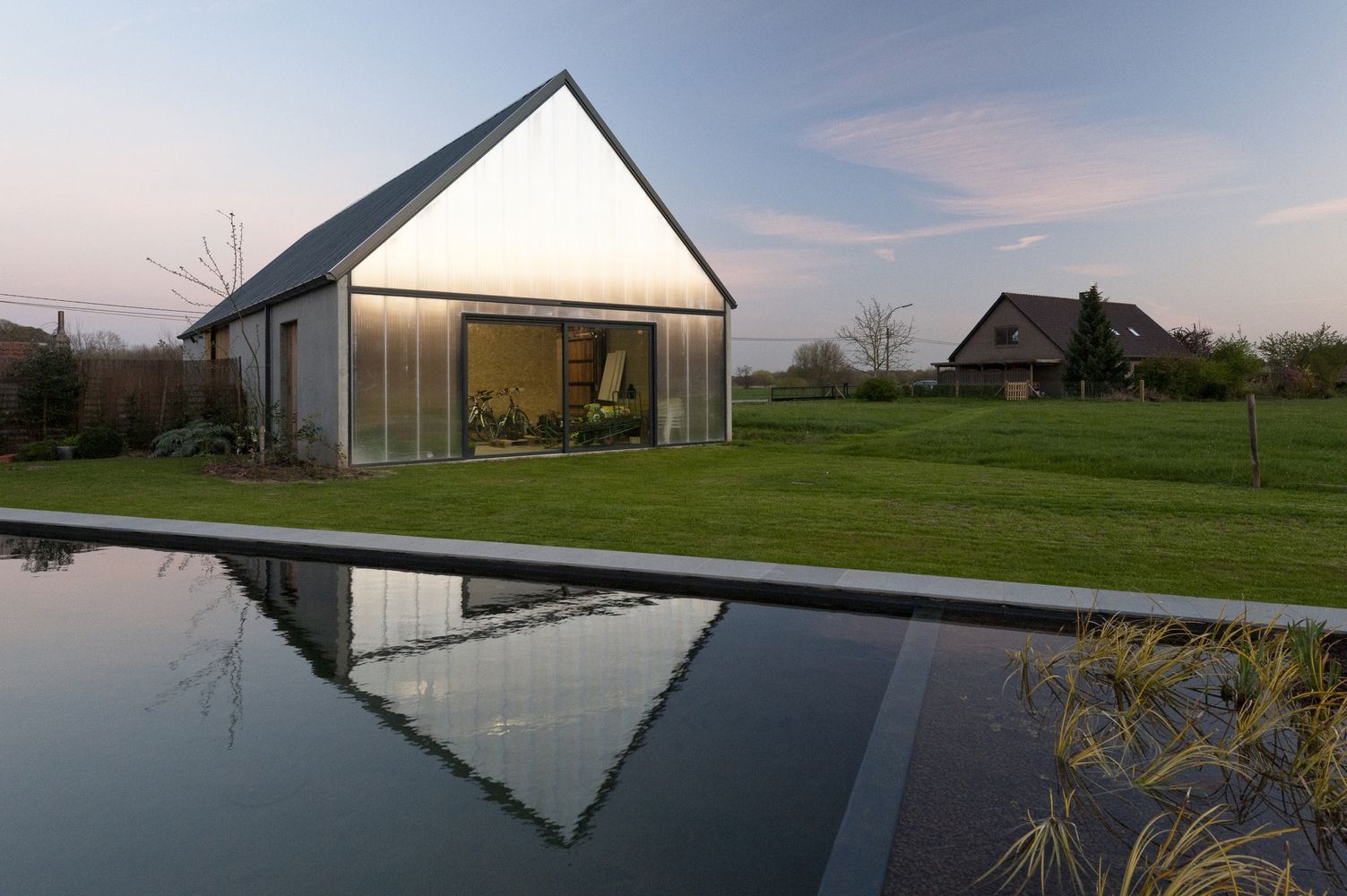 Wiejska okolica oraz bliskość starych farm i zamków stały się impulsem do stworzenia domu nawiązującego do typologii lokalnych budynków gospodarczych. Projekt oparto na dachu o nachyleniu 45° oraz regularnych przęsłach o długości pięciu metrów, charakterystycznych dla tradycyjnej architektury rolniczej. Po konsultacjach z architektem krajobrazu budynek ustawiono na planie krzyżowym, co odpowiada historycznej konfiguracji wiejskich siedlisk. Taka forma pozwoliła wpisać obiekt w krajobraz kulturowy, zachowując spójność z otoczeniem, a jednocześnie stworzyć funkcjonalny i energooszczędny dom jednorodzinny, który redefiniuje pojęcie, jakim jest nowoczesna stodoła.