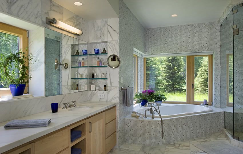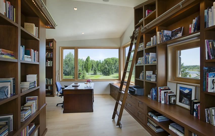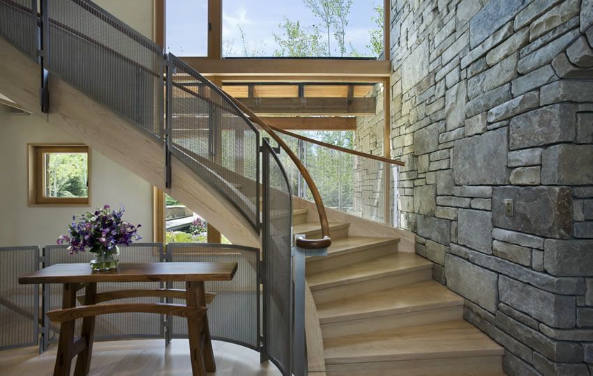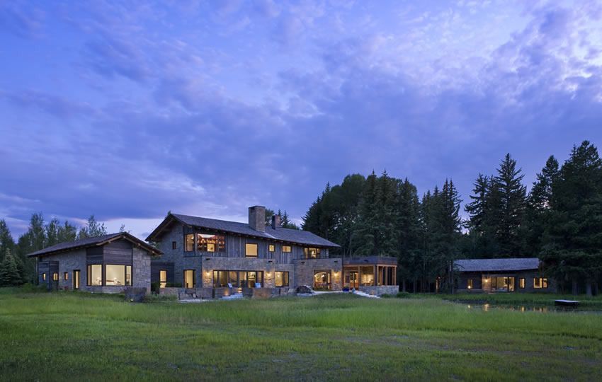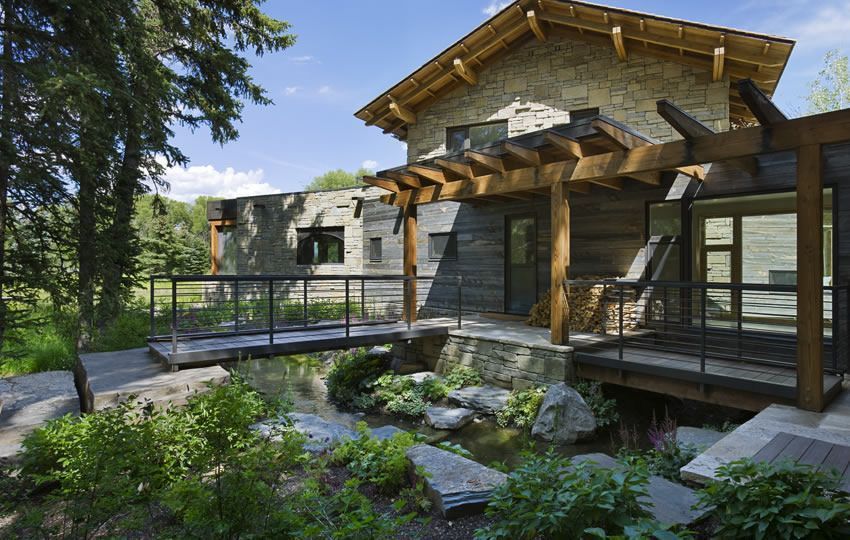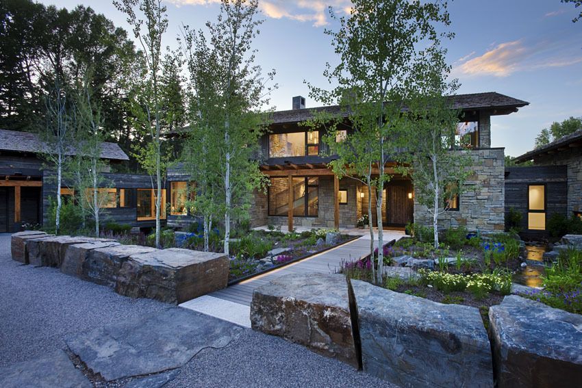 Nowoczesny charakter domu opiera się na konwencjonalnych materiałach i archetypach architektonicznych. Kamienne ściany i masywne drewniane belki przywołują skojarzenia z leśnym schronieniem, podczas gdy elewacja z postarzanego drewna nawiązuje do lokalnych zabudowań gospodarczych, nadając całości charakter, jaki we współczesnej interpretacji może mieć nowoczesna stodoła. Szczególnie wyrazistym elementem jest częściowo oddzielona sypialnia główna, umieszczona w jednokondygnacyjnej bryle z dachem ustawionym prostopadle do reszty domu. Otaczający budynek ogród wykorzystuje naturalne strumyki, mostki i rodzimą roślinność, a starannie zaprojektowane ścieżki dojazdowe – wykonane z różnych materiałów i delikatnie uniesione nad terenem – podkreślają topografię działki. Całość tworzy spójny przykład architektury krajobrazowej i domu jednorodzinnego, harmonijnie wpisanego w surowy pejzaż Wyoming.