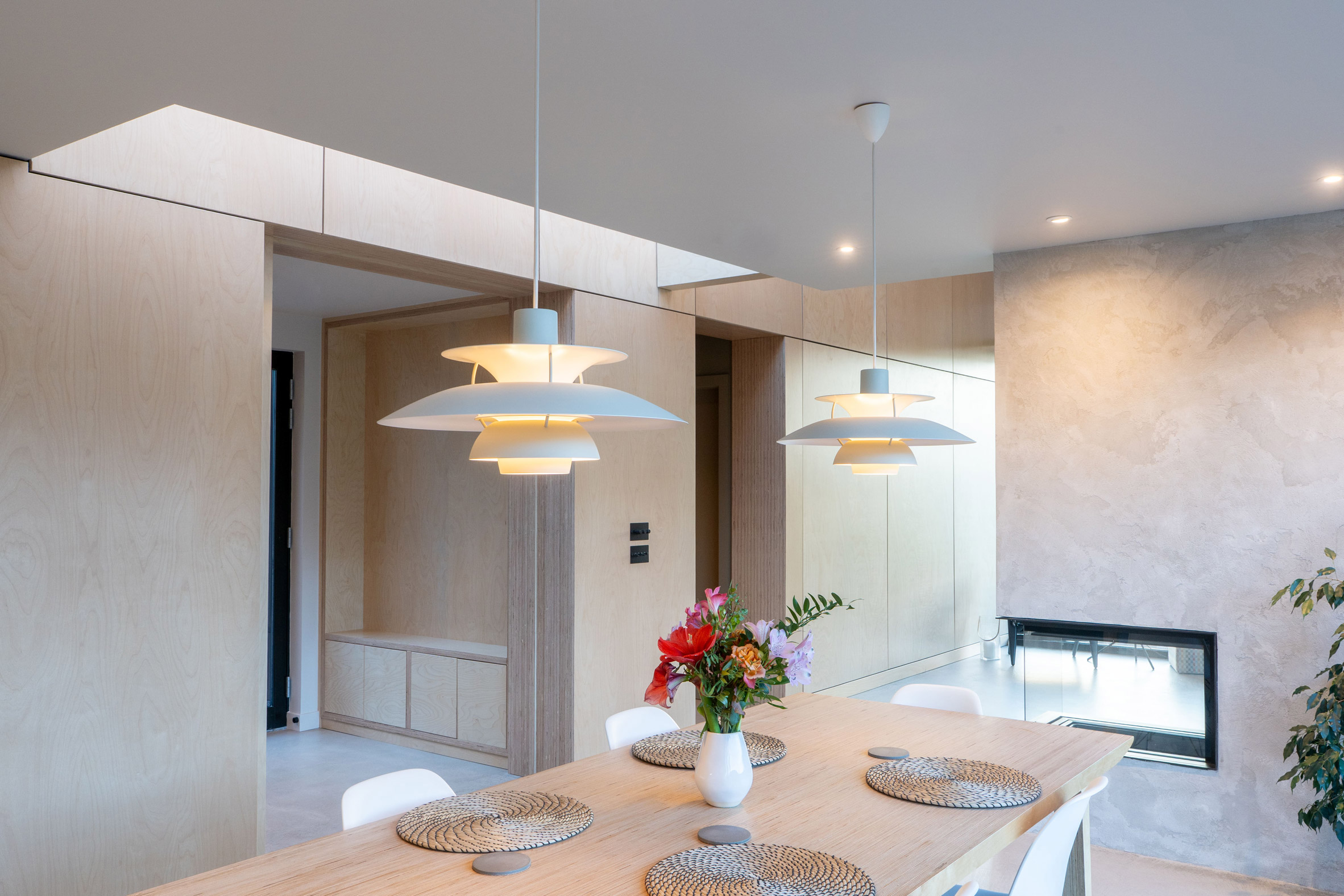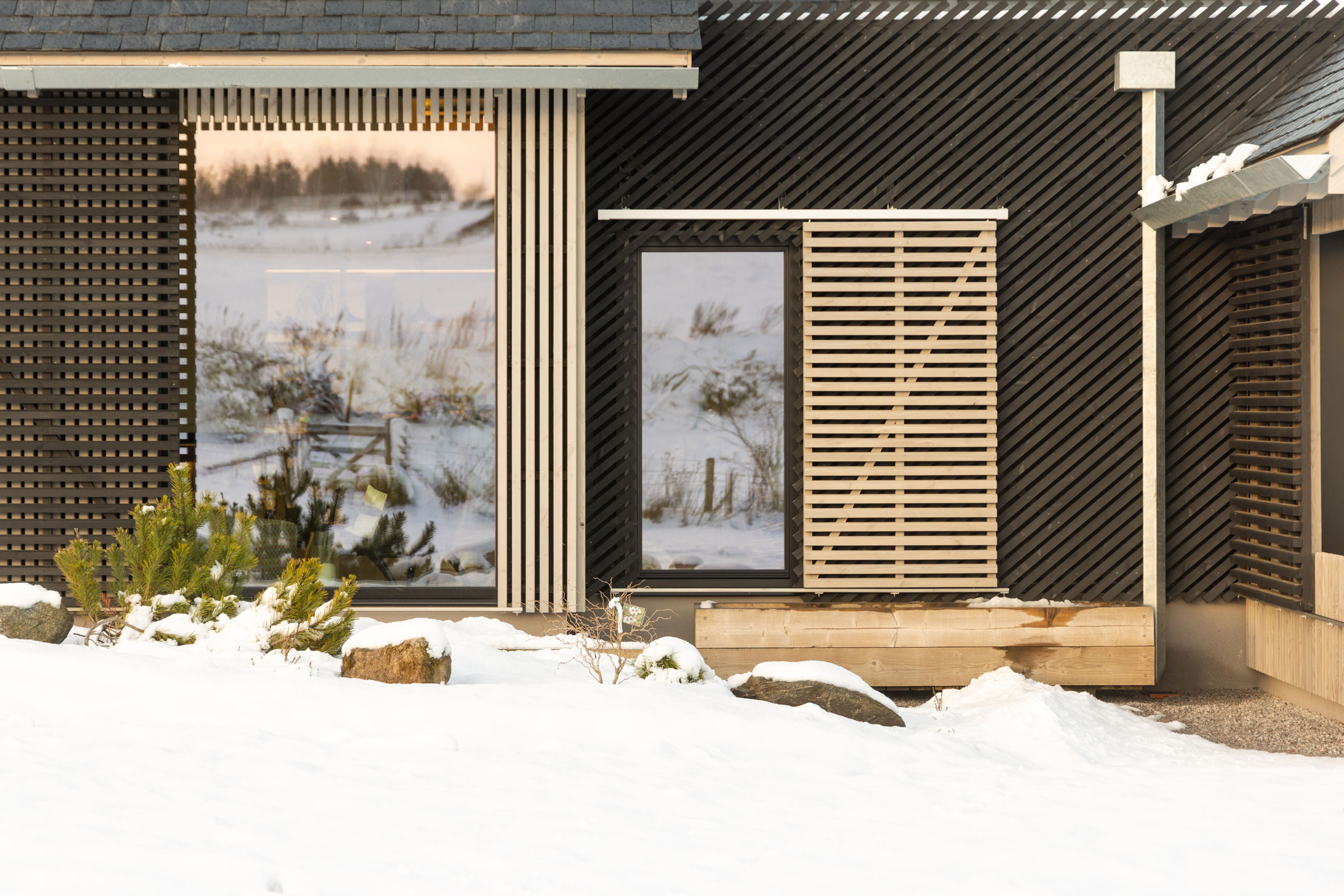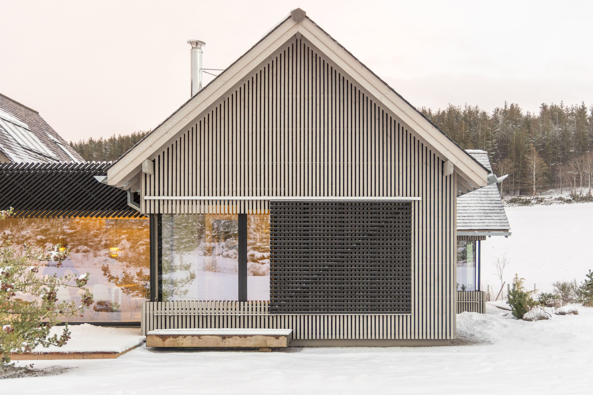 Materiały i forma podkreślają surowy, północny charakter miejsca. Proste dachy dwuspadowe, oszczędna paleta materiałowa i ograniczona liczba detali tworzą architekturę powściągliwą, ale bardzo spójną. Projekt nie próbuje wyróżniać się na siłę – jego siła tkwi w proporcjach, układzie i relacji z krajobrazem.