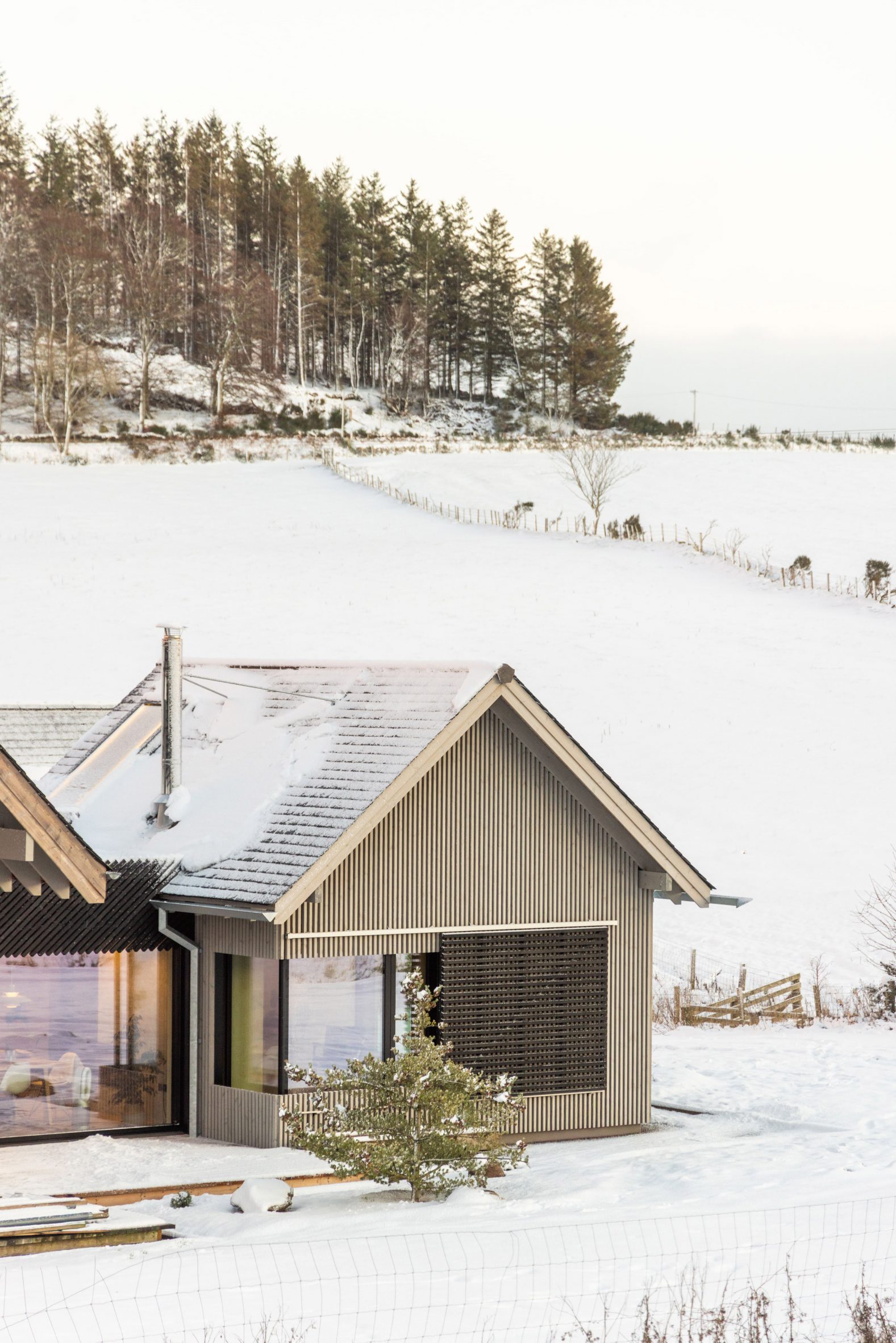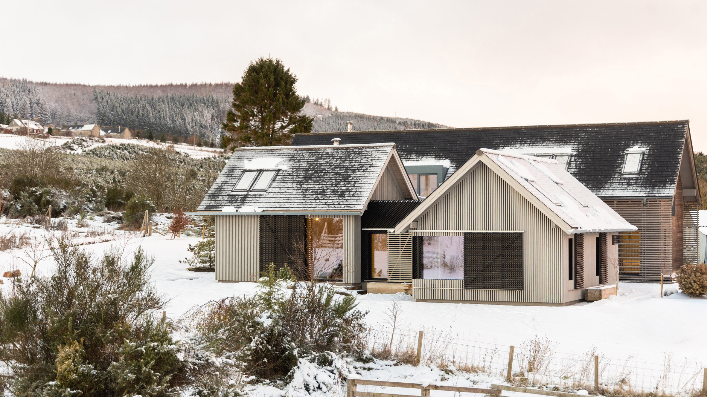 Projekt został ściśle podporządkowany topografii działki. Układ budynków reaguje na ukształtowanie terenu oraz naturalne linie krajobrazu, dzięki czemu całość sprawia wrażenie organicznie wpisanej w otoczenie. Zamiast dominować przestrzeń, architektura podąża za nią, co jest charakterystyczne dla tradycyjnych szkockich farm.