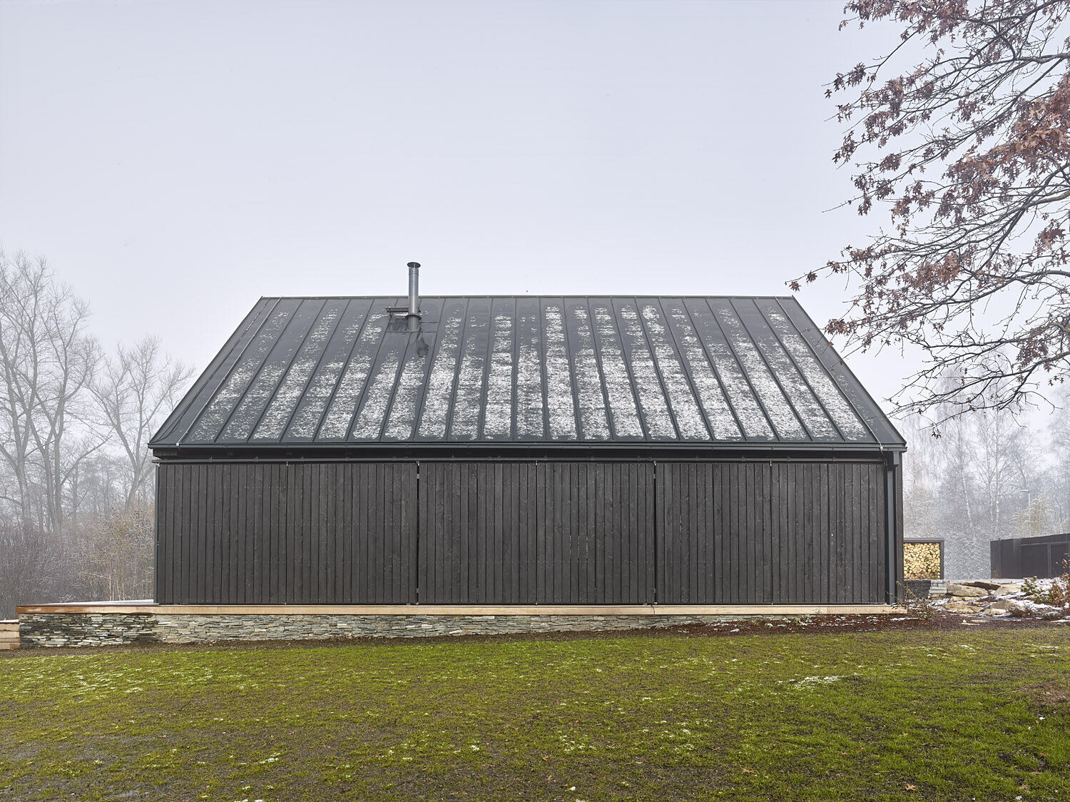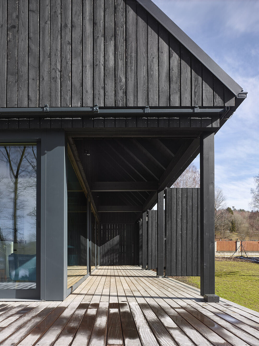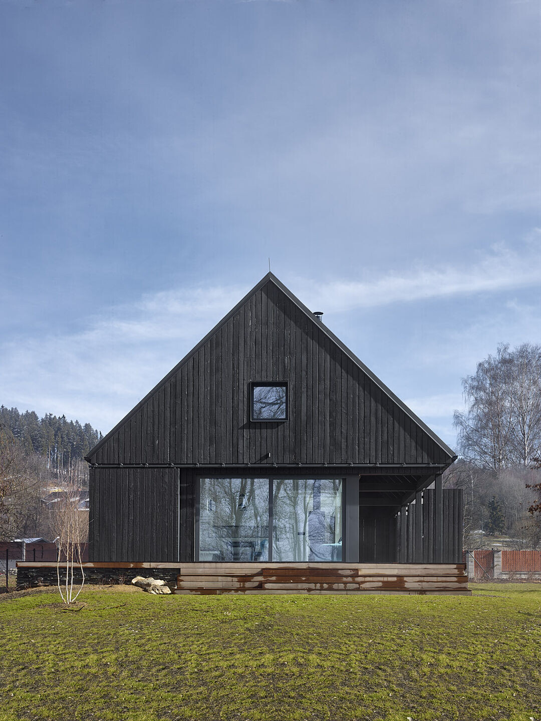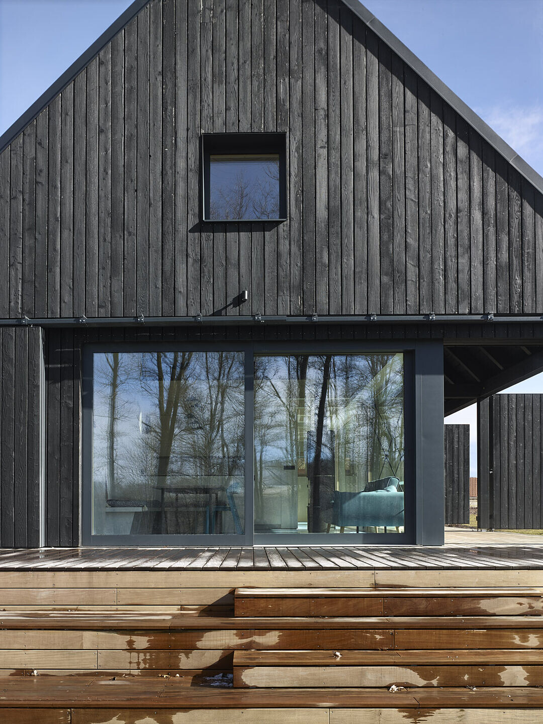 Elewacja wykonana z wypalanego drewna modrzewiowego tworzy wyrazisty kontrast z jasnym wnętrzem, w którym dominują naturalne biopłyty świerkowe. Drewniana konstrukcja szkieletowa spoczywa na solidnym kamiennym podwyższeniu, które otacza budynek z trzech stron, tworząc zarówno zadaszone, jak i otwarte tarasy, idealne do wypoczynku na świeżym powietrzu.