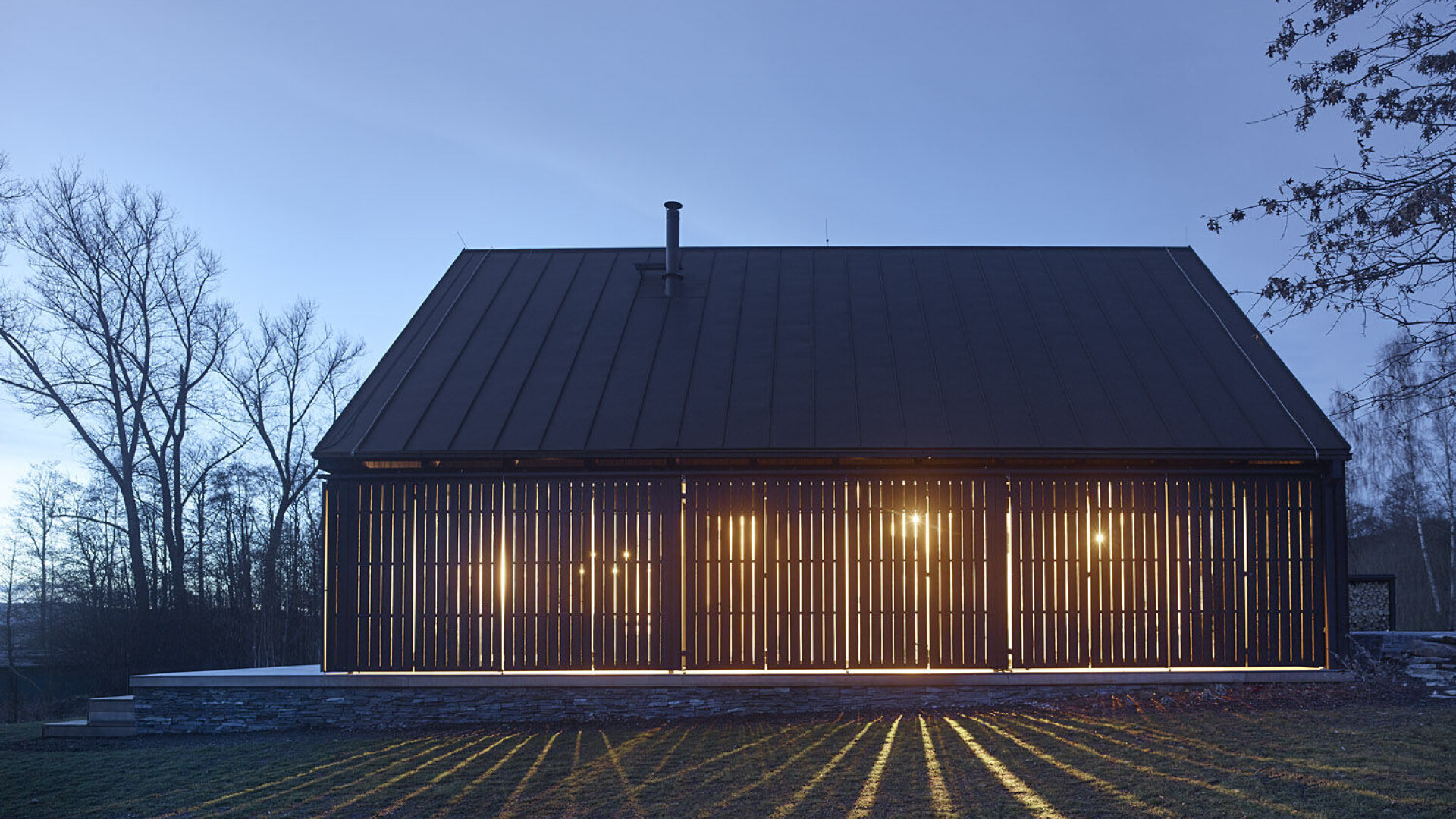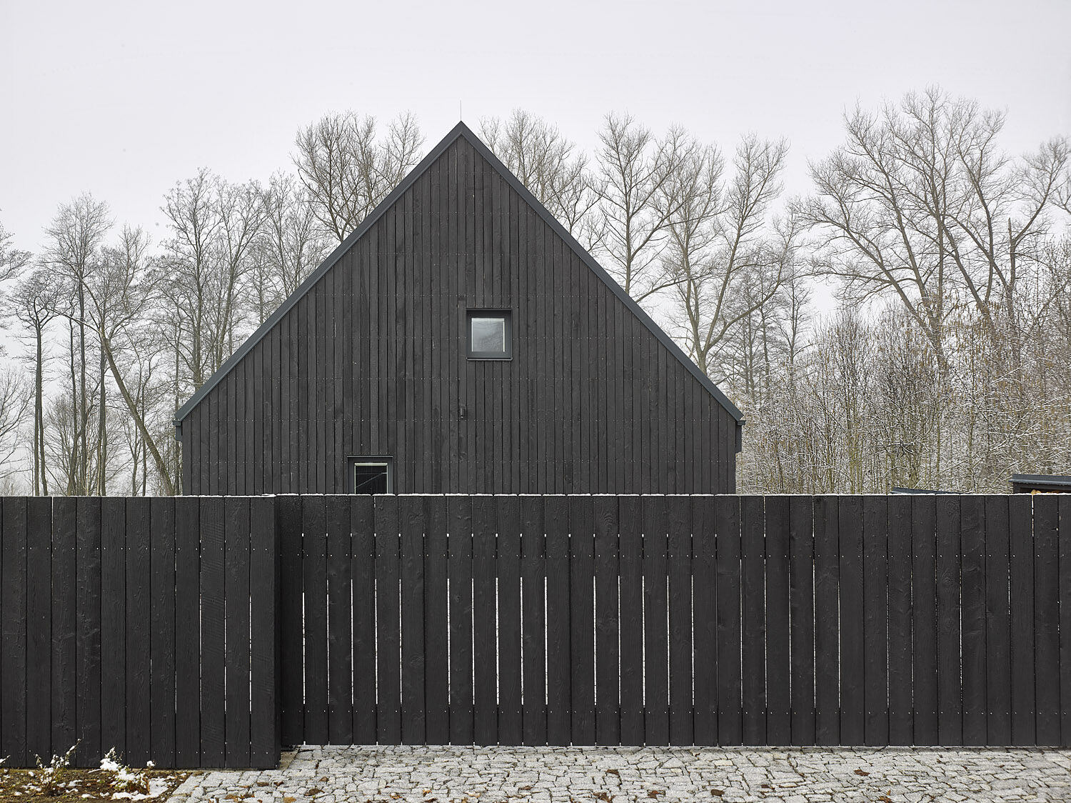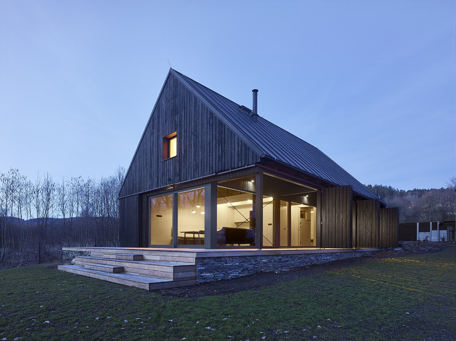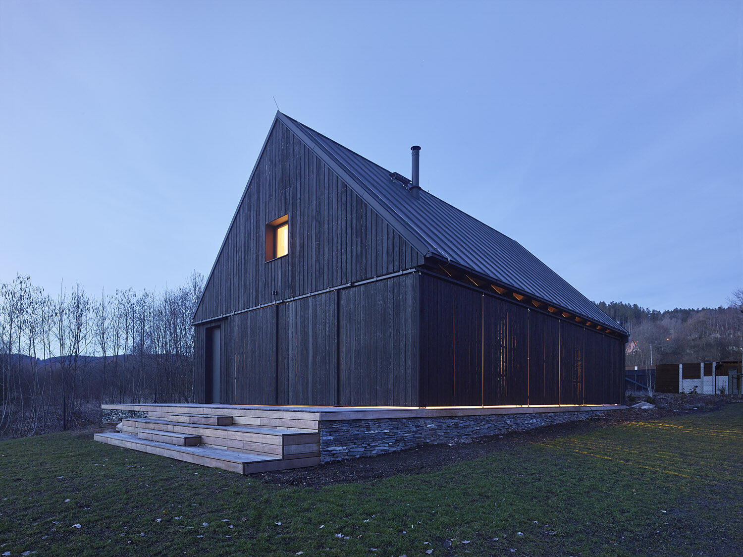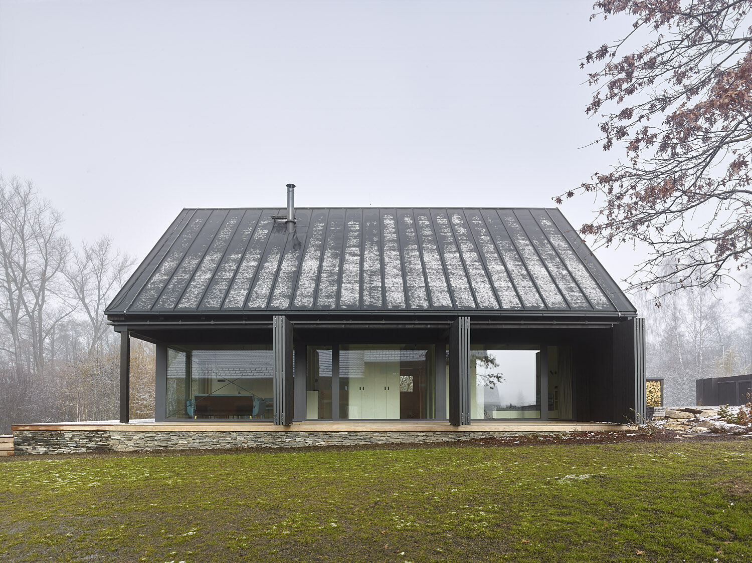 Elewacja wykonana z wypalanego drewna modrzewiowego tworzy wyrazisty kontrast z jasnym wnętrzem, w którym dominują naturalne biopłyty świerkowe. Drewniana konstrukcja szkieletowa spoczywa na solidnym kamiennym podwyższeniu, które otacza budynek z trzech stron, tworząc zarówno zadaszone, jak i otwarte tarasy, idealne do wypoczynku na świeżym powietrzu.