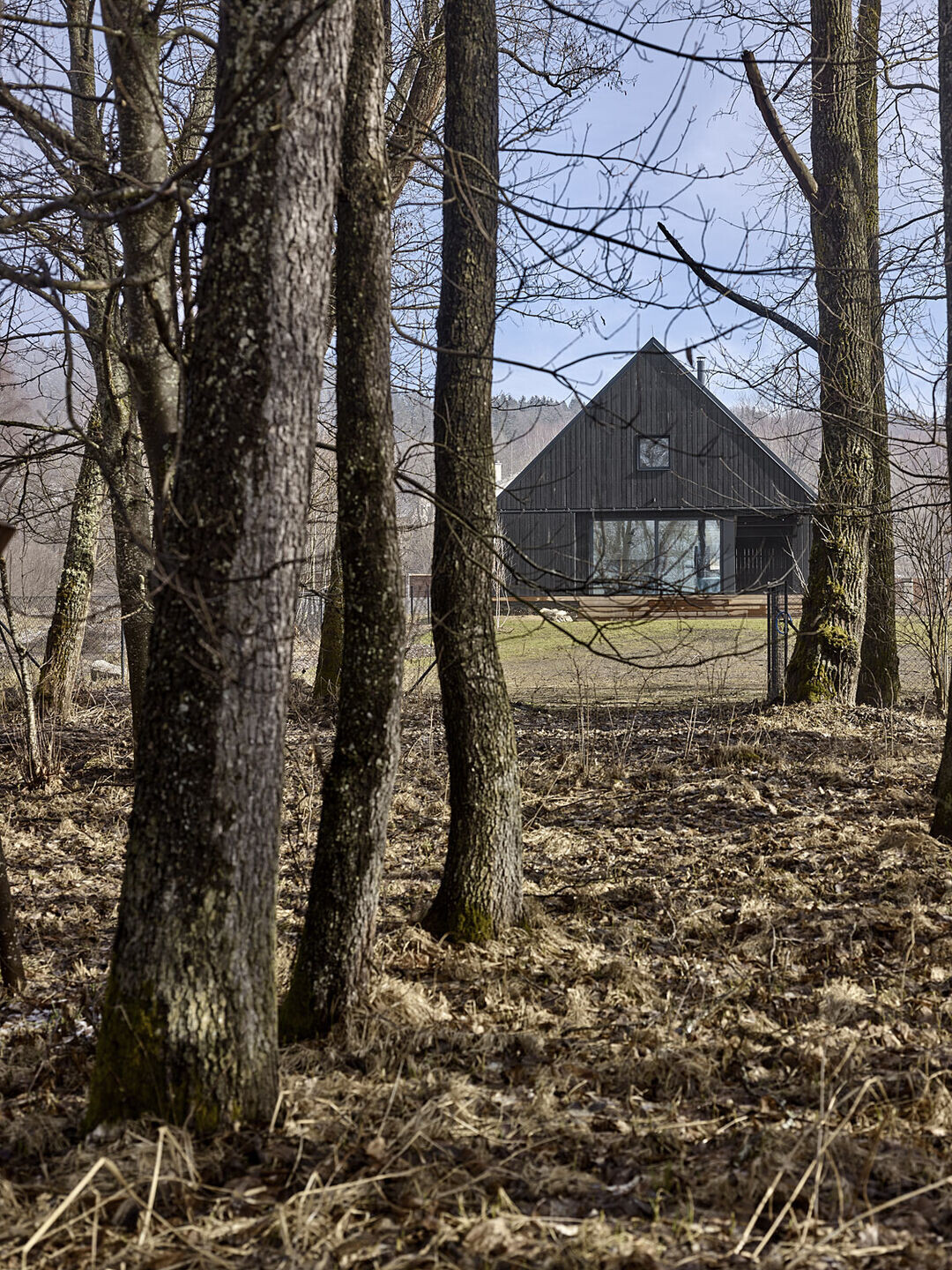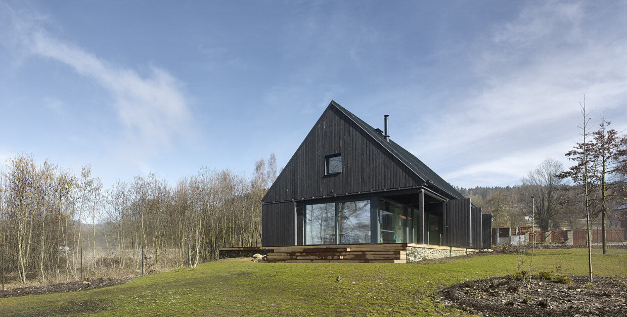 Delikatnie nachylona działka, położona w pobliżu jeziora Lipno, stanowi idealne tło dla tego nowoczesnego domu, starannie usytuowanego tak, aby główna przestrzeń mieszkalna zapewniała widok na taflę wody. Bryła budynku czerpie inspirację z tradycyjnych szumawskich chat, łącząc regionalną architekturę z nowoczesnym designem.