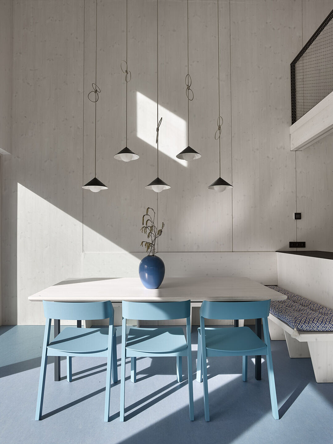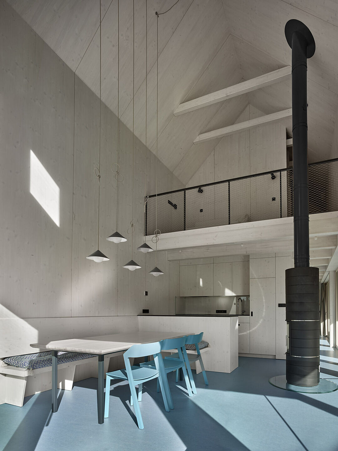 Parter został zaprojektowany jako otwarta, przestronna strefa dzienna, płynnie łącząca się z otoczeniem, z główną częścią rozciągającą się aż po kalenicę dachu. Na poddaszu znajdują się dwie przytulne sypialnie oraz galeria, która oferuje dodatkową przestrzeń użytkową. Przesuwne drewniane okiennice na parterze zapewniają mieszkańcom poczucie prywatności i bezpieczeństwa.