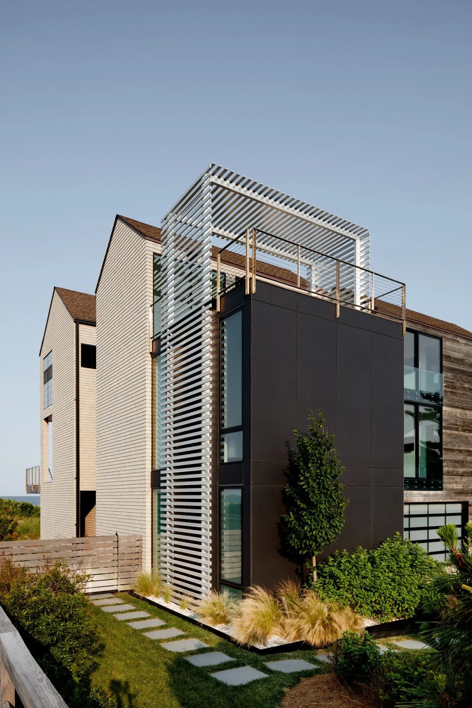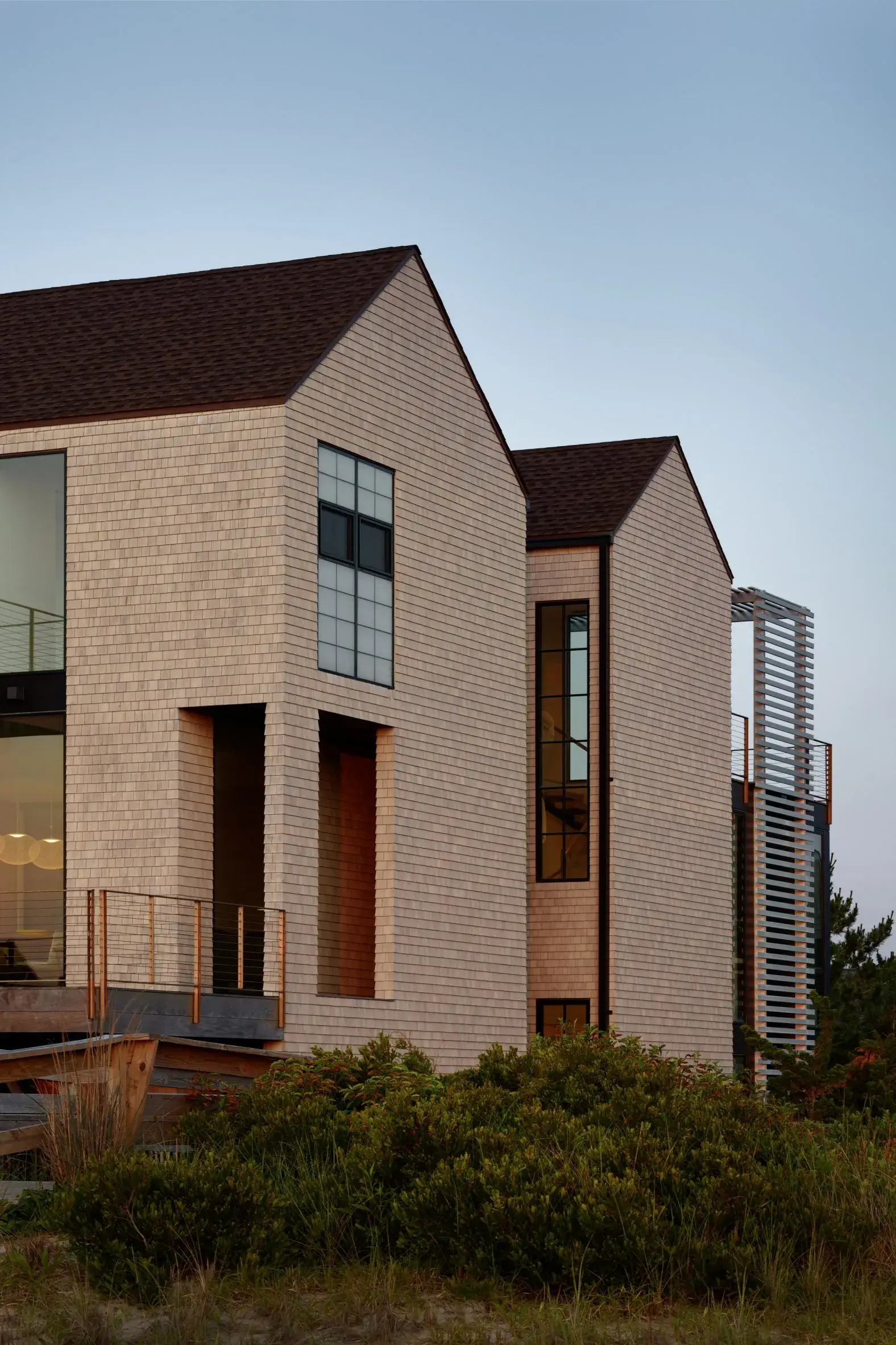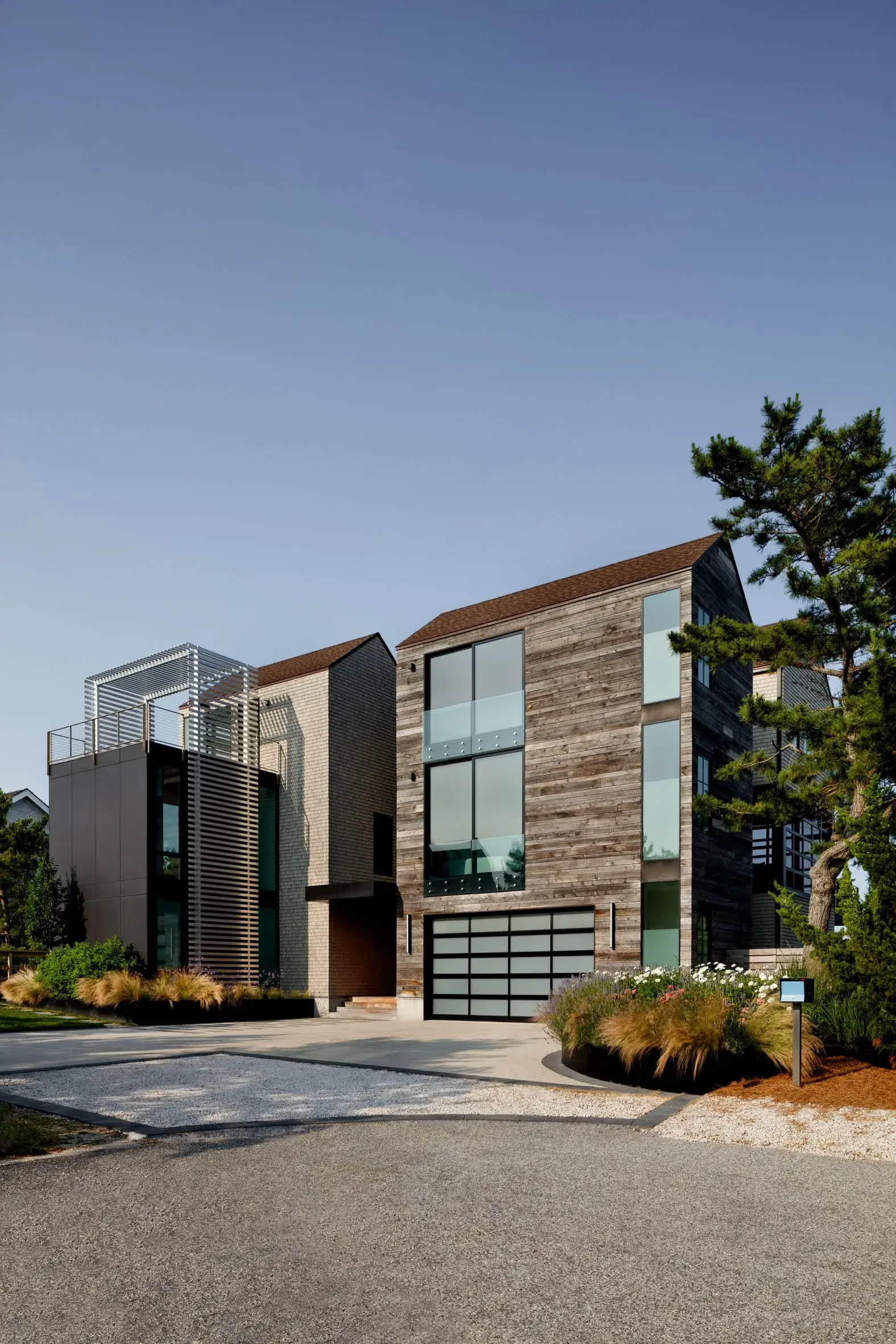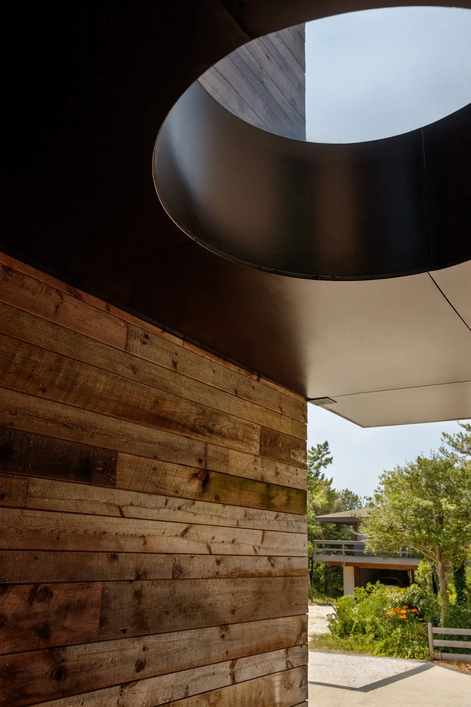 Budynek podzielono na kilka brył o dwuspadowym dachu, z przeszklonym łącznikiem pośrodku. Wzdłuż elewacji ulicy zespół dodał bryłę z płaskim dachem, zwieńczoną aluminiową kratą. Taras na dachu służy tam jako „scena, z której można podziwiać zachód słońca nad zachodnią zatoką”. Elewacje pokryto białym gontem cedrowym oraz drewnem odzyskanym ze stodoły w Delaware. Bryłę z kratą pokryto ciemnymi panelami włókno-cementowymi. Materiały te mają być trwałe i zrównoważone.