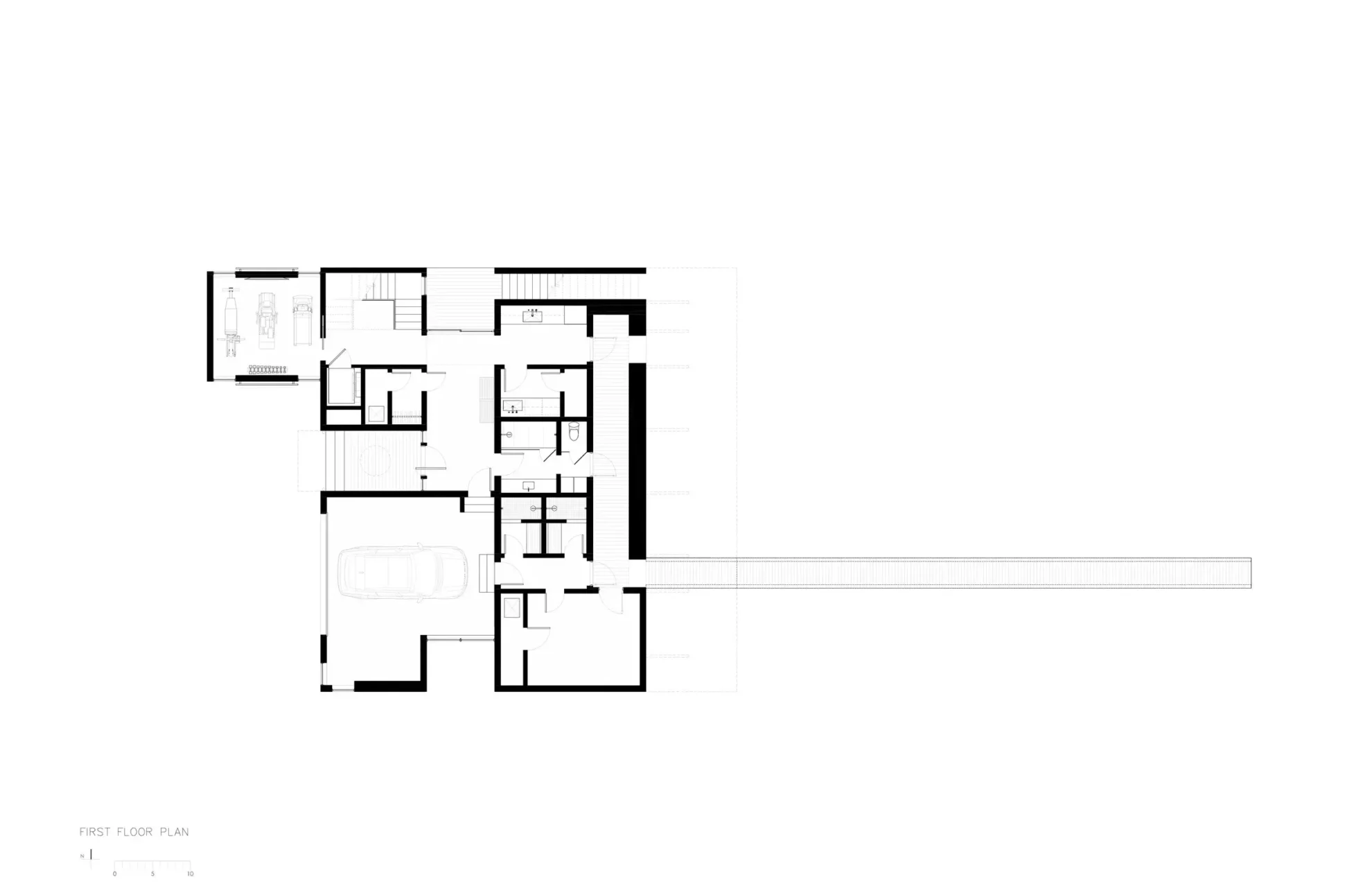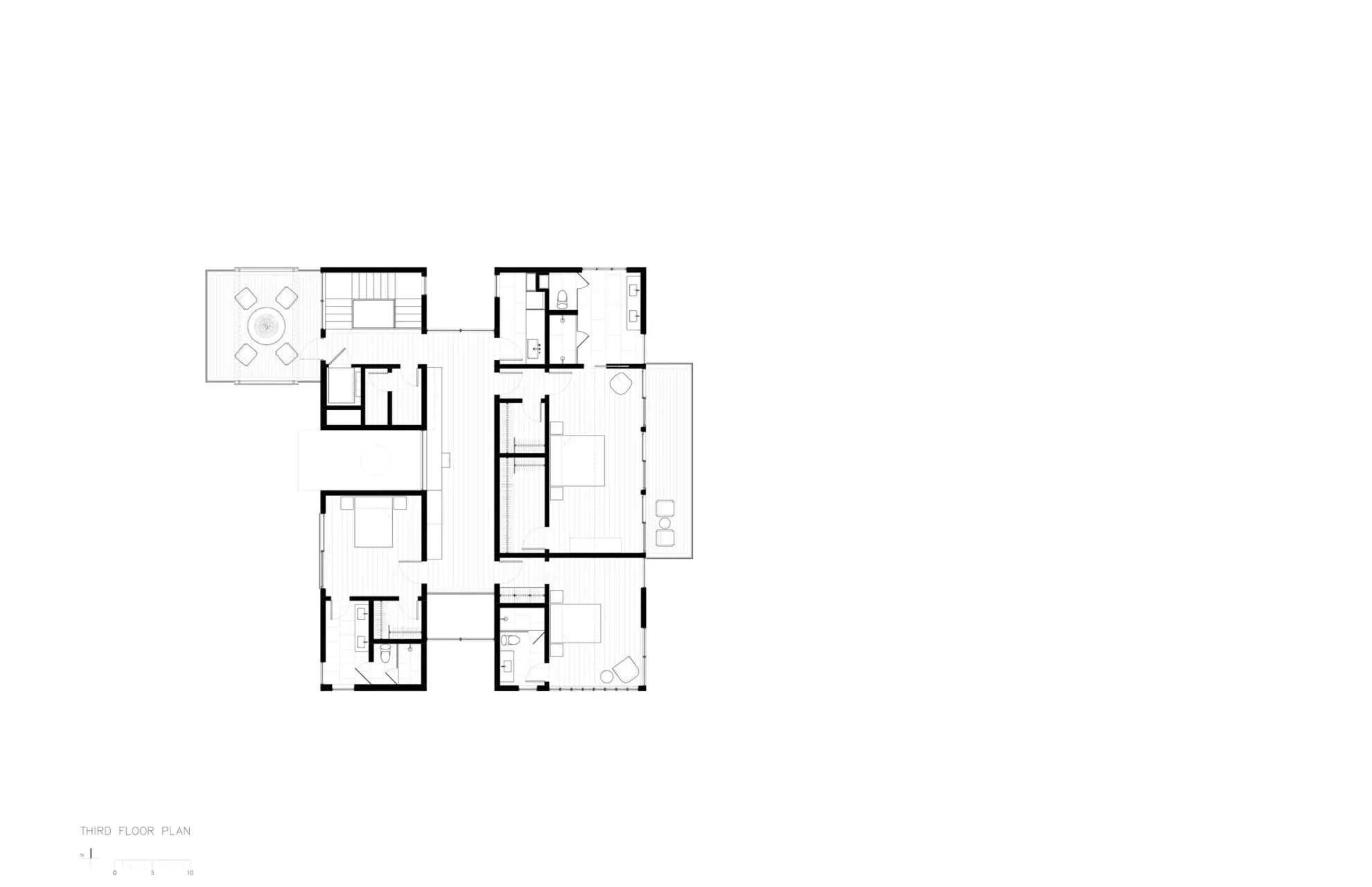 Wewnątrz na trzech poziomach znajduje się mieszanka przestrzeni publicznych i prywatnych. Na parterze znajduje się garaż, komórka lokatorska, siłownia, łazienka i mała kuchnia. Wyżej znalazła się główna strefa wspólna, przestrzeń medialna oraz sypialnia. Na samej górze znajduje się kilka dodatkowych sypialni oraz pralnia.
