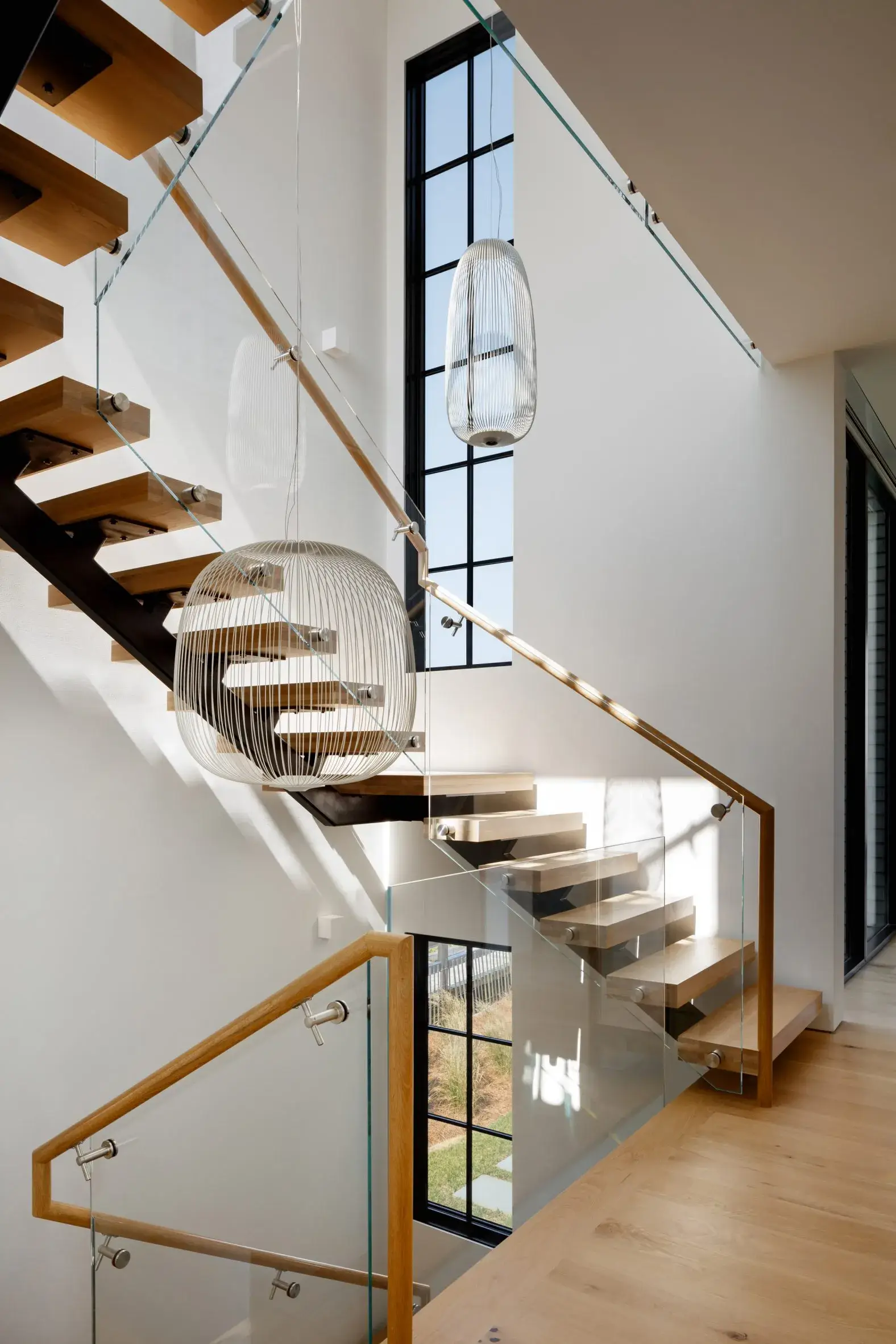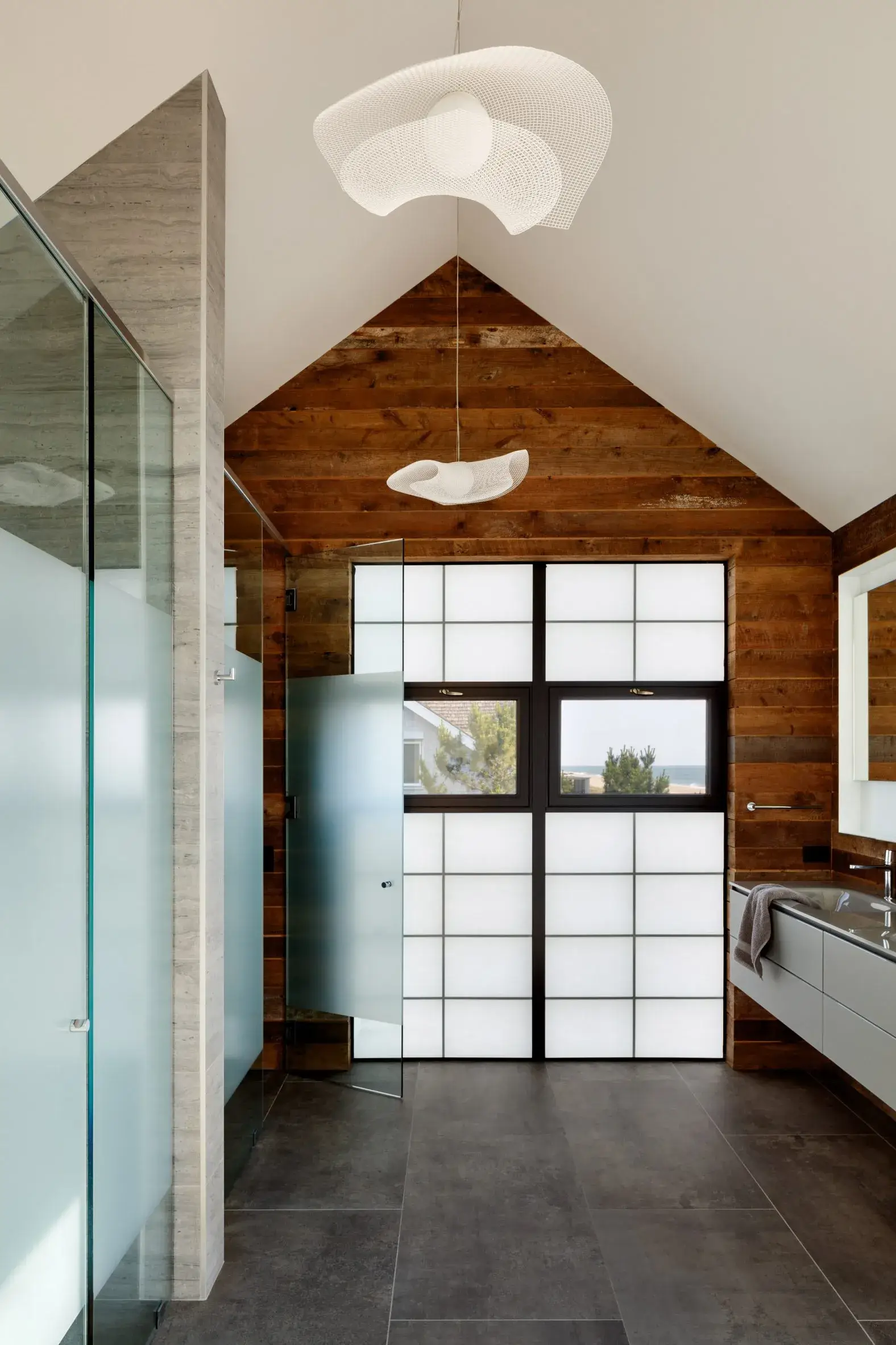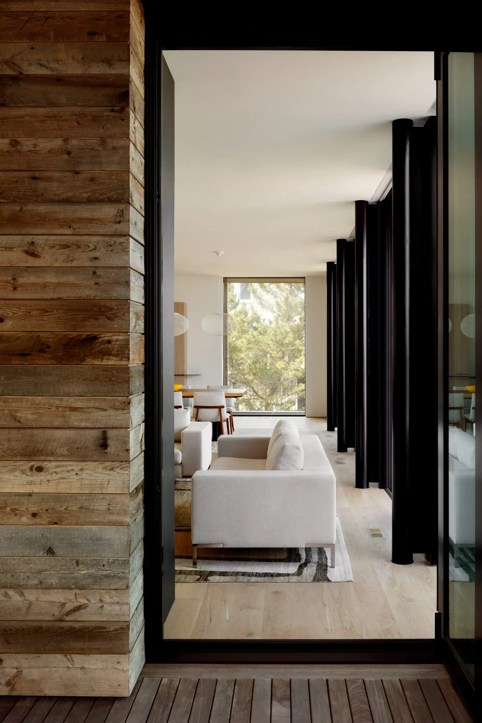 Wnętrze nowoczesnej stodoły charakteryzuje się ziemistymi wykończeniami, takimi jak podłoga z białego dębu i panele ścienne z odzyskanego drewna. Schody wykonano z białego dębu i stali. Centralny kominek posiada obudowę wykonaną ze stali. Duże przeszklenia pomagają zanurzyć mieszkańców w nadmorskim krajobrazie. „Duże okna zacierają granicę między wnętrzem a zewnętrzem, jednocześnie podkreślając momenty światła i cienia na płaszczyznach białych ścian” stwierdził zespół.