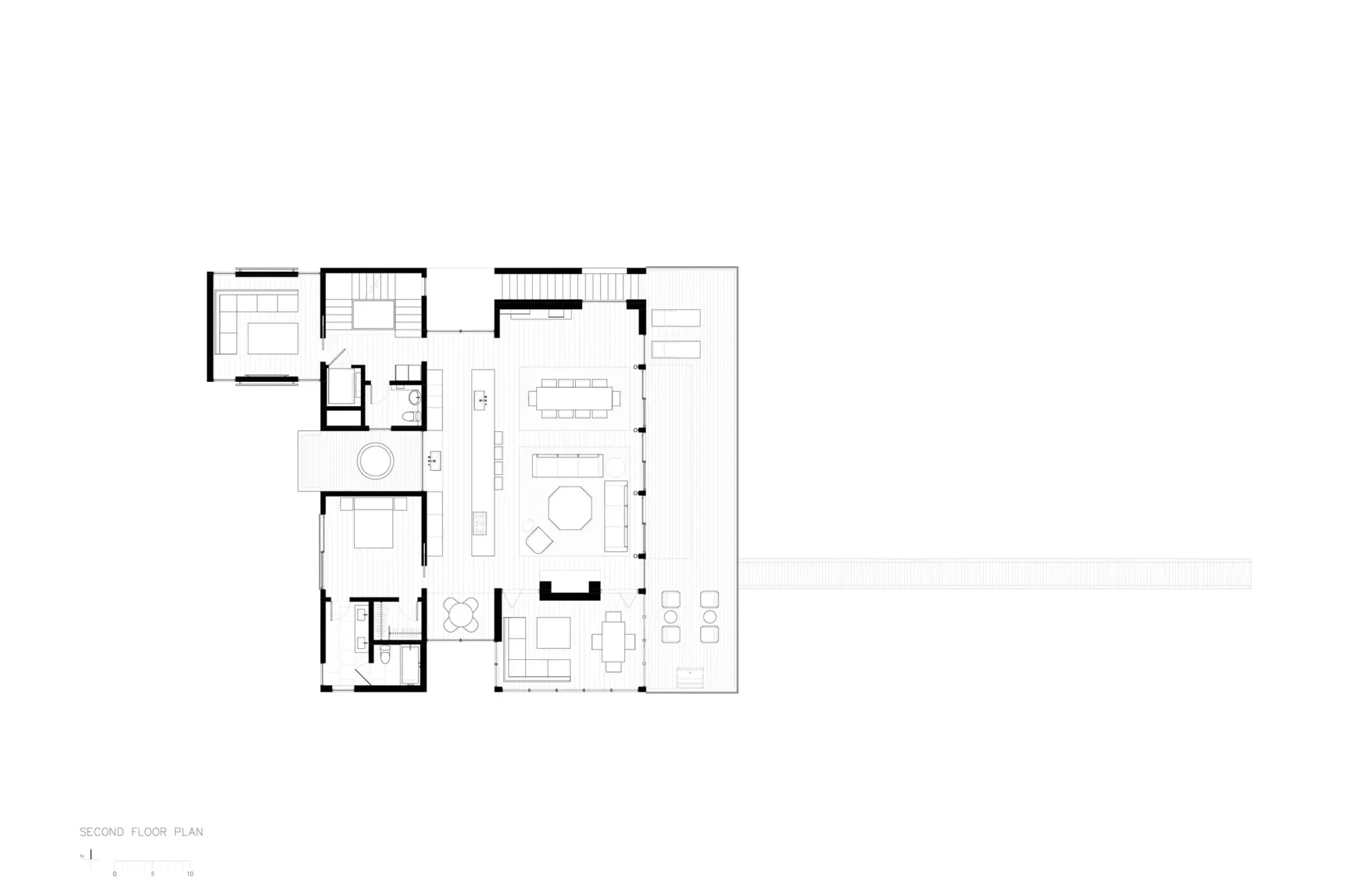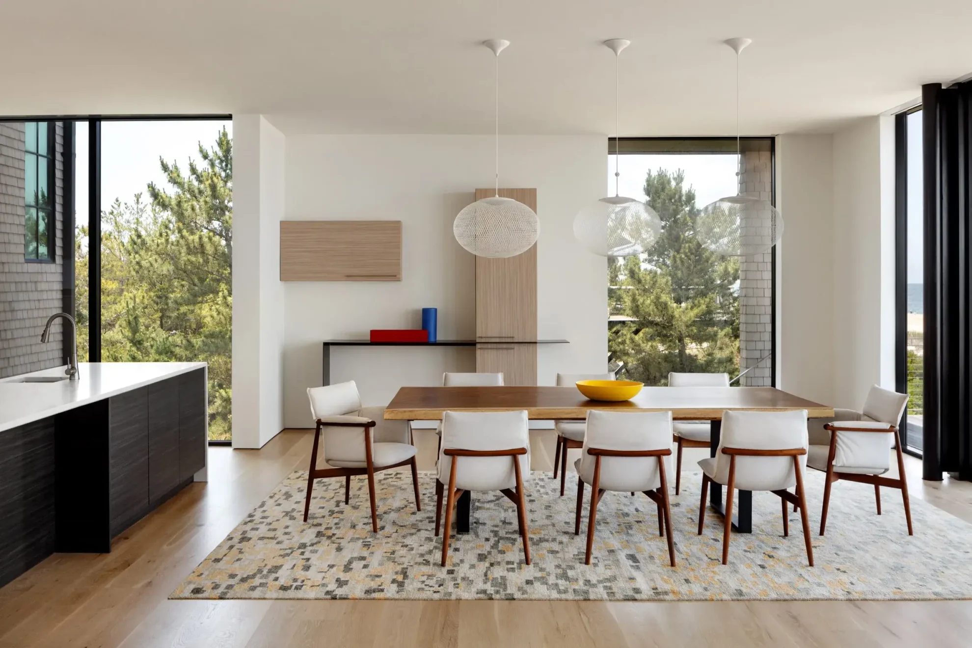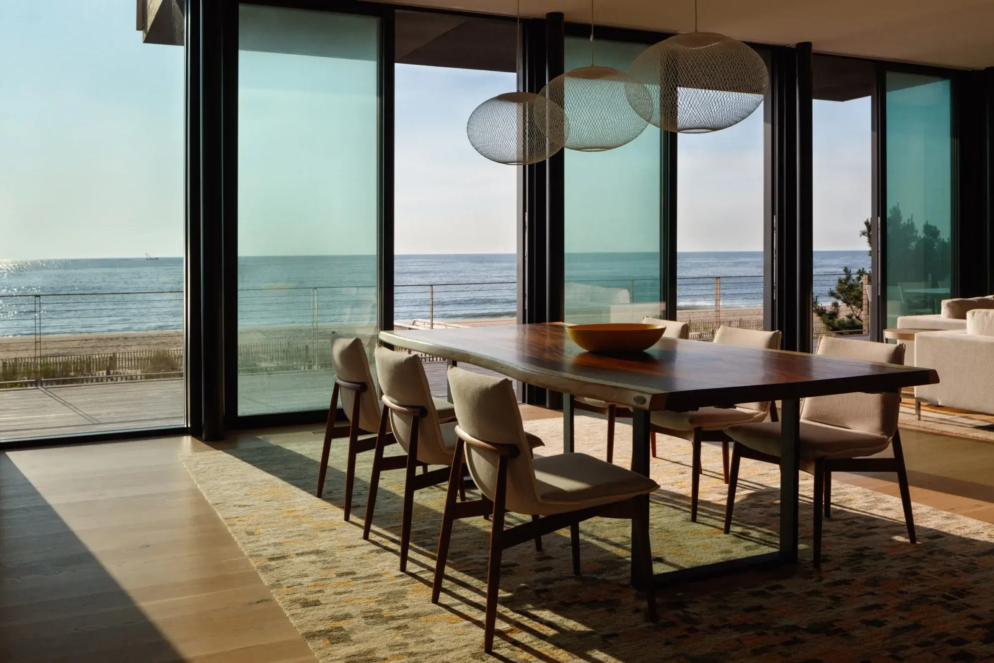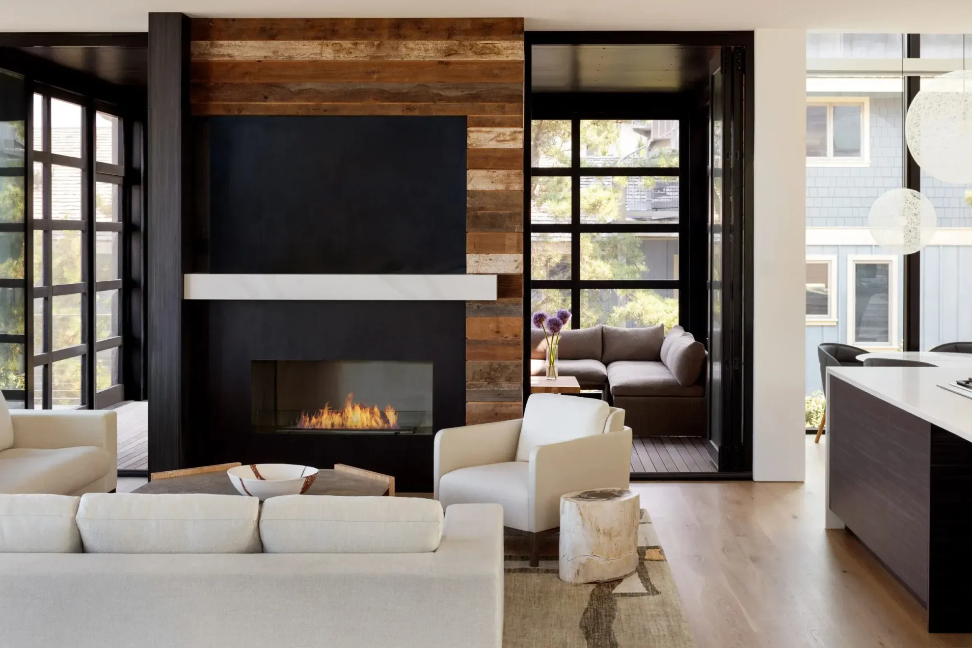 Wnętrze nowoczesnej stodoły charakteryzuje się ziemistymi wykończeniami, takimi jak podłoga z białego dębu i panele ścienne z odzyskanego drewna. Schody wykonano z białego dębu i stali. Centralny kominek posiada obudowę wykonaną ze stali. Duże przeszklenia pomagają zanurzyć mieszkańców w nadmorskim krajobrazie. „Duże okna zacierają granicę między wnętrzem a zewnętrzem, jednocześnie podkreślając momenty światła i cienia na płaszczyznach białych ścian” stwierdził zespół.