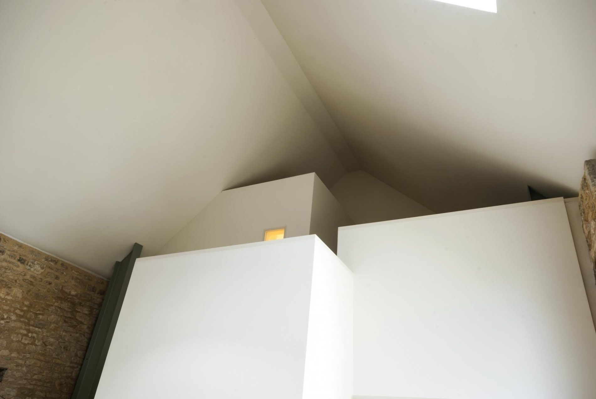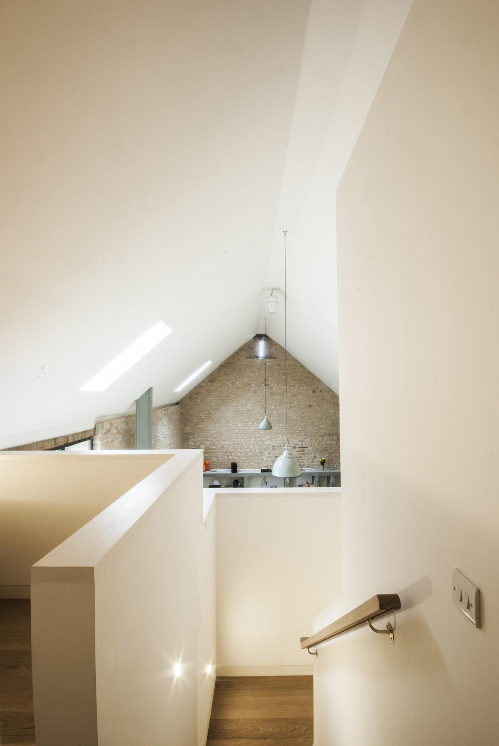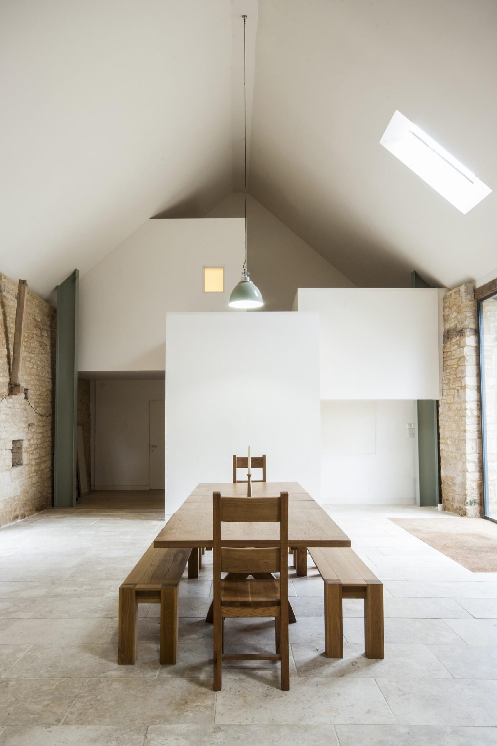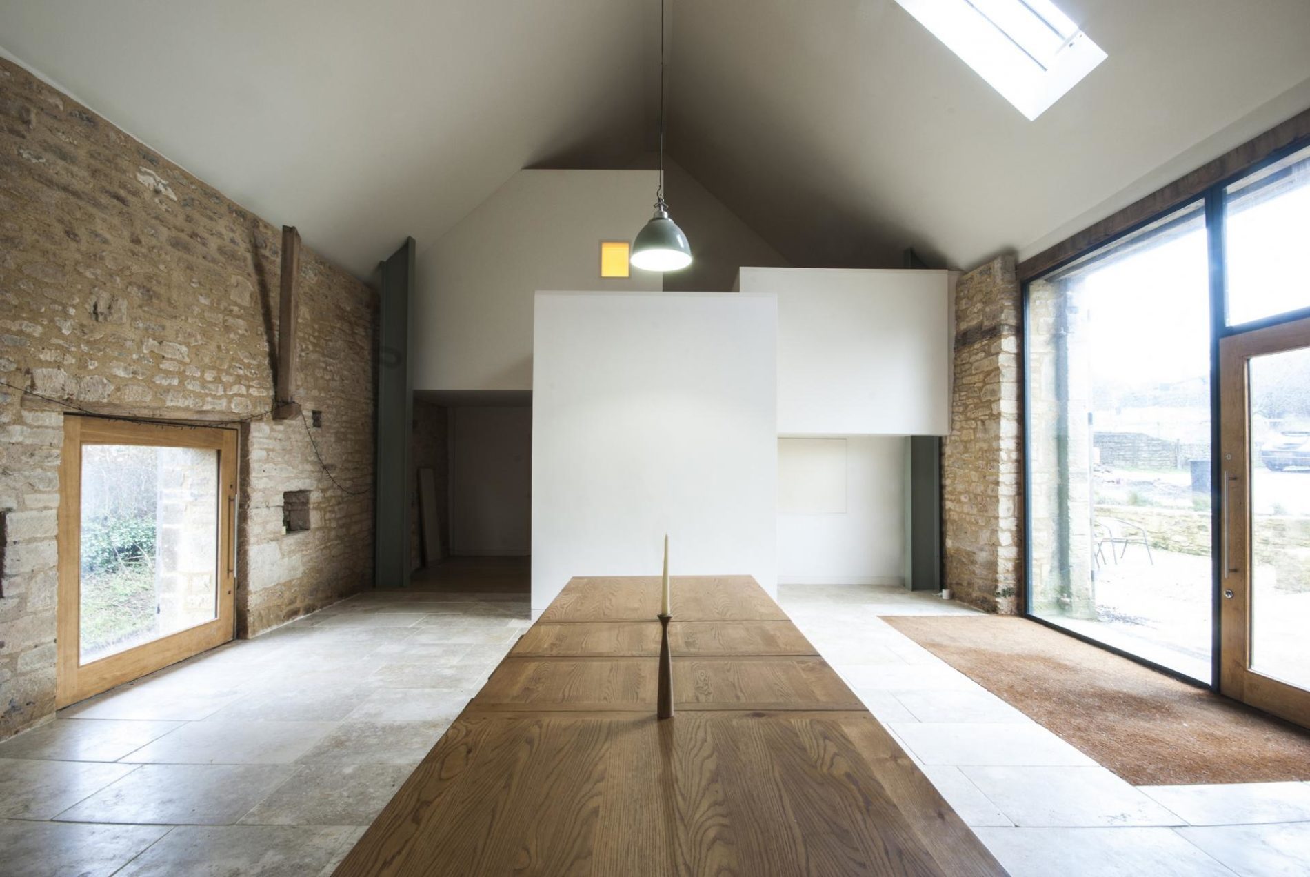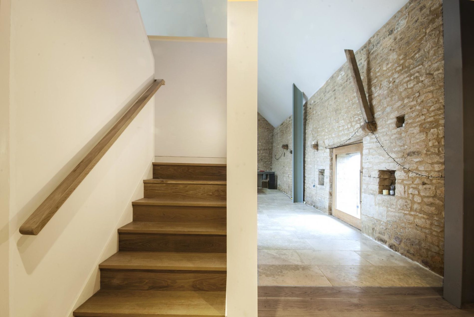 Nowe ściany w odremontowanej stodole są wykonane z pomalowanego gipsu, a podłoga na górze została zrobiona z desek. „Przypadkowo” poukładane kamienne płyty na podłodze na parterze ciągną się przez całą długość stodoły. Wewnętrzna strona nowego dachu wykończona została płytami gipsowymi, które podkreślają nowe elementy. Stare, kamienne ściany zostały gruntownie odnowione i pozostały od środka odsłonięte, przypominając o dawnym charakterze tego budynku. Od zachodu kamienne ściany zostały jednak ukryte, by poprawić wydajność energetyczną całego budynku.