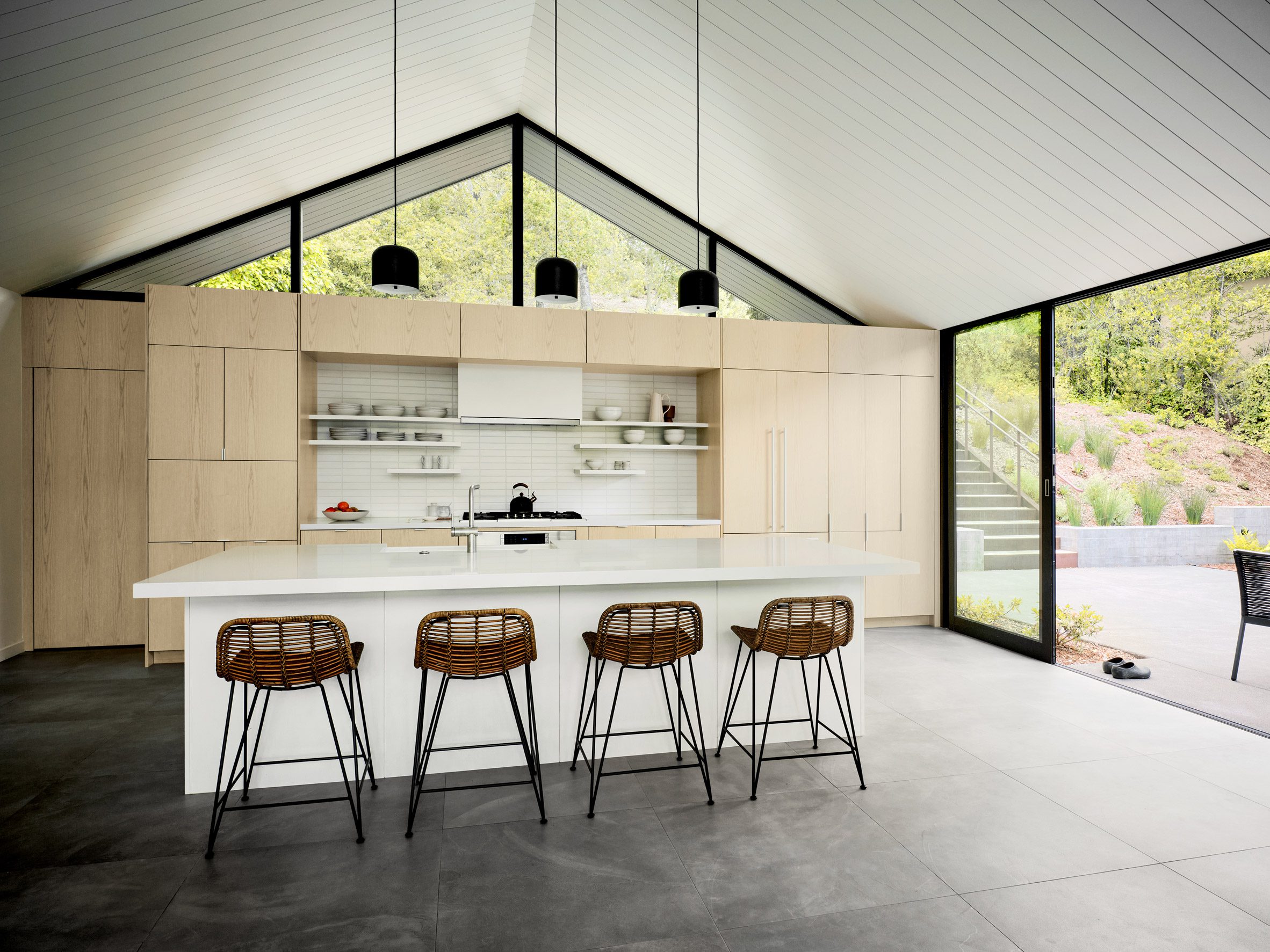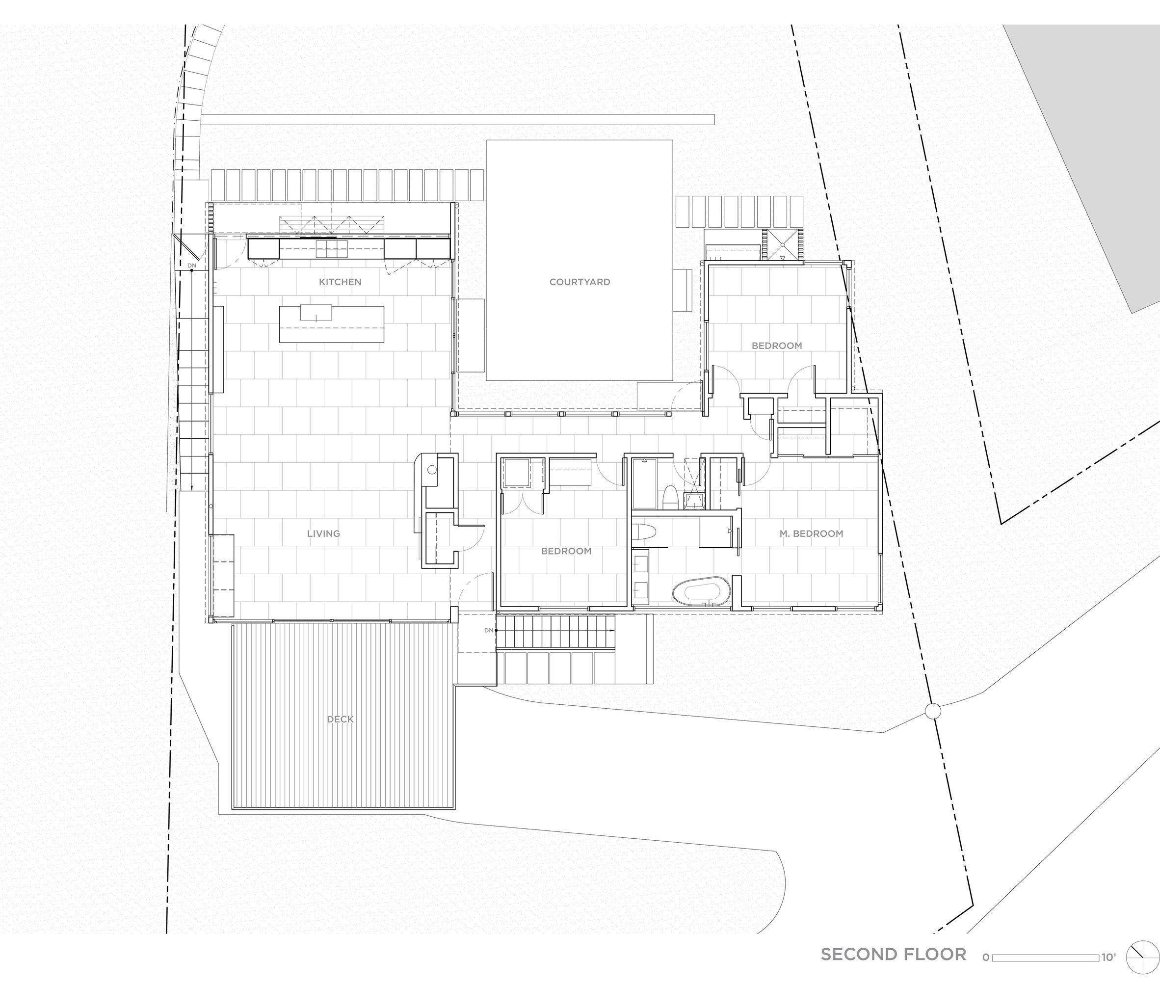Zaprojektowany dla pary z dwójką małych dzieci, projekt oszczędny obejmował renowację domu w stylu podmiejskim, który „pilnie potrzebował modernizacji”. Celem było stworzenie mieszkania, które wspierałoby bieżące potrzeby rodziny, jednocześnie biorąc pod uwagę to, co może być potrzebne w przyszłości. Zbudowany na zboczu wzgórza dom ma plan w kształcie litery U, z dwuspadowymi bryłami zorganizowanymi wokół centralnego dziedzińca.