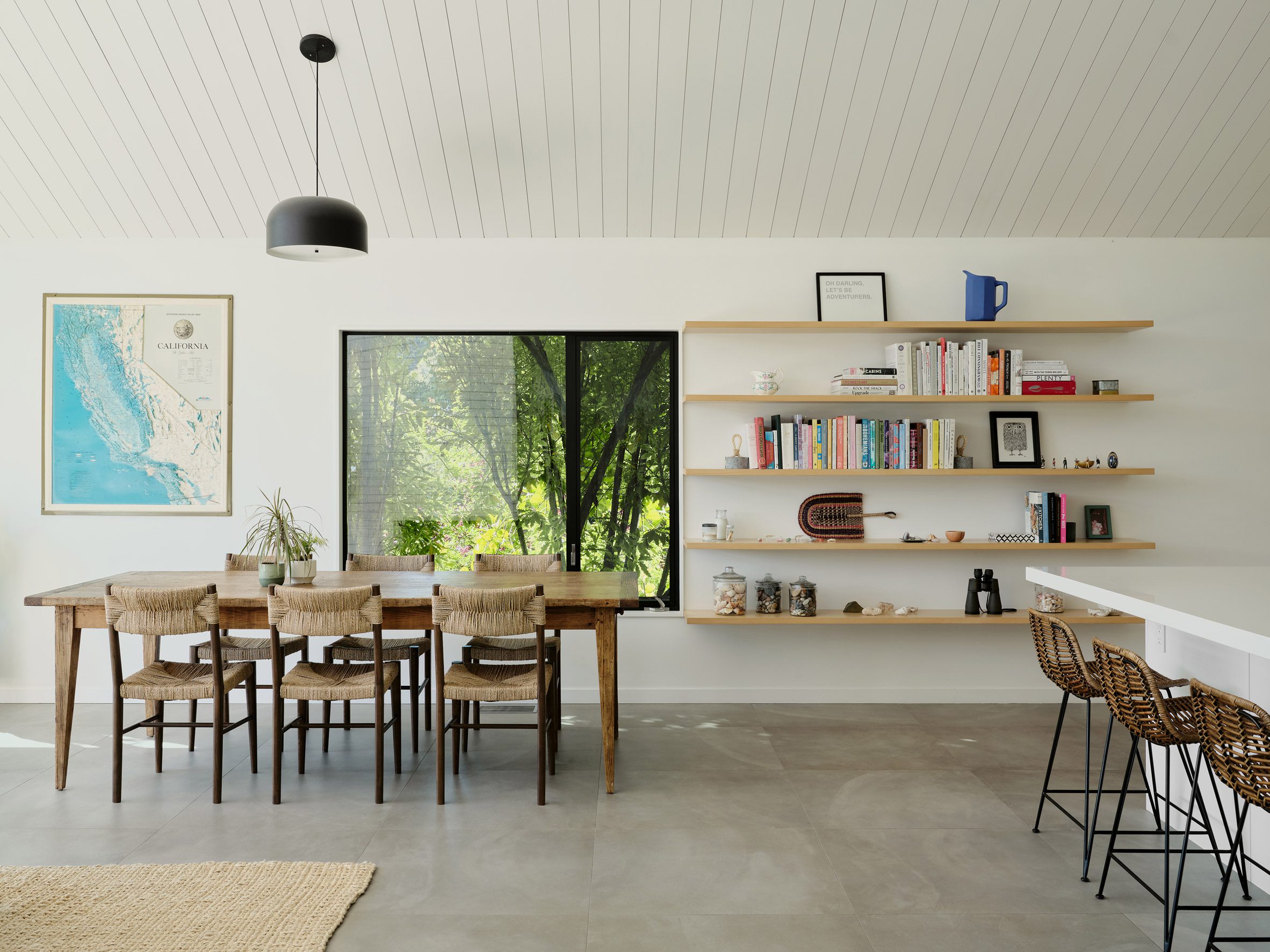 Wnętrze domu o powierzchni 174 metrów kwadratowych charakteryzuje się wyraźnym podziałem na strefy publiczną i prywatną. Na poziomie głównym jedna strona mieści kuchnię z otwartą przestrzenią, jadalnię i salon, podczas gdy druga obejmuje trzy sypialnie. Na poziomie parteru znajduje się pokój rodzinny i garaż. Wykończenia wnętrz obejmują szafki z jesionu, wielkoformatowe płytki podłogowe z porcelany i płytki ceramiczne wokół kominka. Wysokie sufity i duże przeszklenia zapewniają wrażenie przestronności.