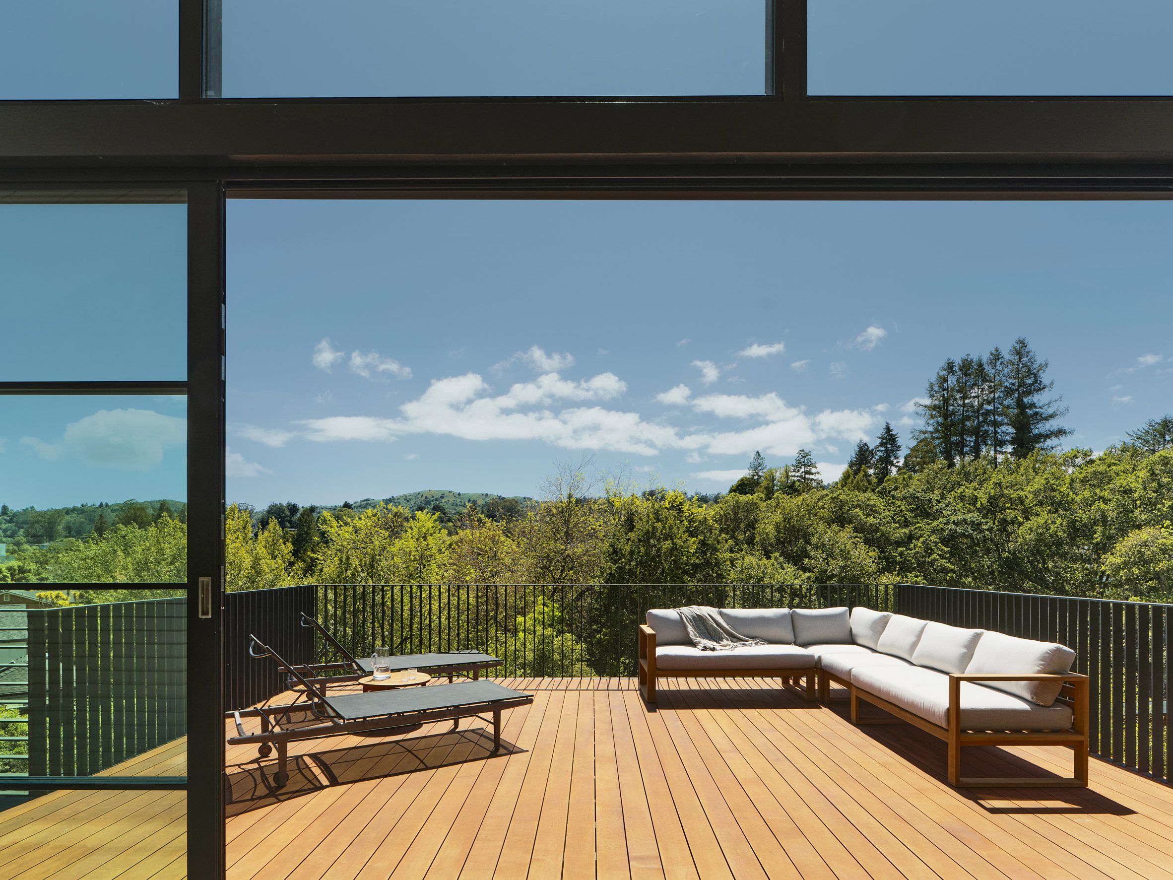 Przestrzenie zewnętrzne obejmują przestronny taras skierowany na południe, który otrzymuje jasne światło słoneczne. Łagodniejsze światło wpada przez dziedziniec na północy.