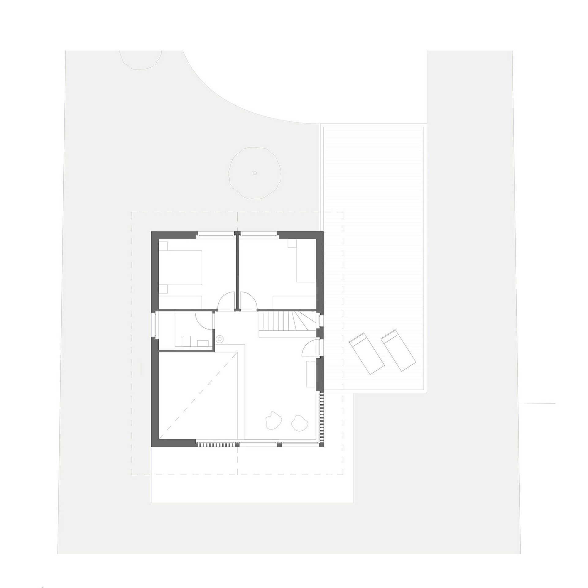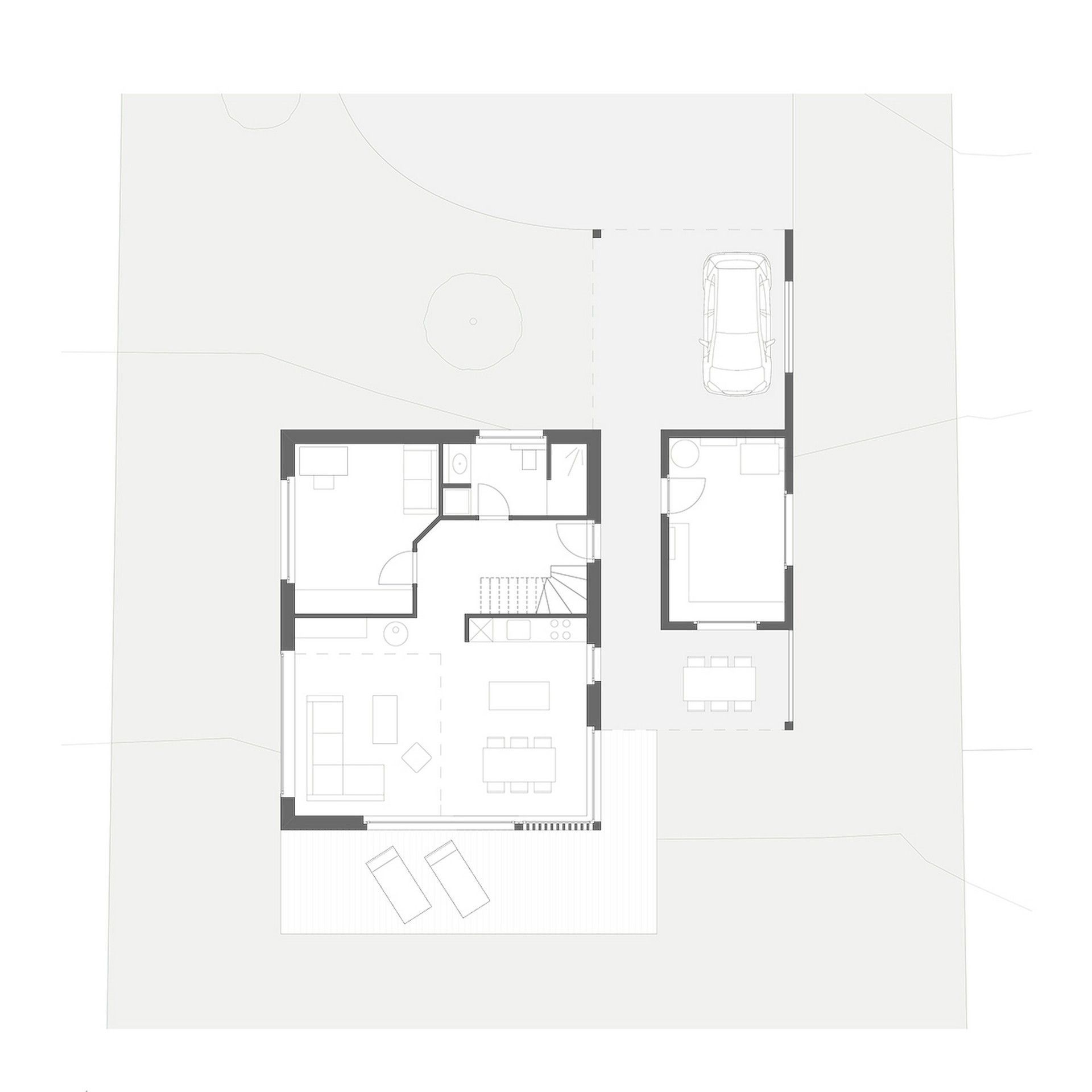 Przestrzenie dzienne w tym domu znajdują się na parterze. Duży salon ma podwójną wysokość, która pozwala wyeksponować belki konstrukcji. Na pierwszym piętrze są pokoje domowników oraz antresola z balkonem nad salonem. Dom otoczono trzema tarasami, które mają zadaszenie i są przedłużeniem przestrzeni wewnętrznej. Garaż oraz pomieszczenie techniczne znajdują się poza głównym budynkiem, aby zwiększyć przestrzeń użytkową. Ze względu na ograniczenia czasowe oraz budżetowe, cała budowa została zakończona w ciągu zaledwie ośmiu miesięcy.