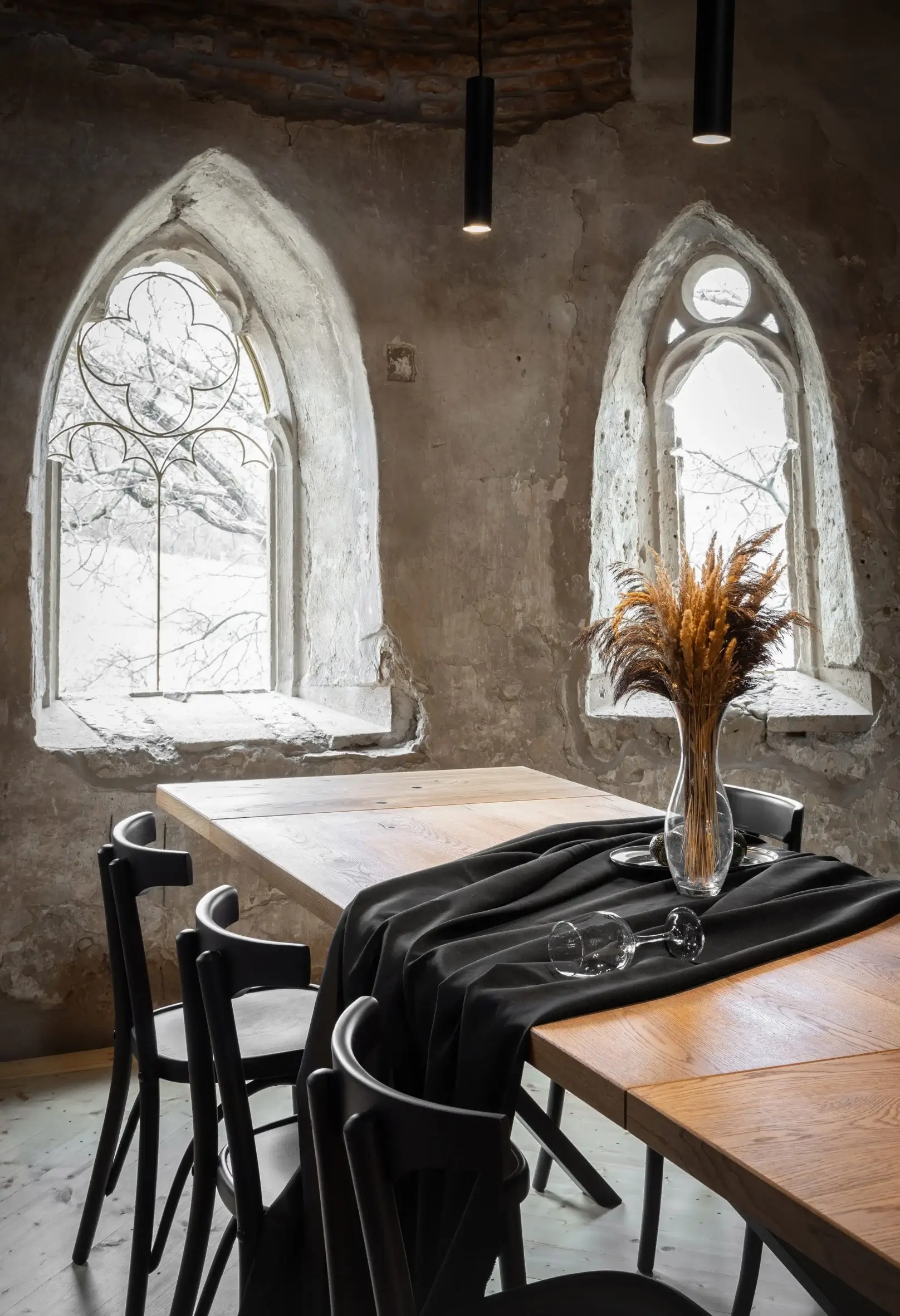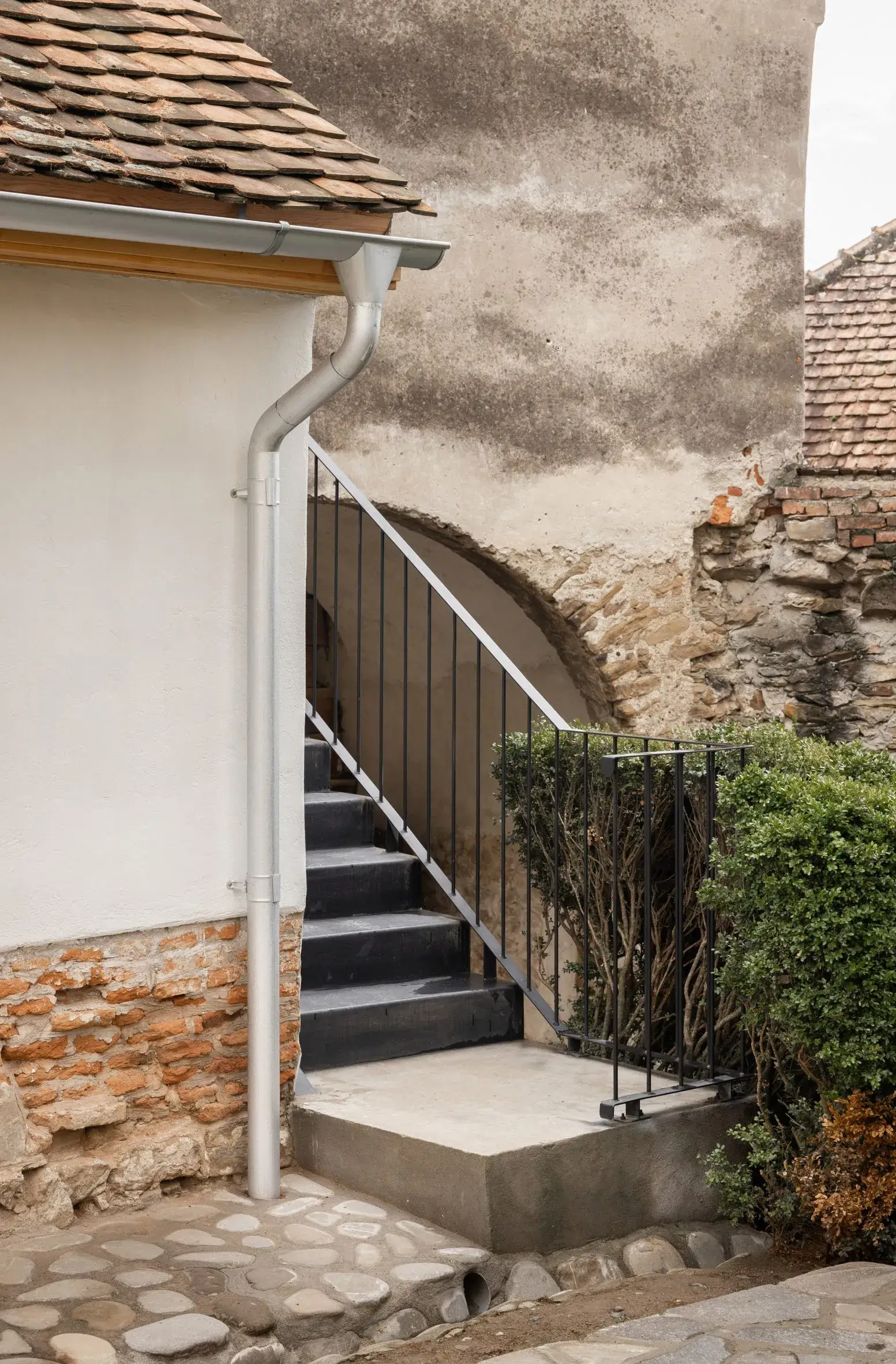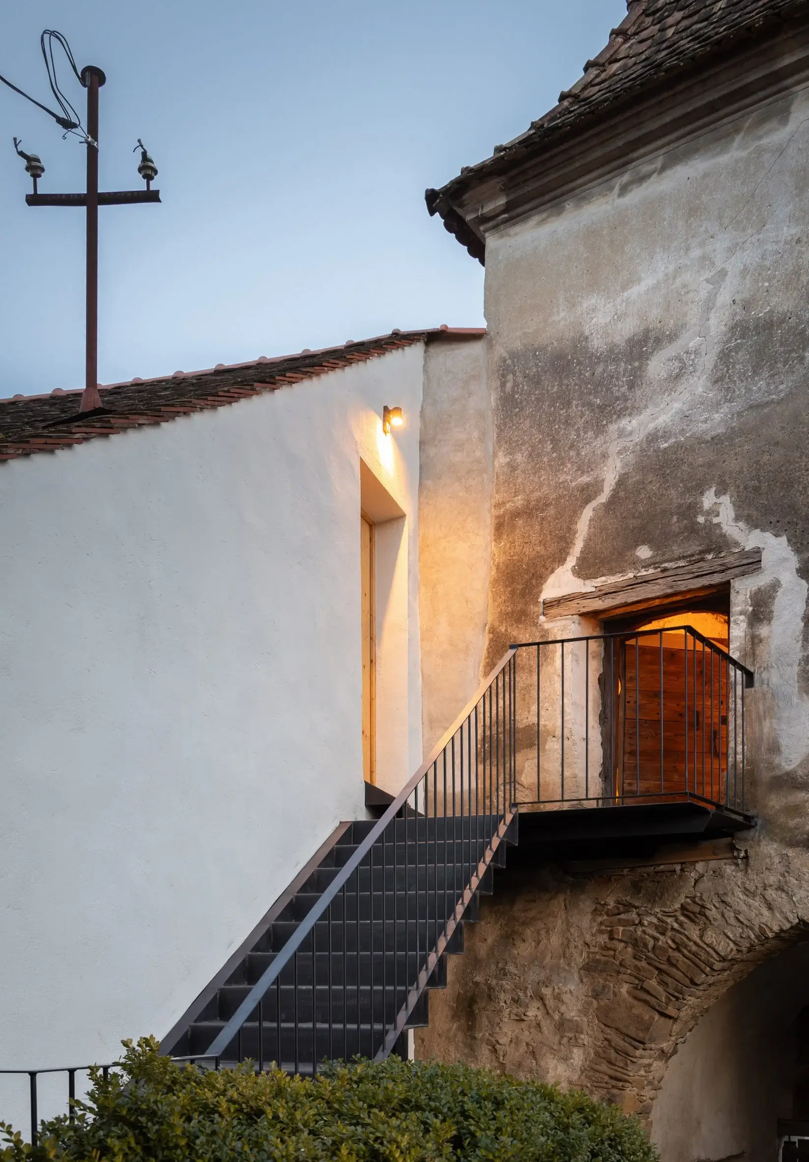 W istniejącej plebanii dokonano szeregu minimalnych zmian, tworząc przestrzeń dla dwuosobowej sypialni obok kuchni i jadalni. Wystająca poza ścianę graniczną terenu wielokątna absyda dawnej kaplicy mieści obecnie główną część mieszkalną. Trzy gotyckie okna otaczające tę przestrzeń odrestaurowano za pomocą metalowych ram. Starą plebanię ponownie otynkowano. Jej drzwi i okiennice ozdobiono jasnym drewnem, co kontrastuje z surową, murowaną fasadą kaplicy i wieży bramnej.