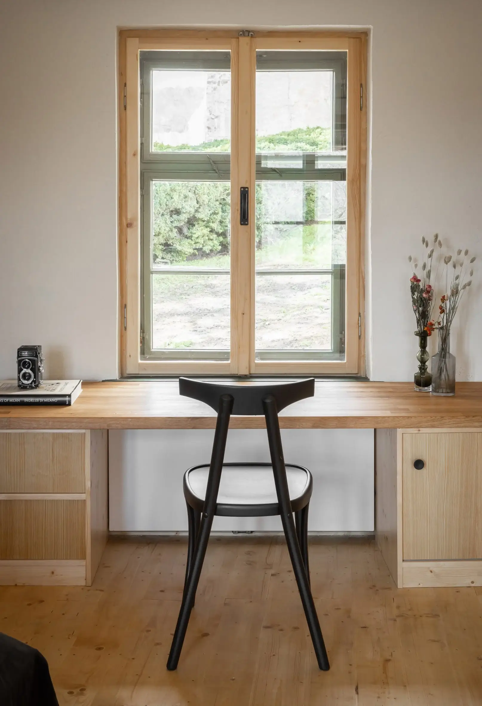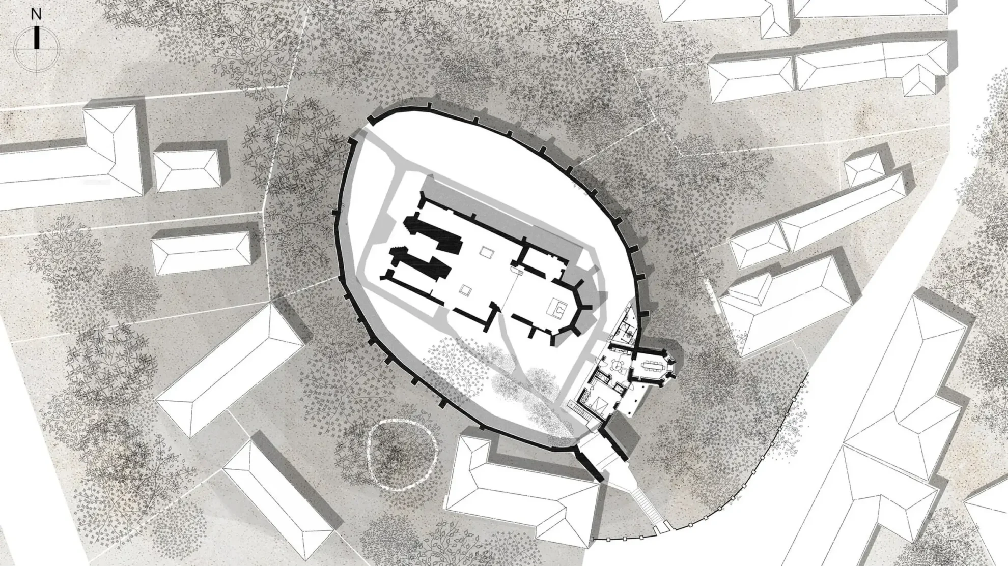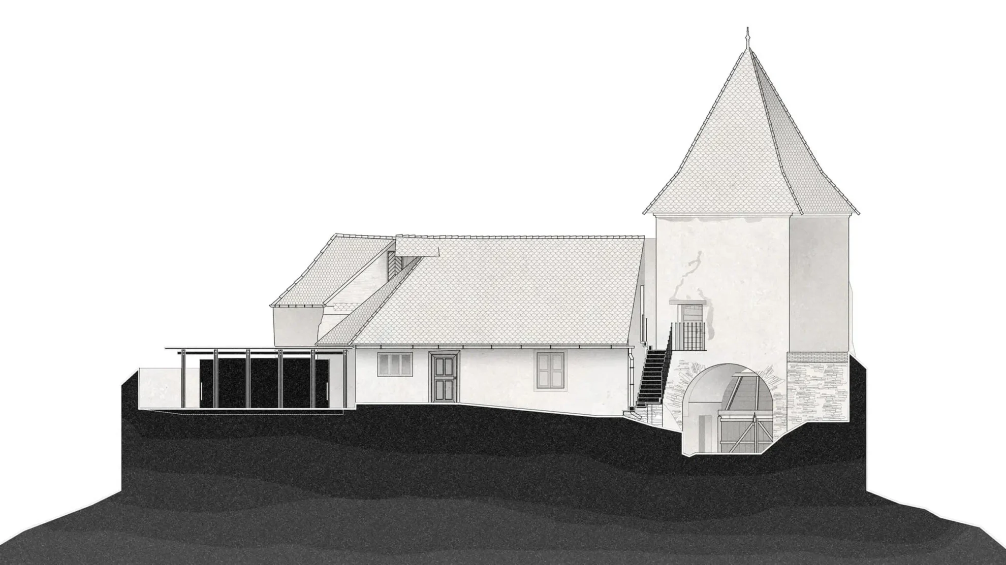 W istniejącej plebanii dokonano szeregu minimalnych zmian, tworząc przestrzeń dla dwuosobowej sypialni obok kuchni i jadalni. Wystająca poza ścianę graniczną terenu wielokątna absyda dawnej kaplicy mieści obecnie główną część mieszkalną. Trzy gotyckie okna otaczające tę przestrzeń odrestaurowano za pomocą metalowych ram. Starą plebanię ponownie otynkowano. Jej drzwi i okiennice ozdobiono jasnym drewnem, co kontrastuje z surową, murowaną fasadą kaplicy i wieży bramnej.