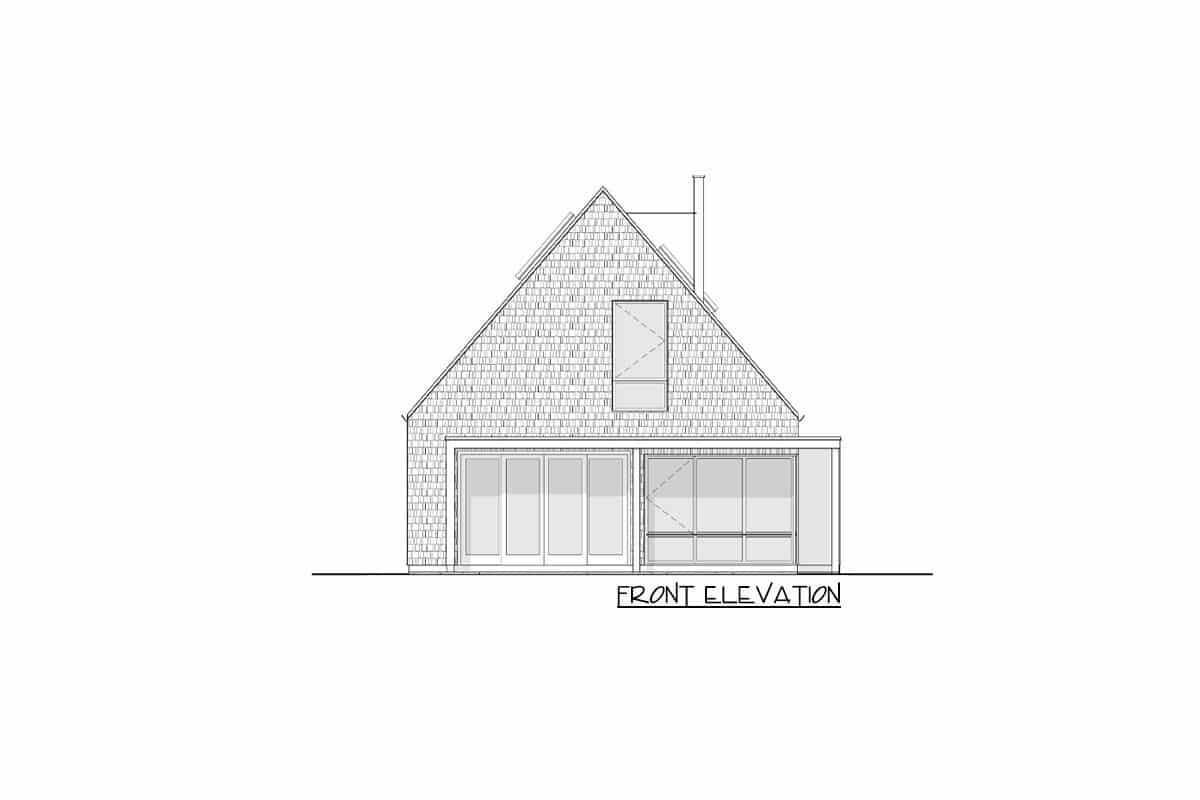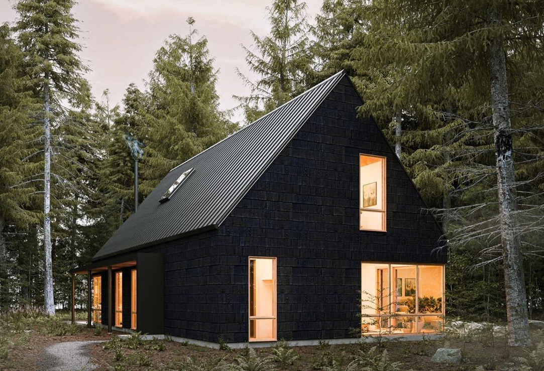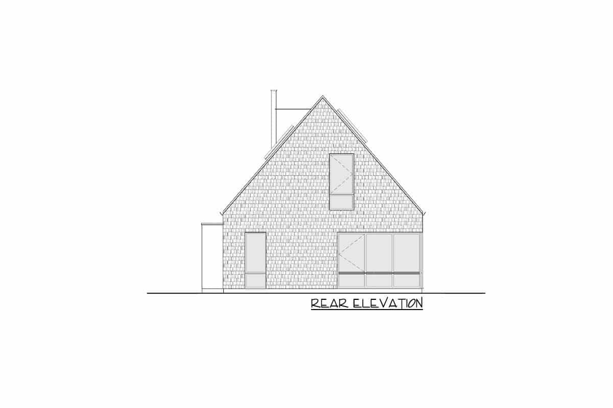 Ten projekt domu autorstwa Architectural Designs to nowoczesna interpretacja klasycznej zabudowy wiejskiej. Bryła nawiązuje do estetyki, jaką prezentuje nowoczesna stodoła – prosta forma, czarna elewacja z gontu, duże przeszklenia oraz wyraźne połączenie wnętrza z otoczeniem. Przestronne otwarte patio z miejscem do wypoczynku na świeżym powietrzu stanowi naturalne przedłużenie strefy dziennej. Wnętrze zaplanowano z myślą o wygodzie użytkowania – główna sypialnia znajduje się tuż przy wejściu, a naprzeciwko niej umieszczono pralnię, toaletę oraz klatkę schodową prowadzącą na piętro.