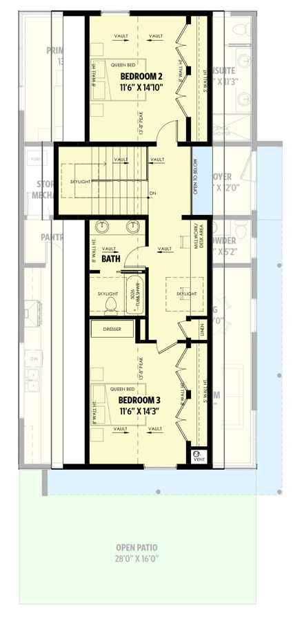 Na górze zaprojektowano dwie sypialnie, które współdzielą funkcjonalną łazienkę z podwójną toaletką, a dodatkowa przestrzeń typu loft z wbudowanym biurkiem i świetlikiem dachowym stanowi idealne miejsce do pracy zdalnej lub nauki. Ten dom to doskonałe połączenie nowoczesnego designu z funkcjonalnością – dzięki dużym oknom, naturalnemu doświetleniu i przemyślanemu układowi pomieszczeń sprawdzi się zarówno dla rodzin z dziećmi, jak i osób szukających minimalistycznej, ale przytulnej przestrzeni.