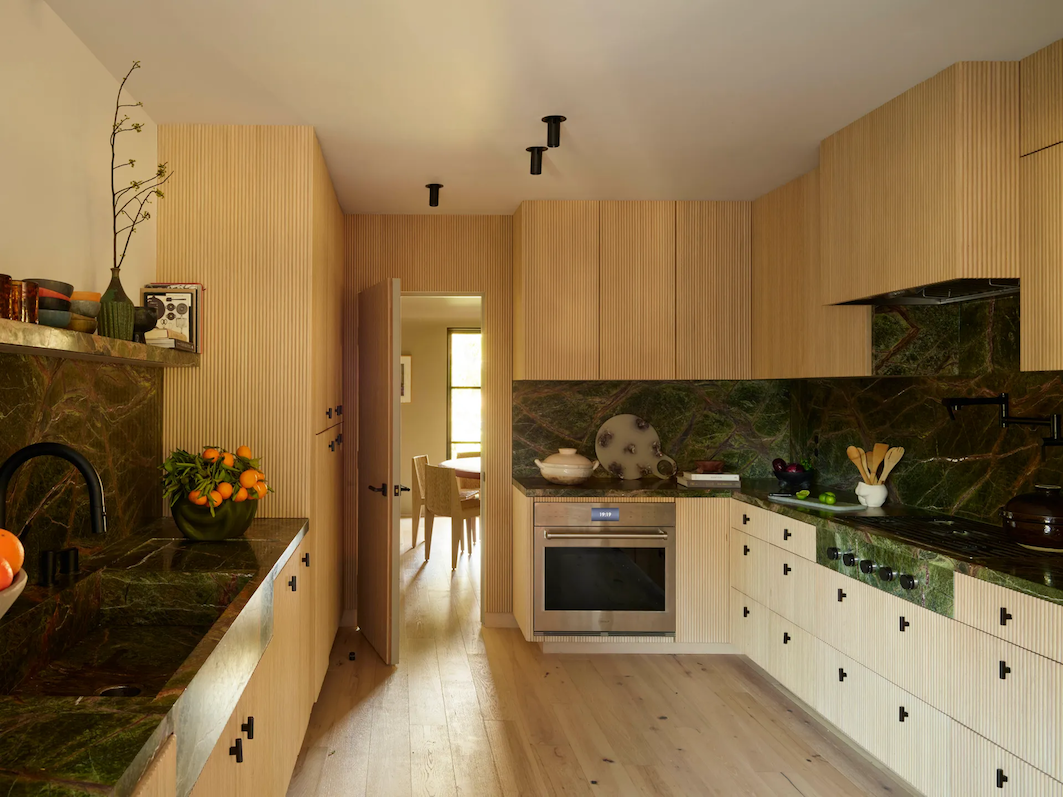 Farca i Calderón wzięli na siebie również wyzwanie związane z połączeniem wnętrz z otoczeniem. „W poprzednim układzie nie było żadnego połączenia między wnętrzem a pięknym krajobrazem. Postanowiliśmy otworzyć przestrzeń jak tylko się dało” – tłumaczy Farca. Dom został zaprojektowany tak, by w pełni wykorzystywał dostępną przestrzeń. Chociaż poszczególne pomieszczenia zostały oddzielone ścianami, to zachowano poczucie wzajemnych powiązań przestrzennych. Kolory zmieniają się płynnie z czarnego na zielony, w miarę jak przechodzimy z salonu do kuchni. Zmiana barw jest podkreślona przez boazerię i marmurowe blaty, które łączą estetykę wnętrza z atmosferą zewnętrzną.