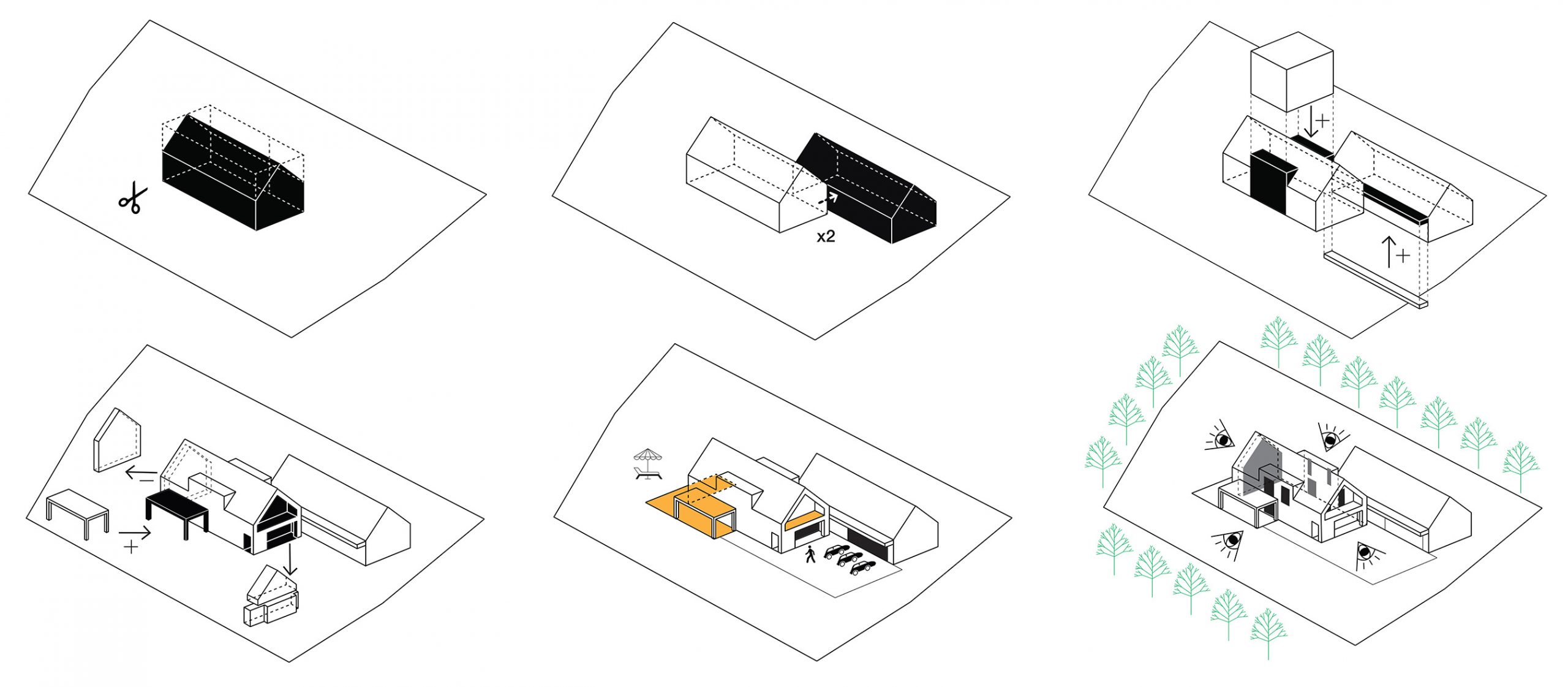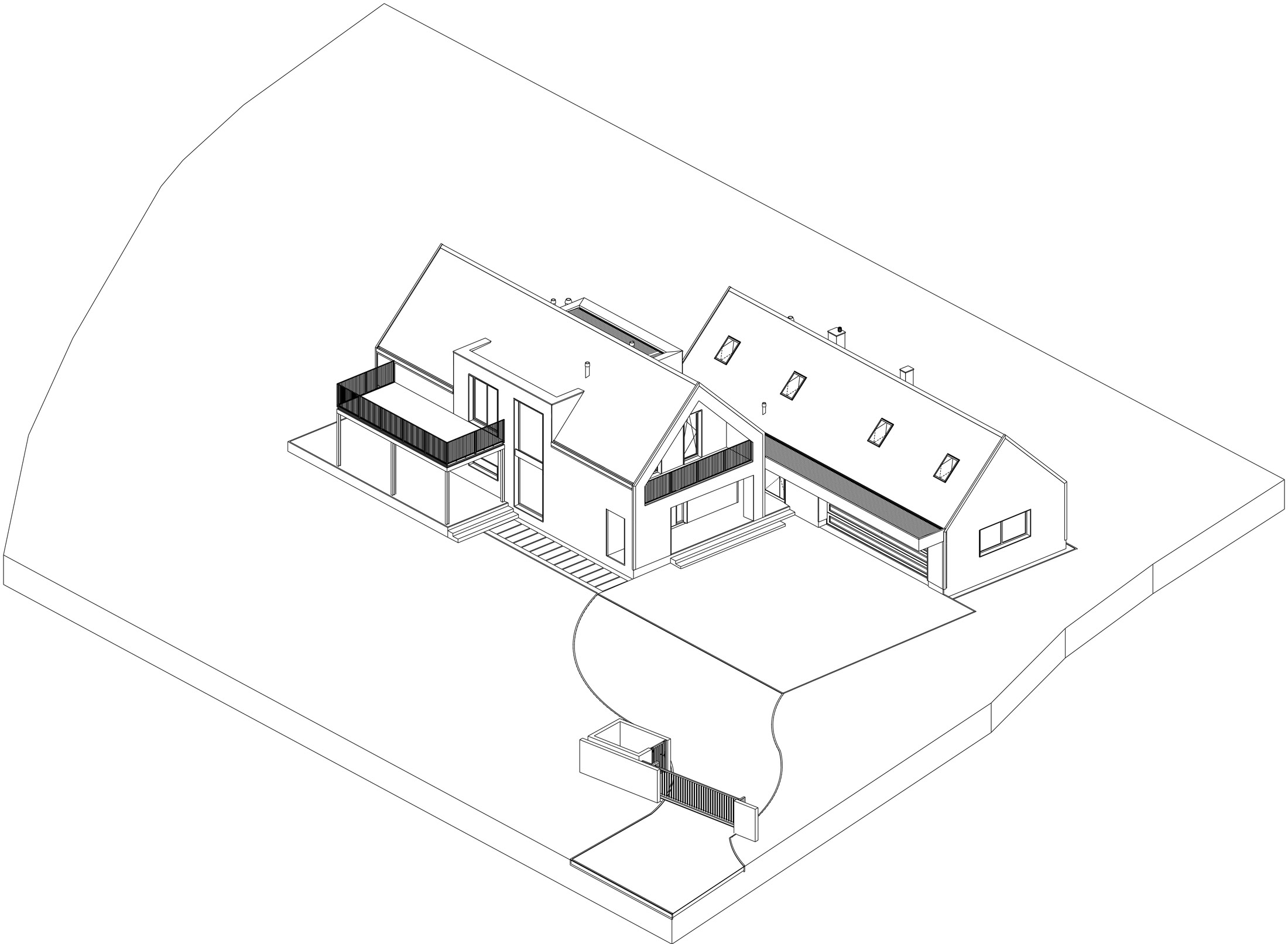 Założenie składa się z dwóch głównych brył o prostych, archetypicznych formach przykrytych dwuspadowymi dachami o kącie nachylenia 45°. Jedna z brył pełni funkcję mieszkalną, druga natomiast techniczno-garażową. Bryły te są połączone delikatnym, lekkim zadaszeniem, tworząc subtelne przejście pomiędzy przestrzeniami. Strefa wejściowa do domu została podkreślona eleganckim podcieniem, zapewniającym wygodny dostęp oraz ochronę przed warunkami atmosferycznymi.
