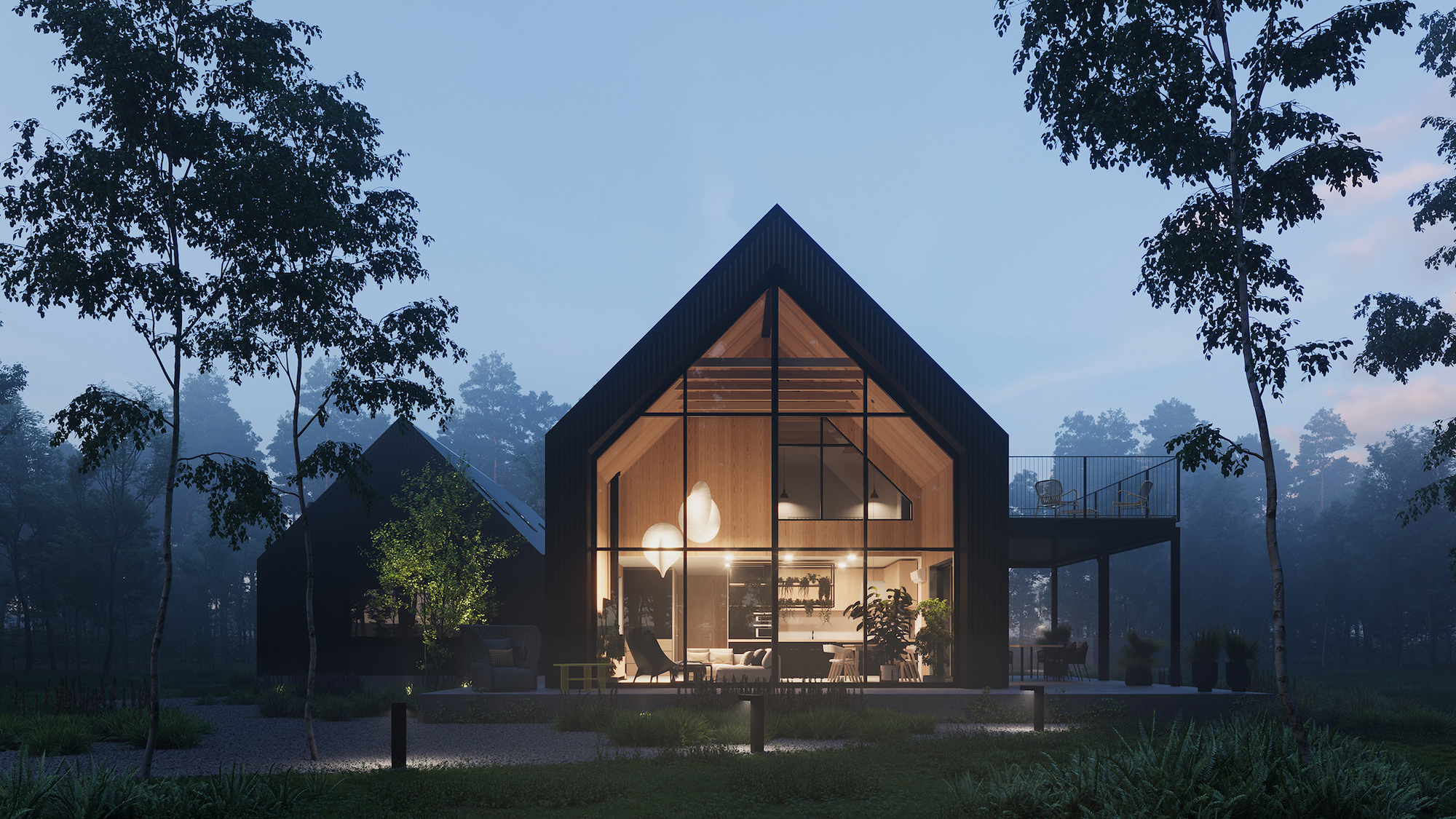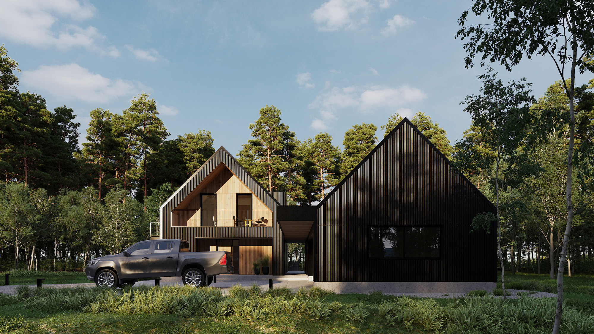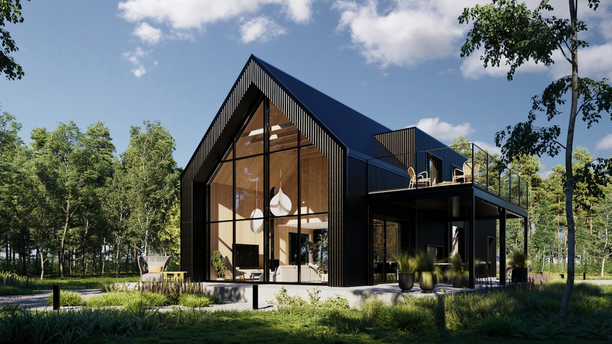 Dominantą projektu jest imponujące przeszklenie na całej ścianie szczytowej bryły mieszkalnej od strony lasu. Dzięki temu rozwiązaniu wnętrza przenikają się z otaczającą zielenią, tworząc płynne połączenie między domem a przyrodą. Dodatkowo zaprojektowano przestronne tarasy, w tym jeden nadwieszony, wsparty na stalowych słupach, dostępny bezpośrednio z głównej sypialni na piętrze. Na uwagę zasługują także dwie symetrycznie rozmieszczone lukarny w dachu, które zwiększają funkcjonalność poddasza i zapewniają naturalne doświetlenie wnętrz.