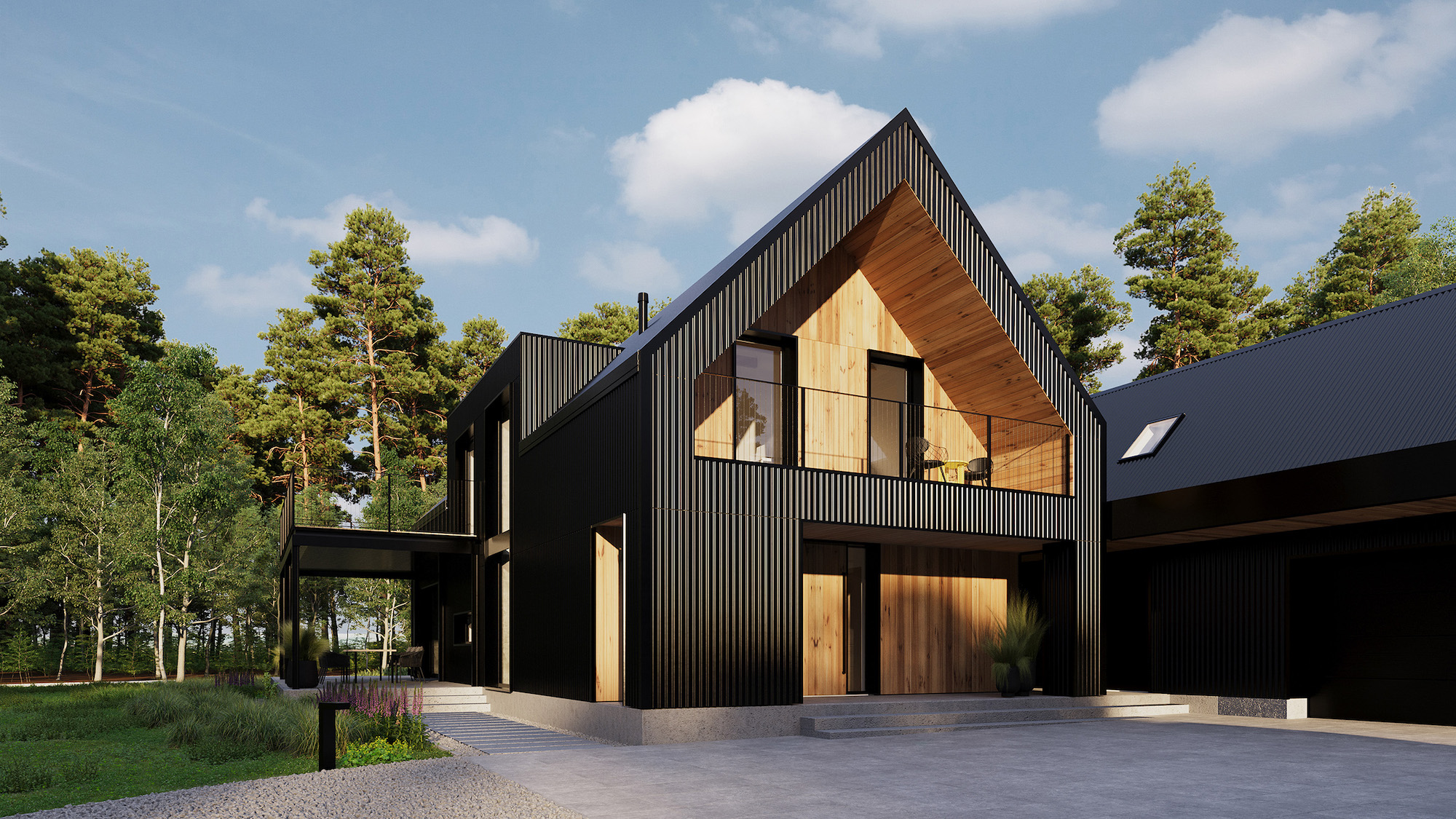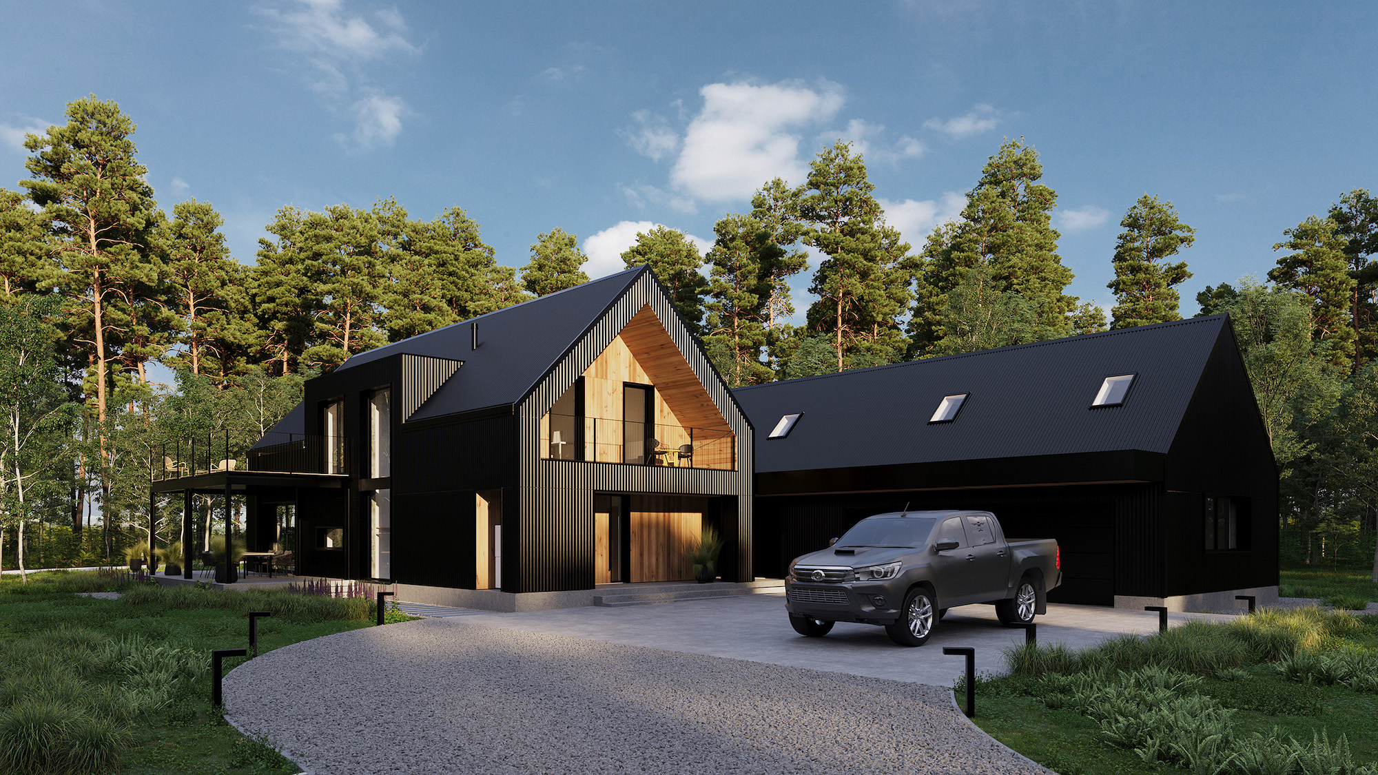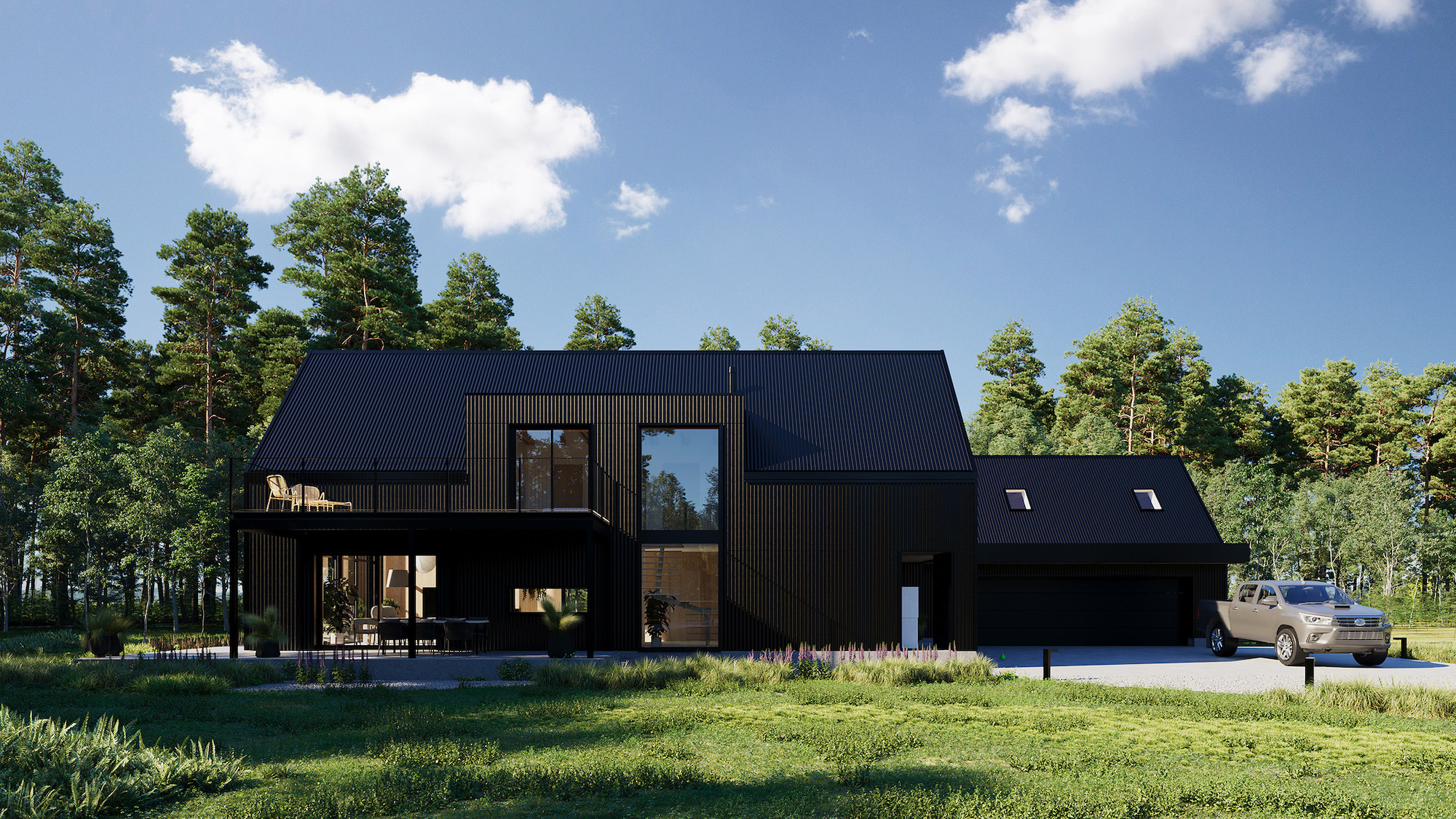 Dominantą projektu jest imponujące przeszklenie na całej ścianie szczytowej bryły mieszkalnej od strony lasu. Dzięki temu rozwiązaniu wnętrza przenikają się z otaczającą zielenią, tworząc płynne połączenie między domem a przyrodą. Dodatkowo zaprojektowano przestronne tarasy, w tym jeden nadwieszony, wsparty na stalowych słupach, dostępny bezpośrednio z głównej sypialni na piętrze. Na uwagę zasługują także dwie symetrycznie rozmieszczone lukarny w dachu, które zwiększają funkcjonalność poddasza i zapewniają naturalne doświetlenie wnętrz.