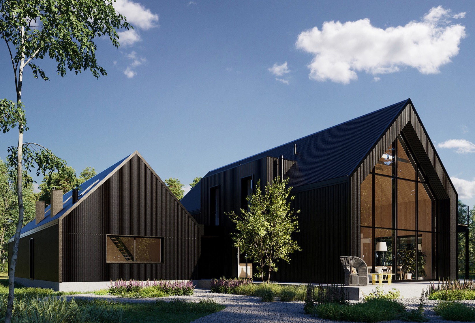 Nowoczesne czarne stodoły w sąsiedztwie lasu to doskonały przykład architektury zrównoważonej, opartej na poszanowaniu środowiska i efektywnym wykorzystaniu energii. Dom jest wyposażony we własne ujęcie wody oraz ekologiczną oczyszczalnię ścieków. Dzięki panelom fotowoltaicznym i bankom energii, budynek jest w dużej mierze samowystarczalny energetycznie, zużywając dokładnie tyle energii, ile potrzebuje, a nadmiar magazynując. Projekt zakłada także inteligentne zarządzanie energią i ochronę przed przegrzewaniem, co dodatkowo zwiększa efektywność energetyczną obiektów.